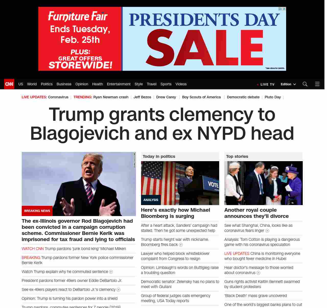 || banner-text–natural”> Trump commutes Blagojevich’s sentence and pardons others ||” , title: “CNN – Breaking News, Latest News and Videos” , siblings: {“articleList”:[{“uri”:”/2020/02/18/politics/bernie-kerik-trump-pardon/index.html”,”headline”:”Trump pardons former New York police commissioner”,”thumbnail”:”//cdn.cnn.com/cnnnext/dam/assets/190930154134-03-trump-0930-small-11.jpg”,”duration”:””,”description”:”President Donald Trump has pardoned former New York police commissioner Bernie Kerik, he announced at Joint Base Andrews on Tuesday.”,”layout”:””