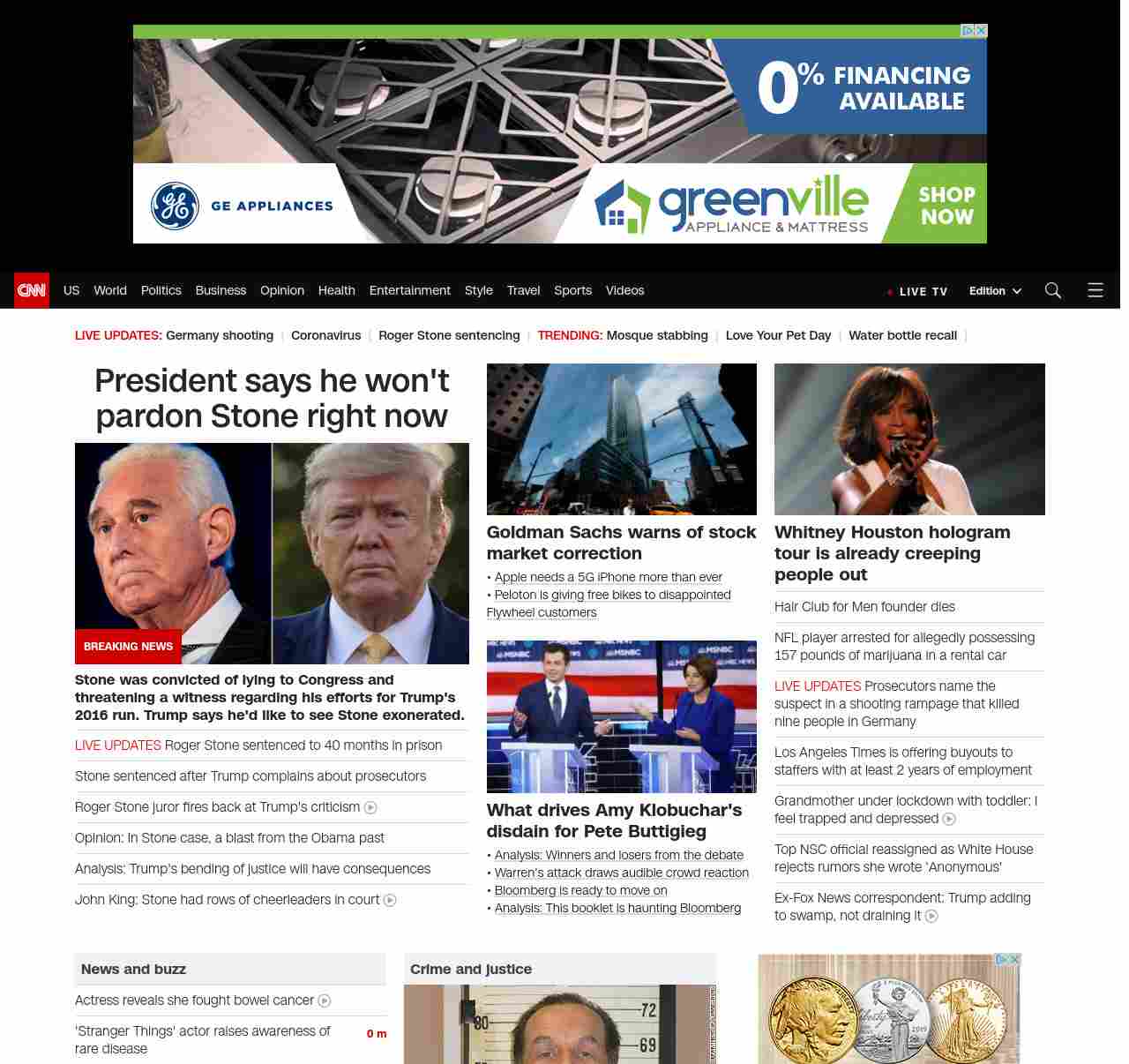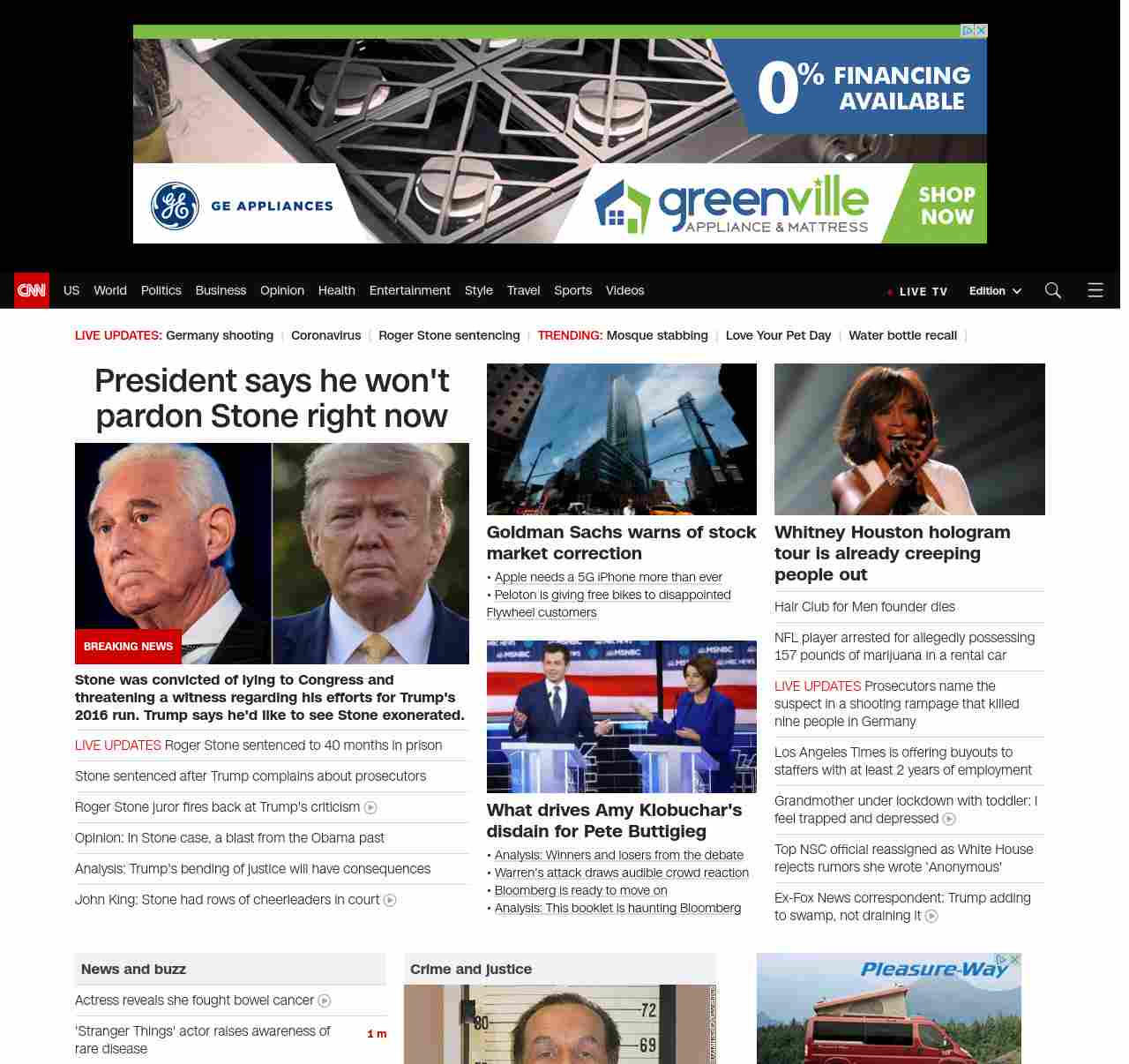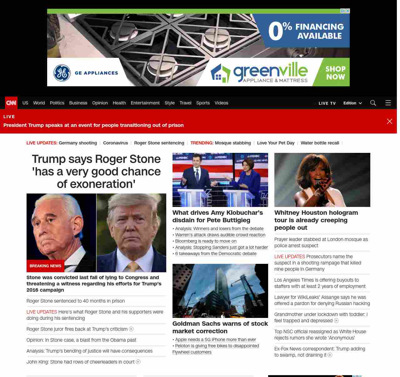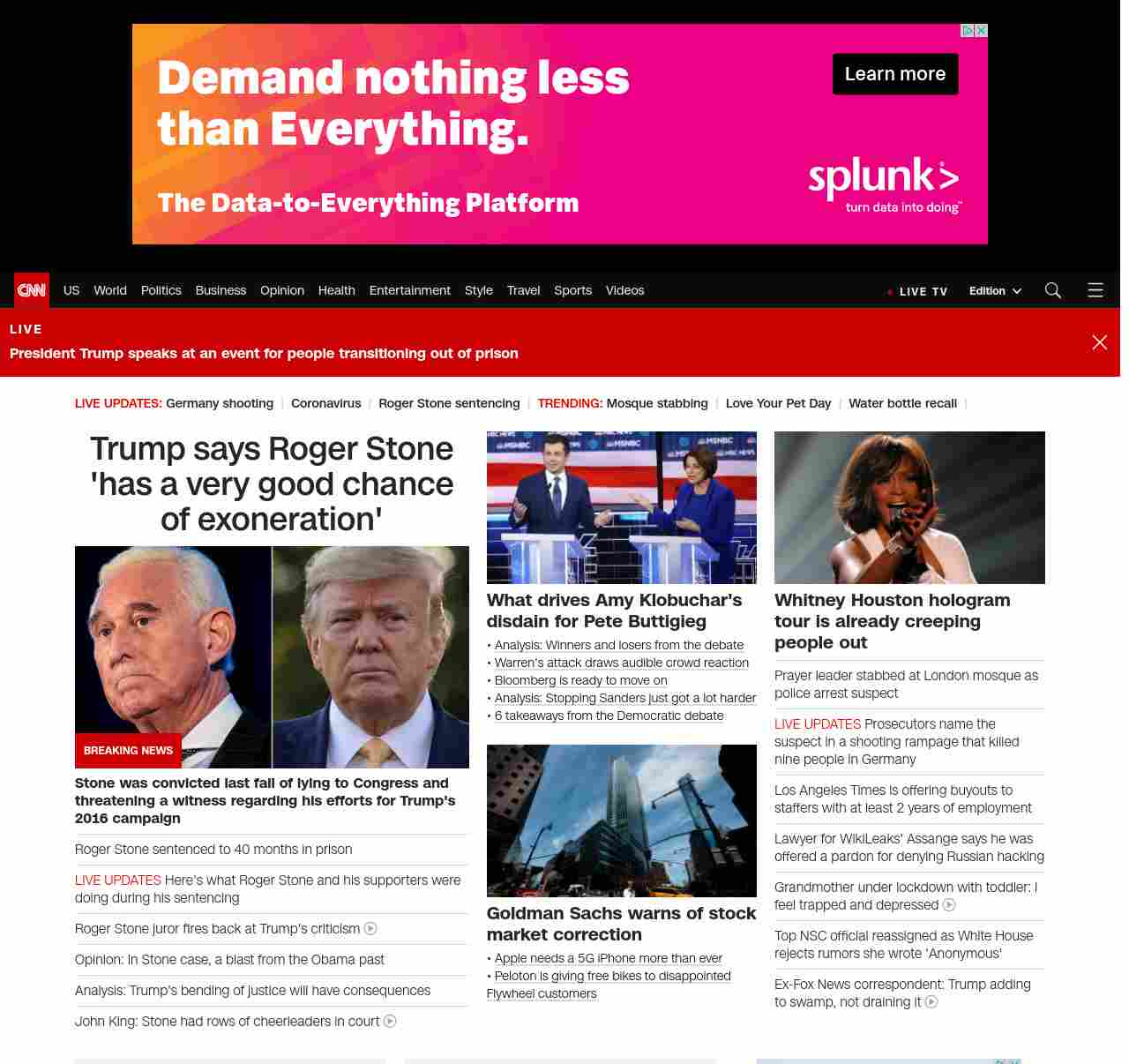 || screaming-banner-text banner-text-size–char-47″ data-analytics=”_list-hierarchical-xs_article_”> Trump says Roger Stone ‘has a very good chance of exoneration’ ||” , title: “CNN – Breaking News, Latest News and Videos” , siblings: {“articleList”:[{“uri”:”/2020/02/20/politics/donald-trump-roger-stone-exoneration/index.html”,”headline”:”u003cstrong>Stone was convicted last fall of lying to Congress and threatening a witness regarding his efforts for Trump’s 2016 campaignu003c/strong>”,”thumbnail”:”//cdn.cnn.com/cnnnext/dam/assets/200220125342-trump-stone-unhappy-split-small-11.jpg”,”duration”:””,”description”:”u003cstrong>⢠u003c/strong>u003ca href=”https://www.cnn.com/politics/live-news/roger-stone-sentencing/index.html” target=”_blank”>u003cstrong>Live updates: u003c/strong>Roger Stone sentenced to prisonu003c/a>u003cbr />â¢u003ca href=”https://www.cnn.com/videos/politics/2020/02/20/roger-stone-juror-seth-cousins-sot-vpx-cuomo-cpt.cnn” target=”_blank”> Watch: Roger Stone juror fires back at Trump’s criticismu003c/a>u003cbr />⢠u003ca href=”https://www.cnn.com/2020/02/19/opinions/stone-barr-doj-opinion-zeldin/index.html” target=”_blank”>Opinion: In Stone case, a blast from the Obama pastu003c/a>u003cbr />⢠u003ca href=”https://www.cnn.com/2020/02/20/politics/trump-department-of-justice-william-barr/index.html” target=”_blank”>Analysis: Trump’s bending of justice will have consequencesu003c/a>”,”layout”:””
