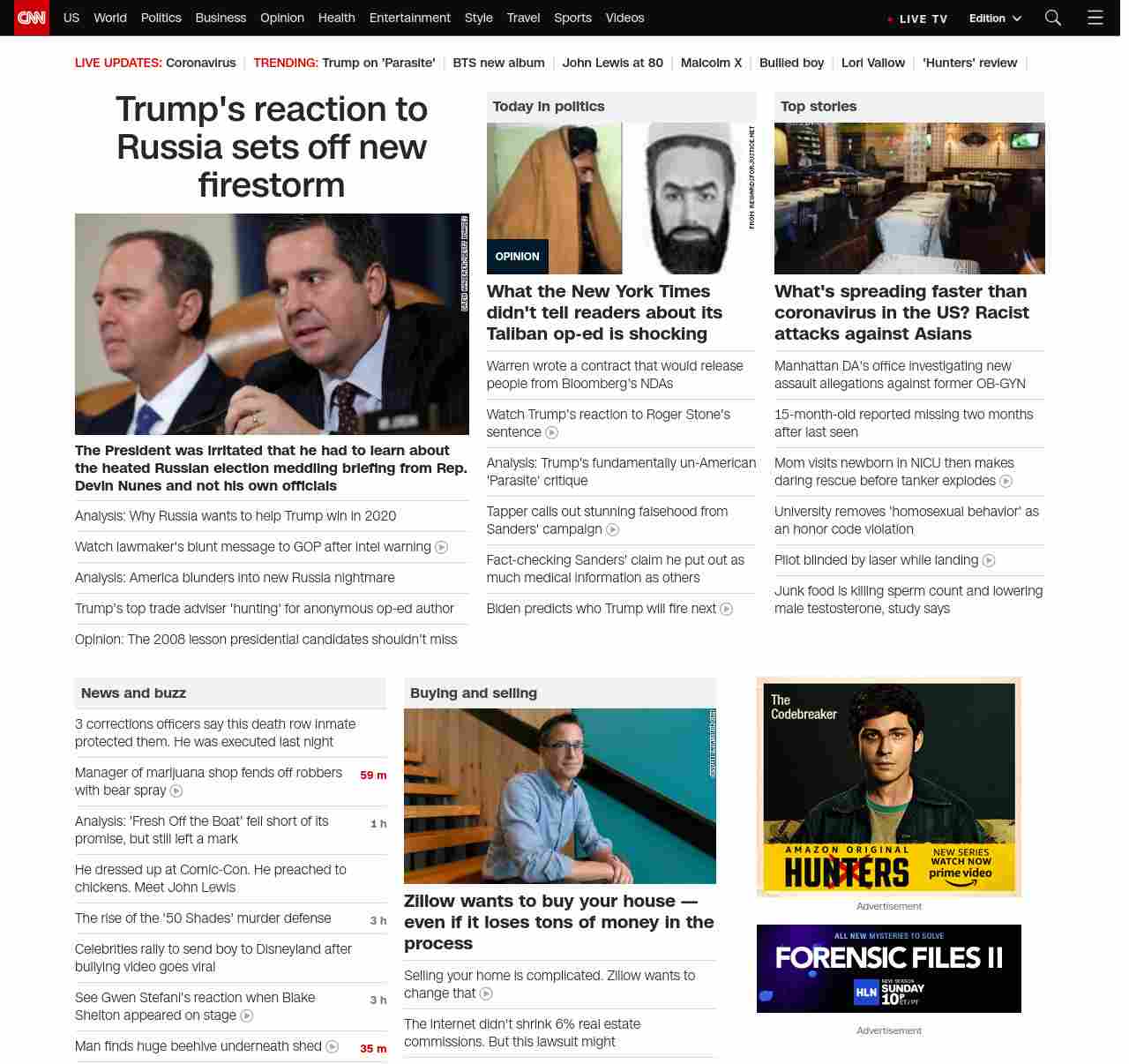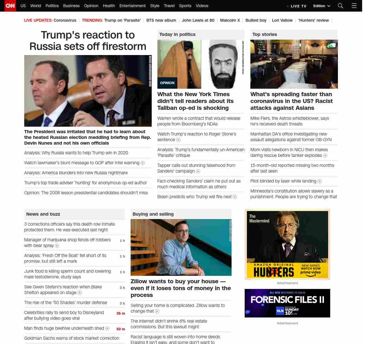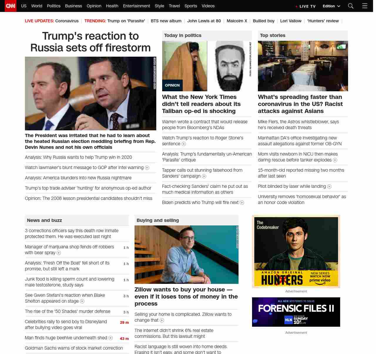 || screaming-banner-text banner-text-size–char-41″ data-analytics=”_list-hierarchical-xs_article_”> Trump’s reaction to Russia sets off new firestorm ||” , title: “CNN – Breaking News, Latest News and Videos” , siblings: {“articleList”:[{“uri”:”/2020/02/21/europe/putin-trump-2020-election-analysis-intl/index.html”,”headline”:”u003cstrong>The President’s response to Russia investigations plays into Putin’s strategy and stokes mistrust of governmentu003c/strong>”,”thumbnail”:”//cdn.cnn.com/cnnnext/dam/assets/191230193403-putin-trump-file-new-small-11.jpg”,”duration”:””,”description”:”It’s a familiar plot line: Top intelligence officials deliver a warning to lawmakers that Russia wants to interfere in the upcoming presidential election — and that the Kremlin’s u003ca href=”https://edition.cnn.com/2020/02/20/politics/trump-russia-intelligence-2020/index.html” target=”_blank”>preferred outcome is a win by President Donald Trumpu003c/a>.”,”layout”:””