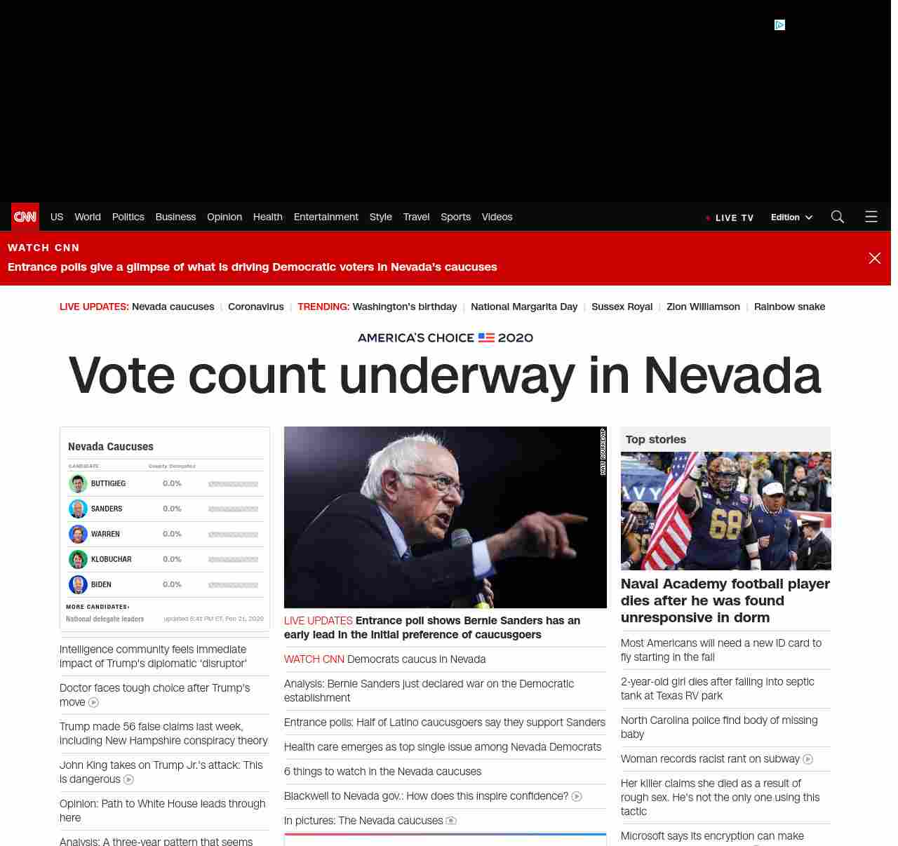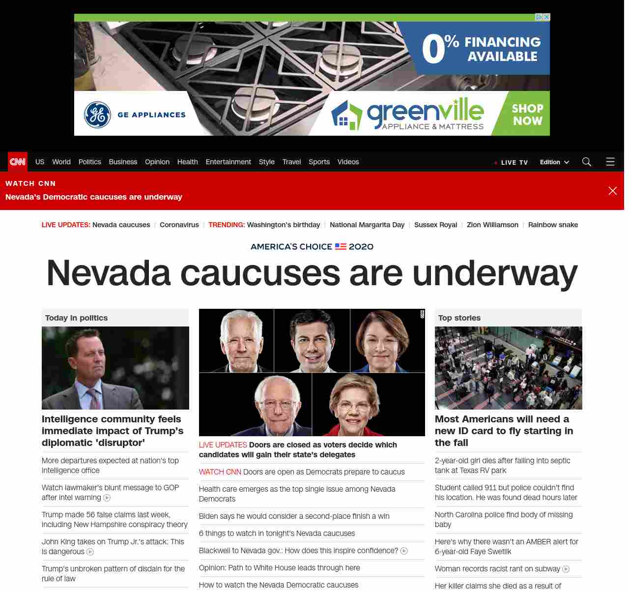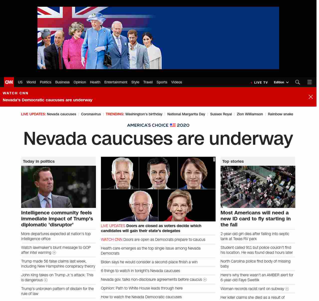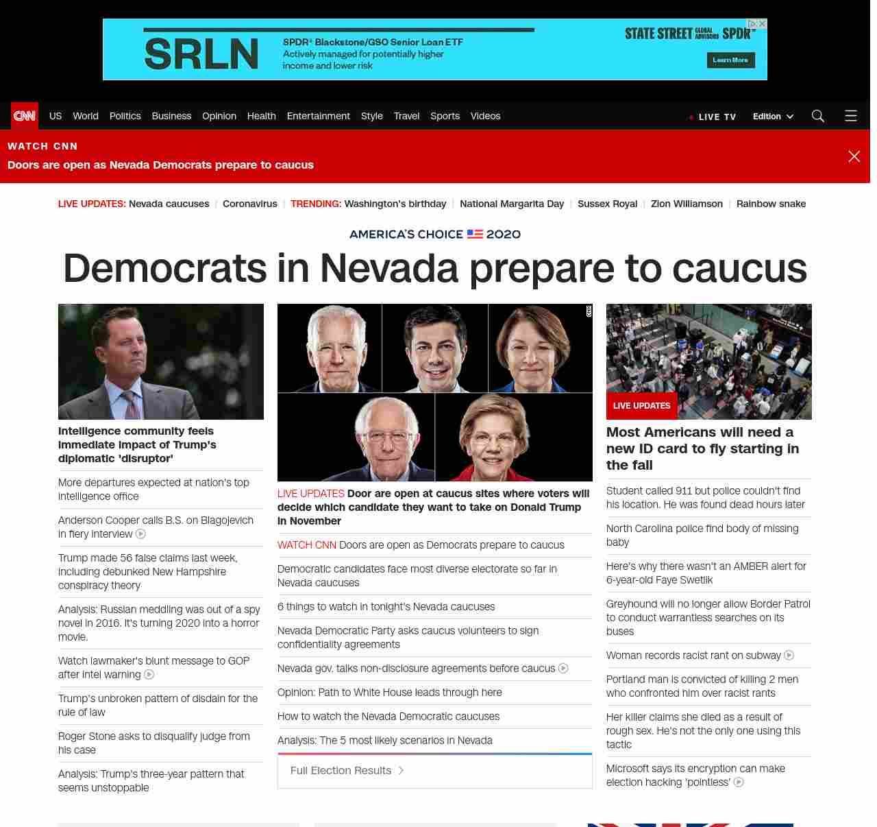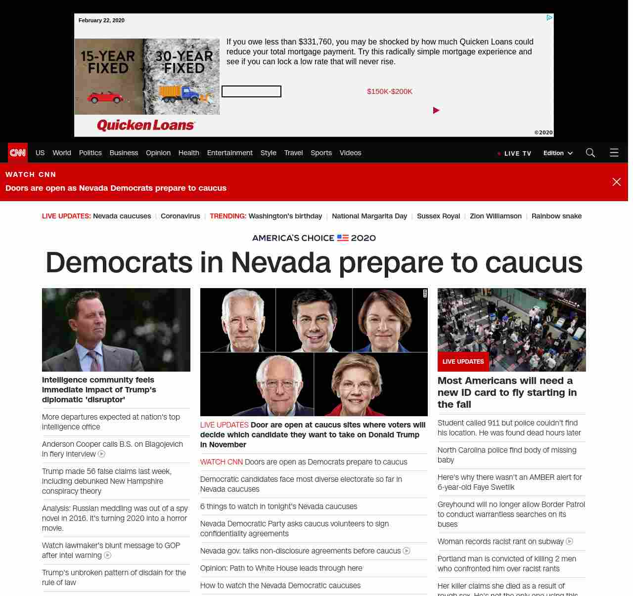 || banner-text–maximized banner-text-size–char-38″> Democrats in Nevada prepare to caucus ||” , title: “CNN – Breaking News, Latest News and Videos” , siblings: {“articleList”:[{“uri”:”/2020/02/22/politics/grenell-impact-diplomatic-community/index.html”,”headline”:”Intelligence community feels immediate impact of Trump’s diplomatic ‘disruptor'”,”thumbnail”:”//cdn.cnn.com/cnnnext/dam/assets/200221154039-02-richard-grenell-file-small-11.jpg”,”duration”:””,”description”:”Richard Grenell, the u003ca href=”https://www.cnn.com/2020/02/19/politics/trump-grennell-acting-dni/index.html” target=”_blank”>newly installedu003c/a> acting director of American spy agencies and loyalist to President Donald Trump, began his temporary tenure by moving aggressively to put his stamp on the intelligence community that Trump has repeatedly attacked. “,”layout”:””
