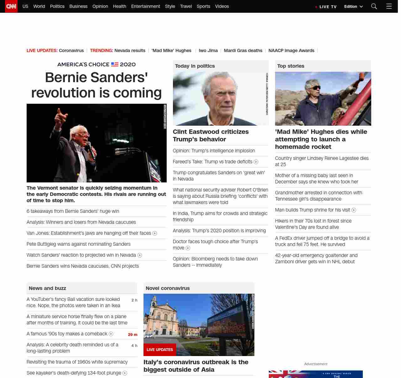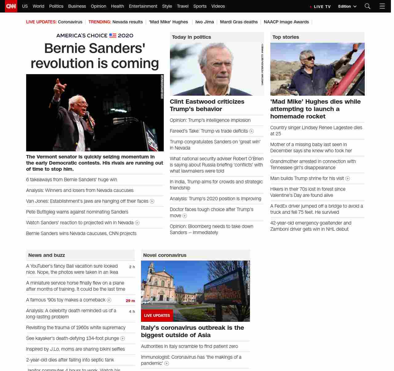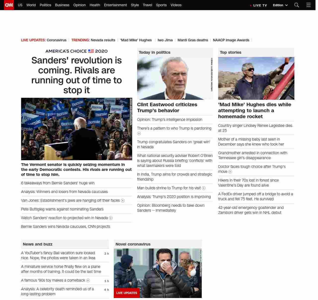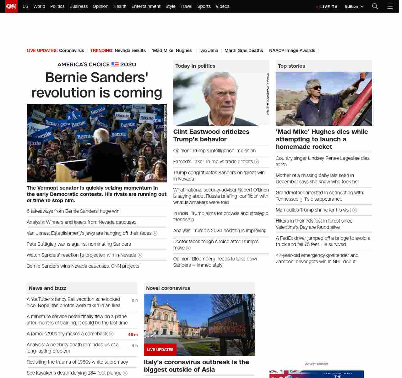 || screaming-banner-text banner-text-size–char-38″ data-analytics=”_list-hierarchical-xs_article_”> Bernie Sanders’ revolution is coming ||” , title: “CNN – Breaking News, Latest News and Videos” , siblings: {“articleList”:[{“uri”:”/2020/02/23/politics/bernie-sanders-revolution-nevada/index.html”,”headline”:”u003cstrong>The Vermont senator is quickly seizing momentum in the early Democratic contests. His rivals are running out of time to stop him.u003c/strong>”,”thumbnail”:”//cdn.cnn.com/cnnnext/dam/assets/200222185747-03-bernie-sanders-0222-small-11.jpg”,”duration”:””,”description”:”u003ca href=”https://www.cnn.com/election/2020/candidate/sanders” target=”_blank”>Bernie Sandersu003c/a> left Las Vegas on Saturday morning in a light drizzle. By the time he arrived in San Antonio hours later, his path to the u003ca href=”https://www.cnn.com/election/2020/primaries-and-caucuses” target=”_blank”>Democratic nominationu003c/a> seemed as big and clear as the Texas sky.”,”layout”:””