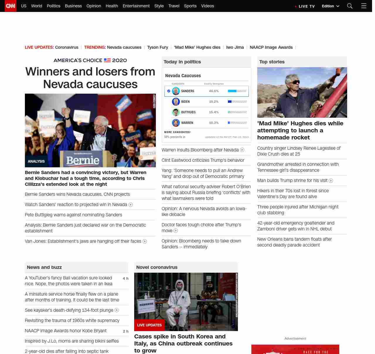 || screaming-banner-text banner-text-size–char-41″ data-analytics=”_list-hierarchical-xs_article_”> Winners and losers from Nevada caucuses ||” , title: “CNN – Breaking News, Latest News and Videos” , siblings: {“articleList”:[{“uri”:”/2020/02/22/politics/who-won-nevada-caucuses/index.html”,”headline”:”u003cstrong>Bernie Sanders had a convincing victory, but Warren and Klobuchar had a tough time, according to Chris Cillizza’s extended look at the nightu003c/strong>”,”thumbnail”:”//cdn.cnn.com/cnnnext/dam/assets/200222203248-05-bernie-sanders-san-antonio-0222-small-11.jpg”,”duration”:””,”description”:”Theu003ca href=”https://www.cnn.com/election/2020/state/nevada?xid=ec_crm_nv_d” target=”_blank”> Nevada caucusesu003c/a> — the third vote of the 2020 Democratic nomination fight — are over. “,”layout”:””