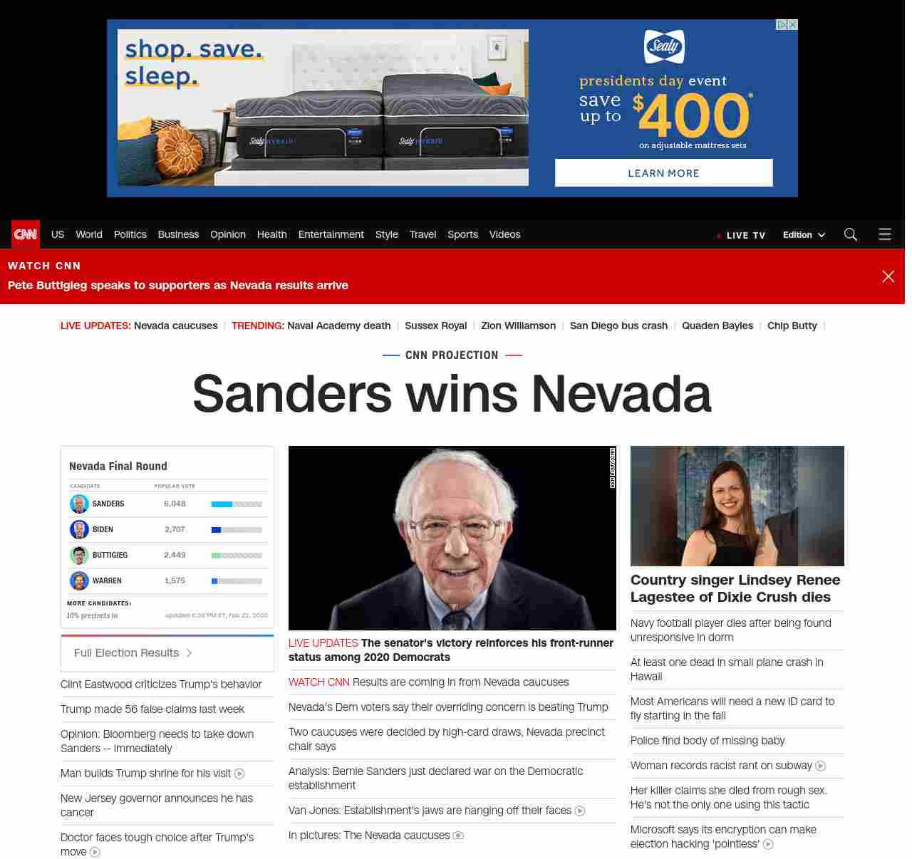 || banner-text–maximized banner-text-size–char-20″> Sanders wins Nevada ||” , title: “CNN – Breaking News, Latest News and Videos” , siblings: {“articleList”:[{“uri”:”/politics/live-news/nevada-caucuses-live-results-updates-2020/index.html”,”headline”:”u003cstrong>The senator’s victory reinforces his front-runner status among 2020 Democratsu003c/strong>”,”thumbnail”:”//cdn.cnn.com/cnnnext/dam/assets/200222202941-02-bernie-speaks-0222-screengrab-small-11.jpg”,”duration”:””,”description”:””,”layout”:””