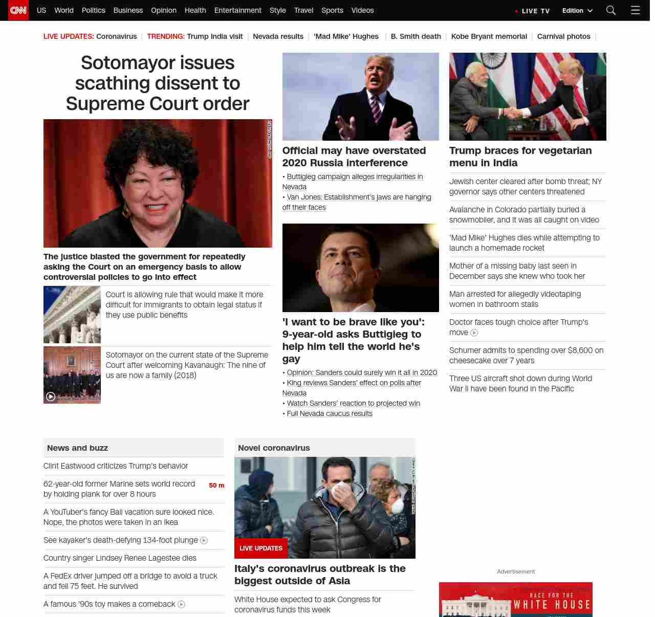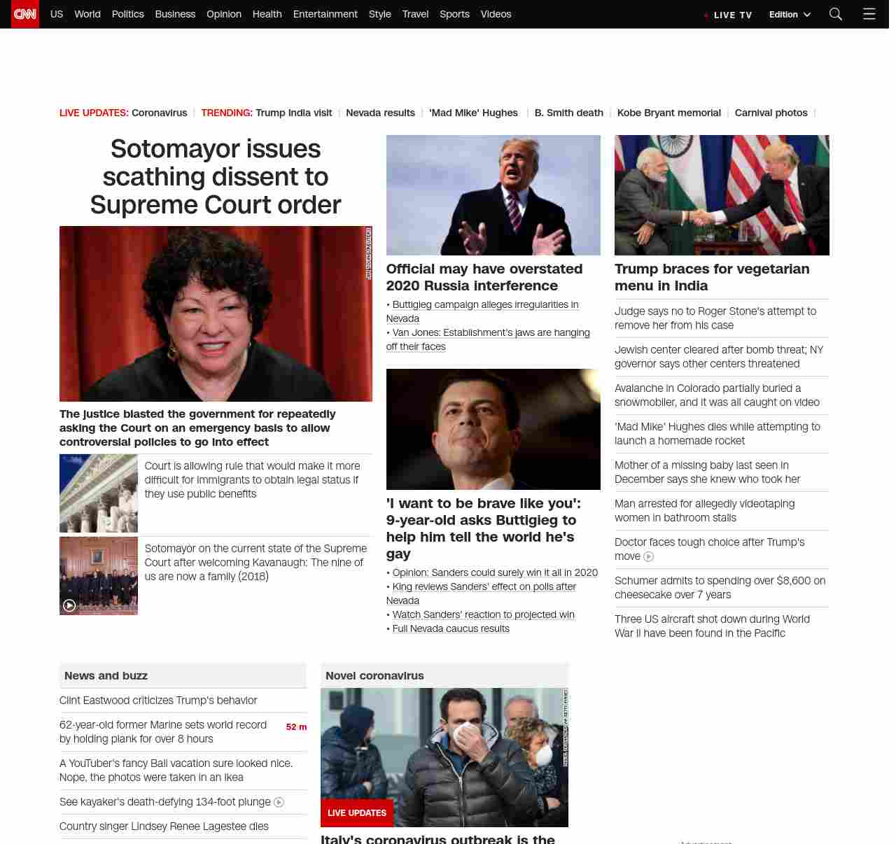 || screaming-banner-text banner-text-size–char-47″ data-analytics=”_list-hierarchical-small-horizontal_article_”> Sotomayor issues scathing dissent to Supreme Court order ||” , title: “CNN – Breaking News, Latest News and Videos” , siblings: {“articleList”:[{“uri”:”/2020/02/23/politics/sotomayor-dissent-supreme-court/index.html”,”headline”:”u003cstrong>The justice blasted the government for repeatedly asking the Court on an emergency basis to allow controversial policies to go into effectu003c/strong>”,”thumbnail”:”//cdn.cnn.com/cnnnext/dam/assets/181130144153-01-sonia-sotomayor-file-1130-small-11.jpg”,”duration”:””,”description”:”⢠u003ca href=”http://www.cnn.com/2020/02/21/politics/supreme-court-public-charge-rule/index.html” target=”_blank”>Supreme Court allows rule to take effect that could reshape legal immigrationu003c/a>u003cbr />⢠u003ca href=”http://www.cnn.com/video/data/2.0/video/politics/2018/11/18/sonia-sotomayor-court-family-kavanaugh-sot-axe-files-vpx.cnn.html” target=”_blank”>Sotomayor: The 9 of us are now a family (2018)u003c/a>”,”layout”:””