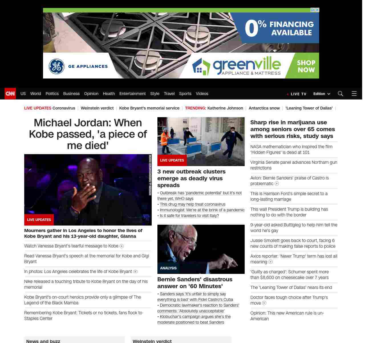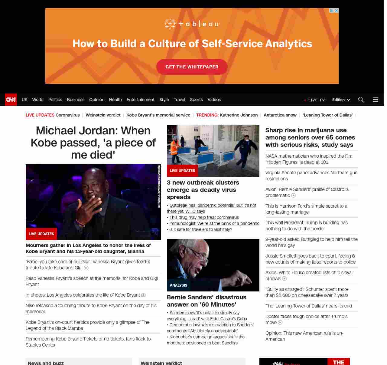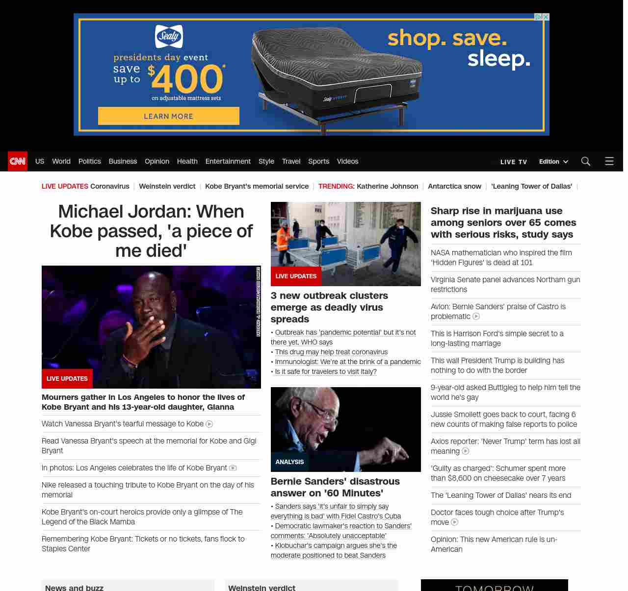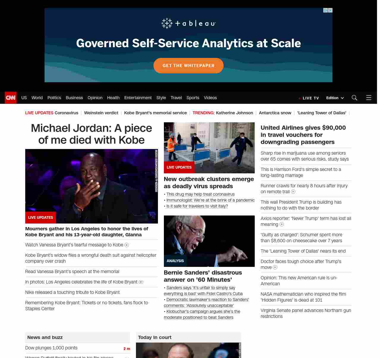 || screaming-banner-text banner-text-size–char-47″ data-analytics=”_list-hierarchical-xs_article_”> Michael Jordan: When Kobe passed, ‘a piece of me died’ ||” , title: “CNN – Breaking News, Latest News and Videos” , siblings: {“articleList”:[{“uri”:”/us/live-news/kobe-bryant-memorial/index.html”,”headline”:”u003cstrong>Mourners gather in Los Angeles to honor the lives of Kobe Bryant and his 13-year-old daughter, Giannau003c/strong>”,”thumbnail”:”//cdn.cnn.com/cnnnext/dam/assets/200224151613-14-kobe-bryant-memorial-small-11.jpg”,”duration”:””,”description”:”⢠u003ca href=”https://www.cnn.com/2020/02/24/us/kobe-bryant-memorial-vanessa-bryant-statement-trnd/index.html” target=”_blank”>Read Vanessa Bryant’s speech at the memorial for Kobe and Gigi Bryantu003c/a>u003cbr />⢠u003ca href=”https://www.cnn.com/2020/02/24/us/kobe-bryant-memorial-monday-staples-center/index.html” target=”_blank”>Remembering Kobe Bryant: Tickets or no tickets, fans flock to Staples Centeru003c/a>u003cbr />⢠u003ca href=”https://go.cnn.com/?stream=cnn” target=”_blank”>WATCH CNN: Memorial service underwayu003c/a>”,”layout”:””