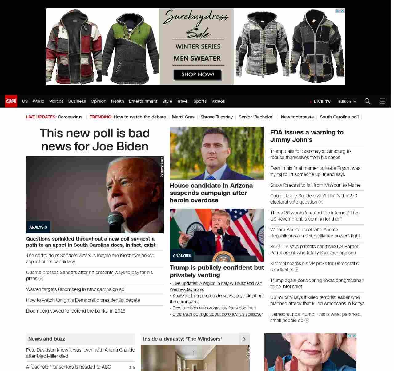 || screaming-banner-text banner-text-size–char-41″ data-analytics=”_list-hierarchical-xs_article_”> This new poll is bad news for Joe Biden ||” , title: “CNN – Breaking News, Latest News and Videos” , siblings: {“articleList”:[{“uri”:”/2020/02/25/politics/joe-biden-south-carolina-poll-bernie-sanders/index.html”,”headline”:”u003cstrong>Questions sprinkled throughout a new poll suggest a path to an upset in South Carolina does, in fact, existu003c/strong>”,”thumbnail”:”//cdn.cnn.com/cnnnext/dam/assets/200219121659-lead-image-01-joe-biden-nevada-0216-small-11.jpg”,”duration”:””,”description”:”⢠u003ca href=”https://www.cnn.com/2020/02/25/politics/bernie-sanders-supporters/index.html” target=”_blank”>Why Bernie Sanders’ supporters are loyal to himu003c/a>u003cbr />â¢u003ca href=”https://www.cnn.com/2020/02/25/politics/south-carolina-debate-tonight/index.html” target=”_blank”> Is Bernie Sanders ready for what’s coming his way during tonight’s debate?u003c/a>u003cbr />⢠u003ca href=”https://www.cnn.com/2020/02/24/politics/kfile-bloomberg-called-warren-scary-and-defended-banks/index.html” target=”_blank”>KFILE: Bloomberg called Warren ‘scary’ and vowed to ‘defend the banks’ in 2016u003c/a>u003cbr />⢠u003ca href=”https://www.cnn.com/2020/02/25/politics/how-to-watch-democratic-debate/index.html” target=”_blank”>How to watch tonight’s Democratic debateu003c/a>”,”layout”:””