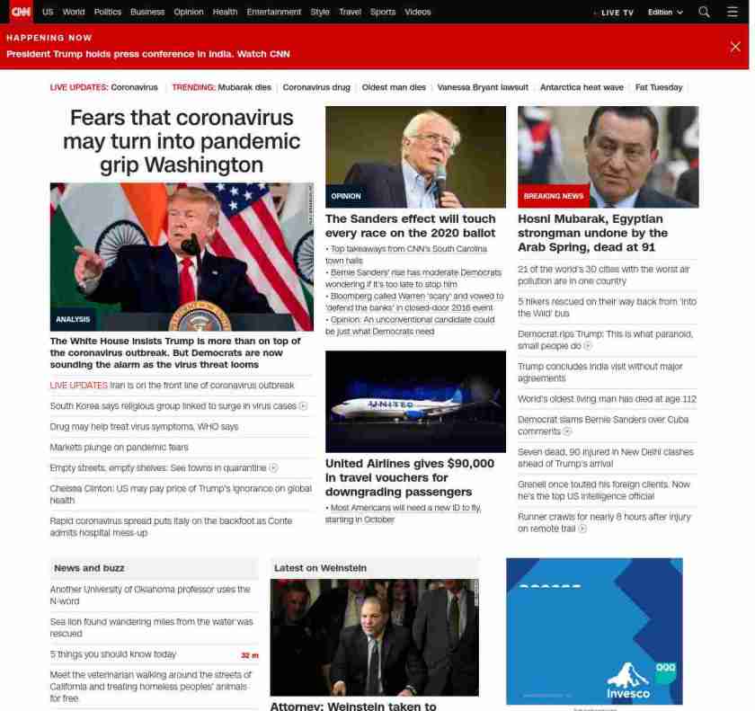 || screaming-banner-text banner-text-size–char-47″ data-analytics=”_list-hierarchical-xs_article_”> Fears that coronavirus may turn into pandemic grip Washington ||” , title: “CNN – Breaking News, Latest News and Videos” , siblings: {“articleList”:[{“uri”:”/2020/02/25/politics/coronavirus-us-donald-trump-washington-politics/index.html”,”headline”:”u003cstrong>The White House insists Trump is more than on top of the coronavirus outbreak. But Democrats are now sounding the alarm as the virus threat loomsu003c/strong>”,”thumbnail”:”//cdn.cnn.com/cnnnext/dam/assets/200225114934-11-trump-india-0225-roundtable-small-11.jpg”,”duration”:””,”description”:”Growing fears that the u003ca href=”https://www.cnn.com/2020/02/24/health/coronavirus-outbreak-pandemic-who-bn/index.html” target=”_blank”>coronavirus outbreak could turn into a pandemicu003c/a> and reach the United States are challenging President Donald Trump’s sunny assurances that everything is under control.”,”layout”:””