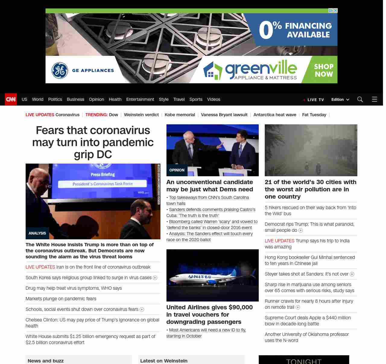 || screaming-banner-text banner-text-size–char-47″ data-analytics=”_list-hierarchical-xs_article_”> Fears that coronavirus may turn into pandemic grip DC ||” , title: “CNN – Breaking News, Latest News and Videos” , siblings: {“articleList”:[{“uri”:”/2020/02/25/politics/coronavirus-us-donald-trump-washington-politics/index.html”,”headline”:”u003cstrong>The White House insists Trump is more than on top of the coronavirus outbreak. But Democrats are now sounding the alarm as the virus threat loomsu003c/strong>”,”thumbnail”:”//cdn.cnn.com/cnnnext/dam/assets/200224161723-coronavirus-briefing-0207-small-11.jpg”,”duration”:””,”description”:”Growing fears that the u003ca href=”https://www.cnn.com/2020/02/24/health/coronavirus-outbreak-pandemic-who-bn/index.html” target=”_blank”>coronavirus outbreak could turn into a pandemicu003c/a> and reach the United States are challenging President Donald Trump’s sunny assurances that everything is under control.”,”layout”:””