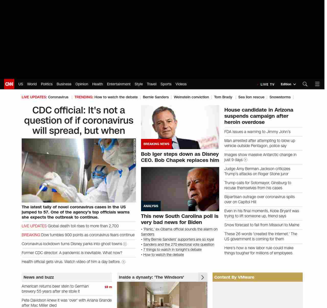 || screaming-banner-text banner-text-size–char-47″ data-analytics=”_list-hierarchical-xs_article_”> CDC official: It’s not a question of if coronavirus will spread, but when ||” , title: “CNN – Breaking News, Latest News and Videos” , siblings: {“articleList”:[{“uri”:”/2020/02/25/health/coronavirus-us-american-cases/index.html”,”headline”:”u003cstrong>The latest tally of novel coronavirus cases in the US jumped to 57. One of the agency’s top officials warns she expects the outbreak to continue.u003c/strong>”,”thumbnail”:”//cdn.cnn.com/cnnnext/dam/assets/200225032407-02-coronavirus-washington-0207-small-11.jpg”,”duration”:””,”description”:”The latest tally of u003ca href=”http://www.cnn.com/2020/02/24/business/coronavirus-global-economy/index.html” target=”_blank”>novel coronavirus casesu003c/a> in the United States has jumped to 57, according to the Centers for Disease Control and Prevention, as one of the agency’s top officials warned Tuesday that health experts expect to see the virus spread. “,”layout”:””