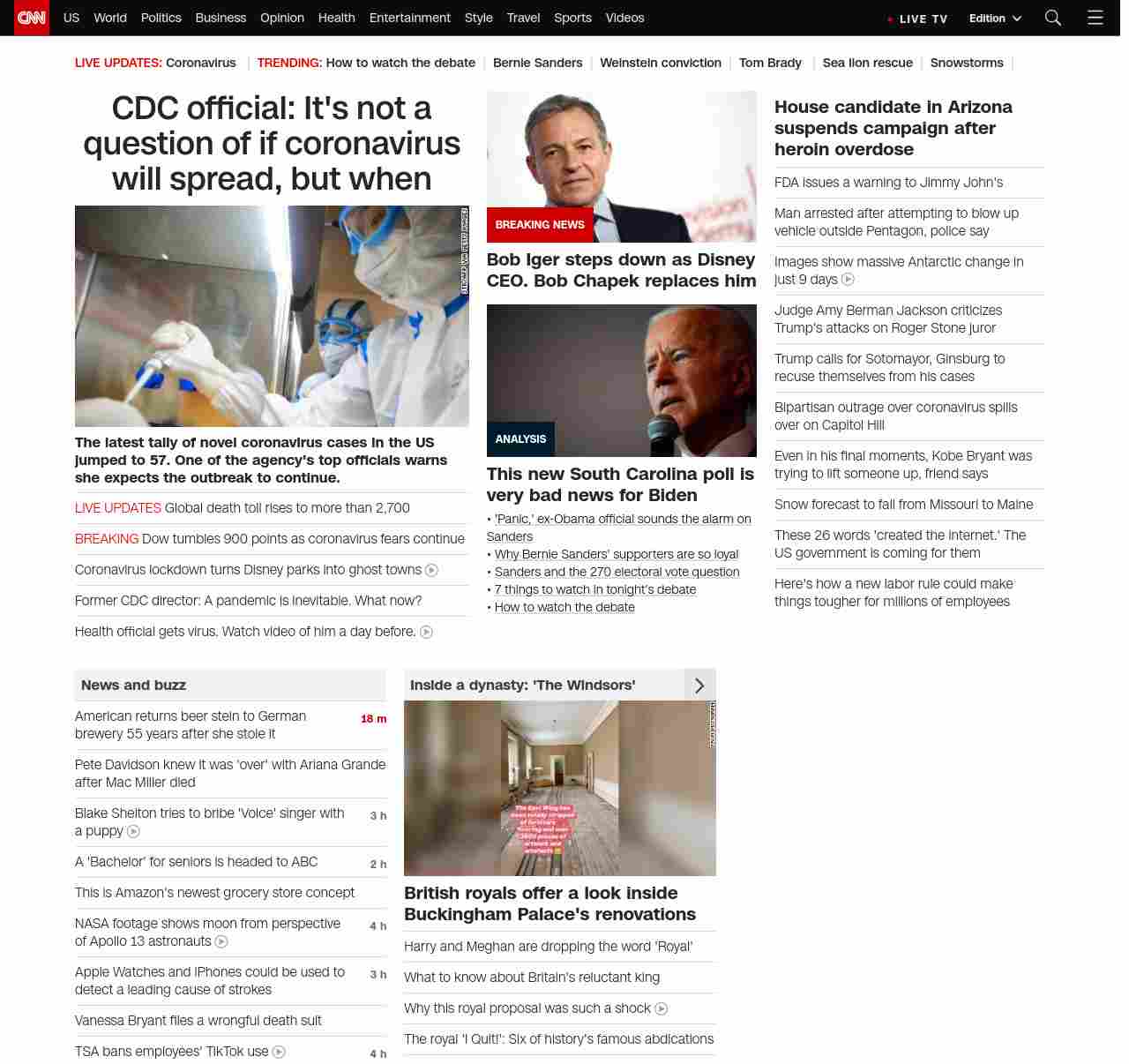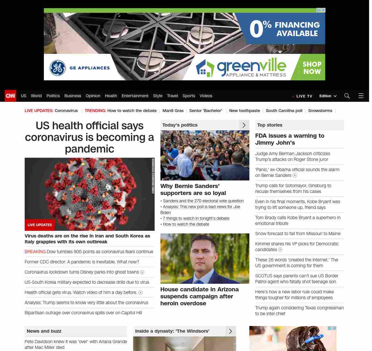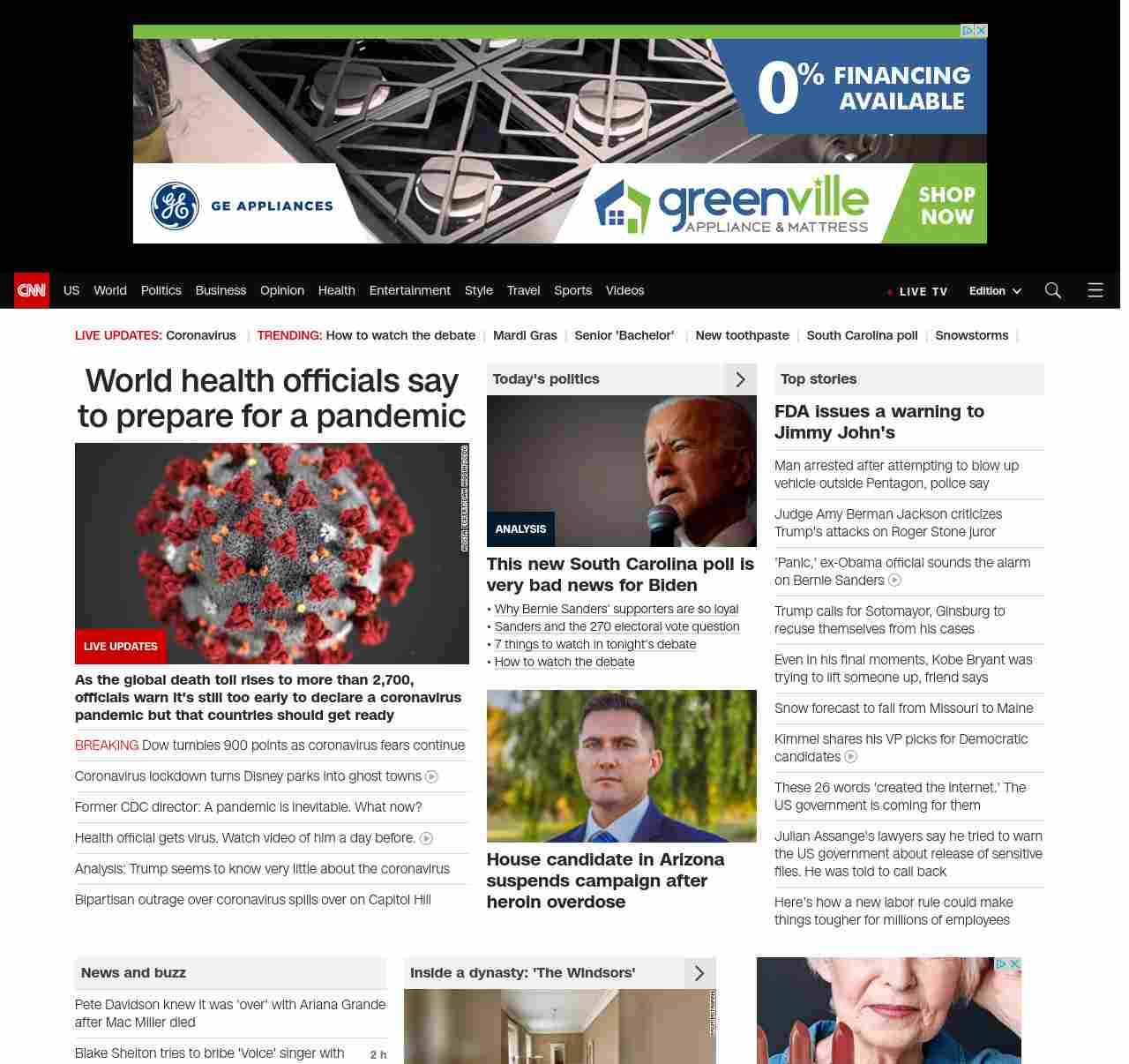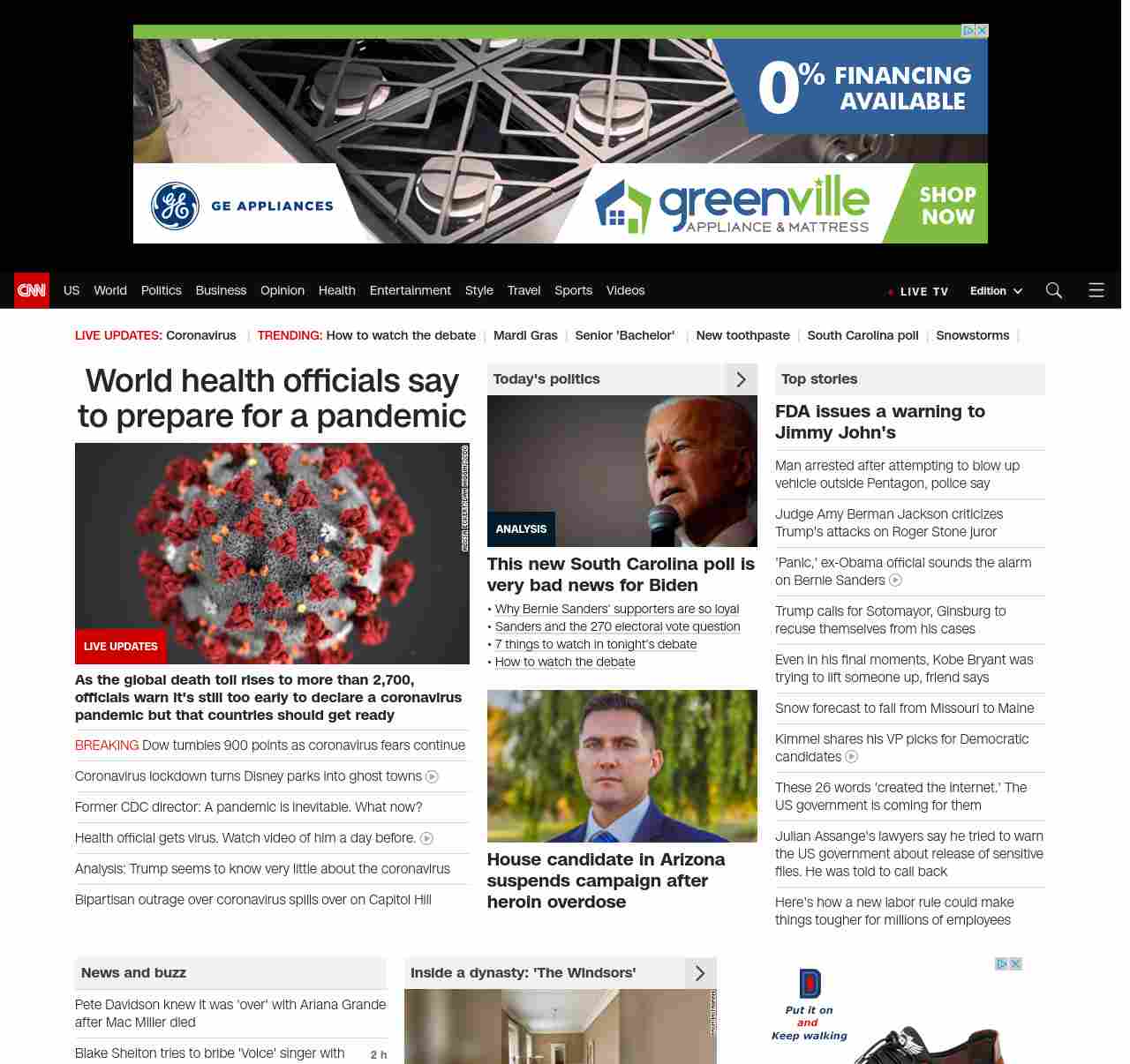 || screaming-banner-text banner-text-size–char-47″ data-analytics=”_list-hierarchical-xs_article_”> World health officials say to prepare for a pandemic ||” , title: “CNN – Breaking News, Latest News and Videos” , siblings: {“articleList”:[{“uri”:”/asia/live-news/coronavirus-outbreak-02-25-20-hnk-intl/index.html”,”headline”:”u003cstrong>As the global death toll rises to more than 2,700, officials warn it’s still too early to declare a coronavirus pandemic but that countries should get readyu003c/strong>”,”thumbnail”:”//cdn.cnn.com/cnnnext/dam/assets/200204130938-cdc-coronavirus-illustration-small-11.jpg”,”duration”:””,”description”:”⢠u003ca href=”https://www.cnn.com/2020/02/25/investing/dow-jones-stock-market/index.html” target=”_blank”>BREAKING: Dow tumbles 800 points as coronavirus fears continueu003c/a>u003cbr />⢠u003ca href=”https://www.cnn.com/2020/02/25/politics/donald-trump-coronavirus/index.html” target=”_blank”>Analysis: Trump seems to know very little about the coronavirusu003c/a>u003cbr />⢠u003ca href=”https://www.cnn.com/2020/02/25/politics/coronavirus-concern-capitol-hill/index.html” target=”_blank”>Bipartisan outrage about coronavirus spills overu003c/a>”,”layout”:””