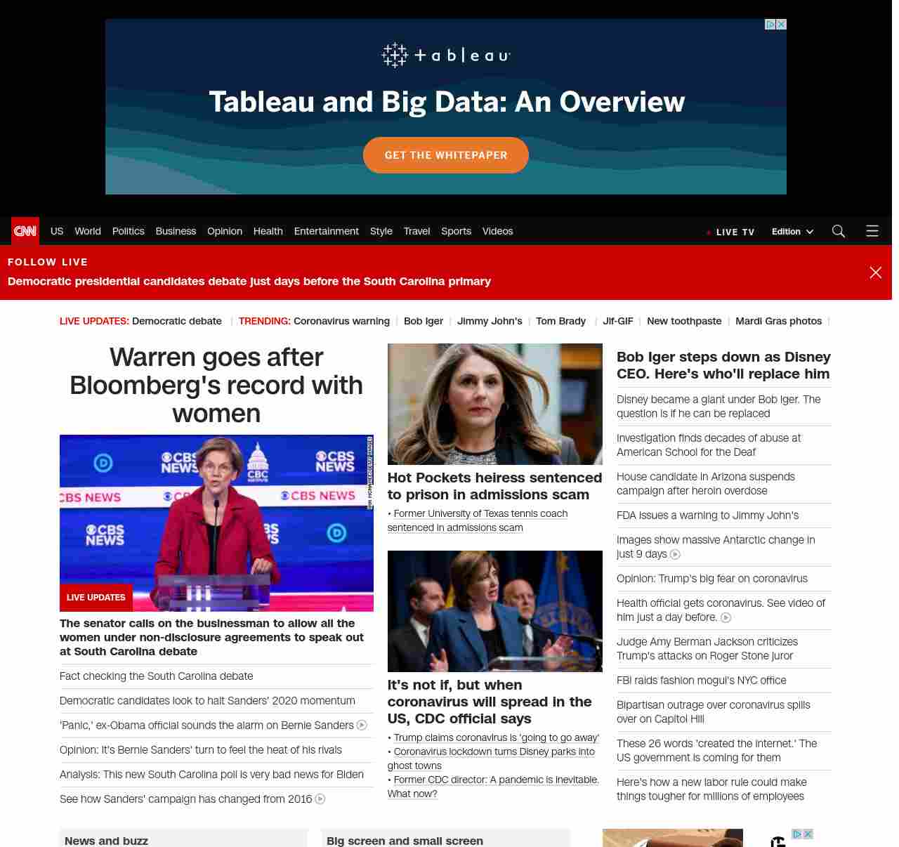 || screaming-banner-text banner-text-size–char-47″ data-analytics=”_list-hierarchical-xs_article_”> Warren goes after Bloomberg’s record with women ||” , title: “CNN – Breaking News, Latest News and Videos” , siblings: {“articleList”:[{“uri”:”/politics/live-news/2020-democratic-debate-south-carolina/index.html”,”headline”:”u003cstrong>The senator calls on the businessman to allow all the women under non-disclosure agreements to speak out at South Carolina debateu003c/strong>”,”thumbnail”:”//cdn.cnn.com/cnnnext/dam/assets/200225202317-06-cbs-news-debate-0225-warren-small-11.jpg”,”duration”:””,”description”:””,”layout”:””