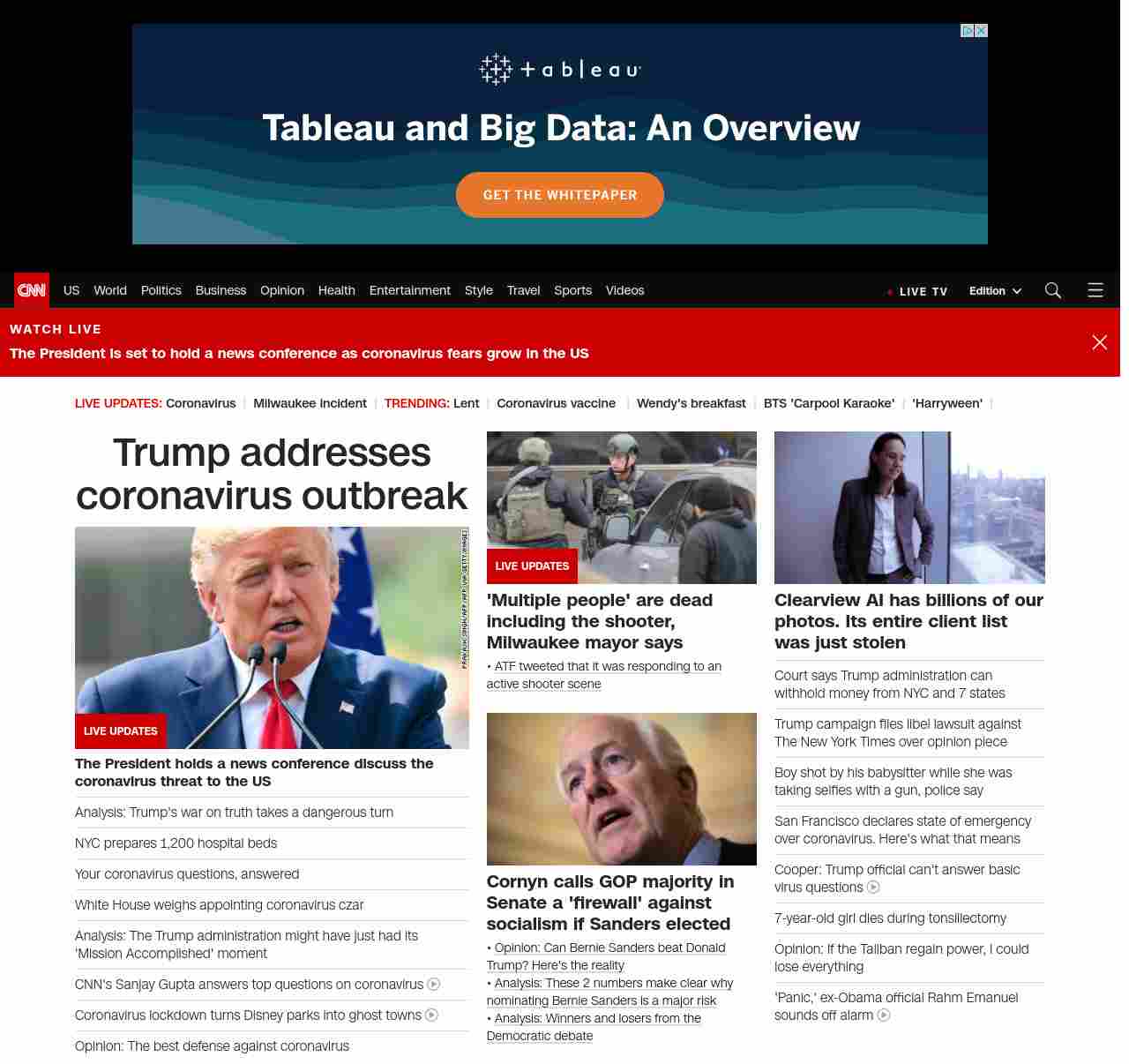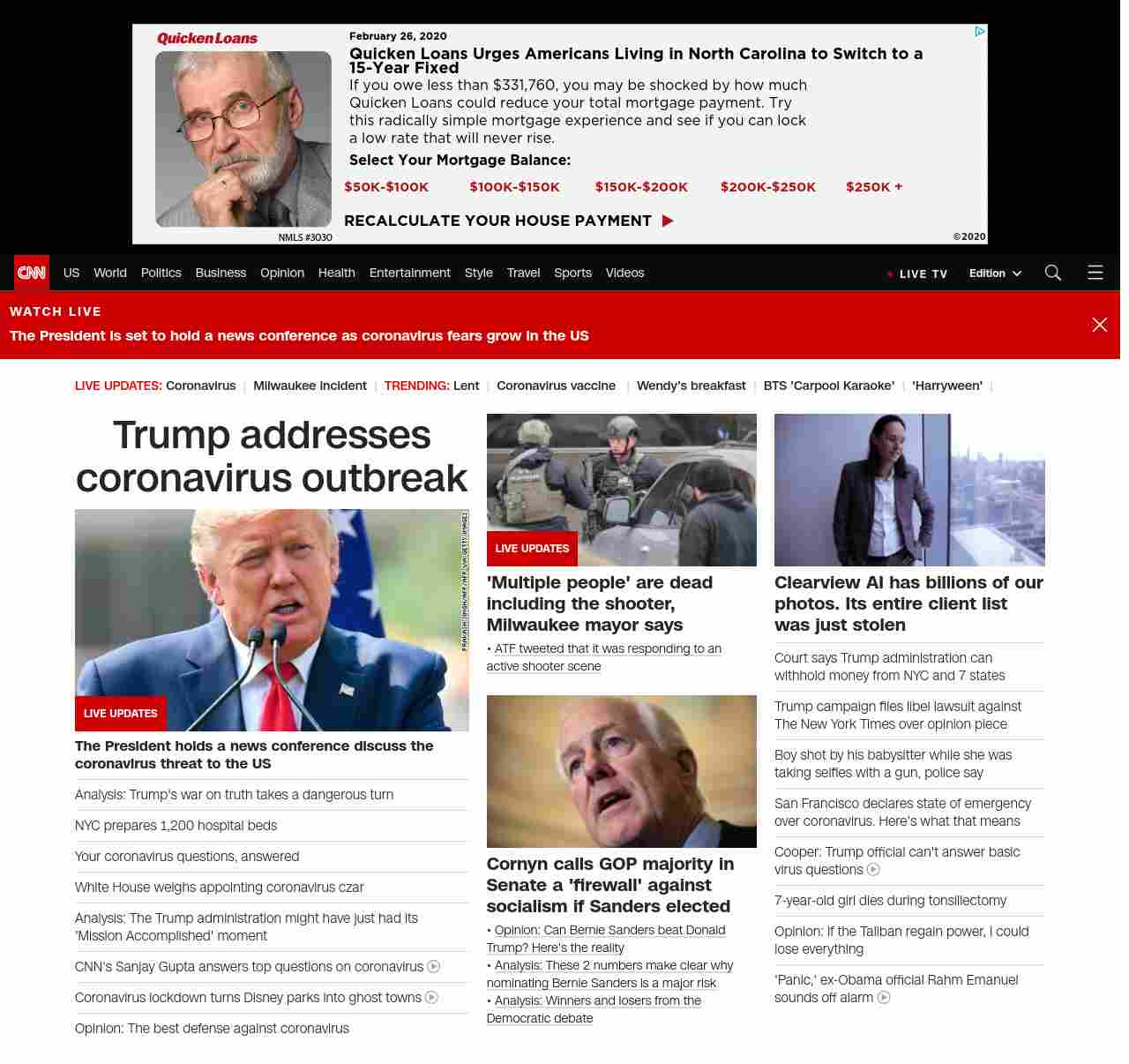 || screaming-banner-text banner-text-size–char-38″ data-analytics=”_list-hierarchical-xs_hyperlink_”> Trump addresses coronavirus outbreak ||” , title: “CNN – Breaking News, Latest News and Videos” , siblings: {“articleList”:[{“uri”:”/2020/02/26/media/trump-attacks-media-coronavirus/index.html”,”headline”:”Analysis: Trump’s war on truth takes a dangerous turn”,”thumbnail”:”//cdn.cnn.com/cnnnext/dam/assets/200226110932-coronavirus-doctors-wuhan-china-0224-small-11.jpg”,”duration”:””,”description”:”Since the dawn of the Trump presidency, countless experts have warned that the president’s lack of credibility would imperil the country in the event of an emergency.”,”layout”:””