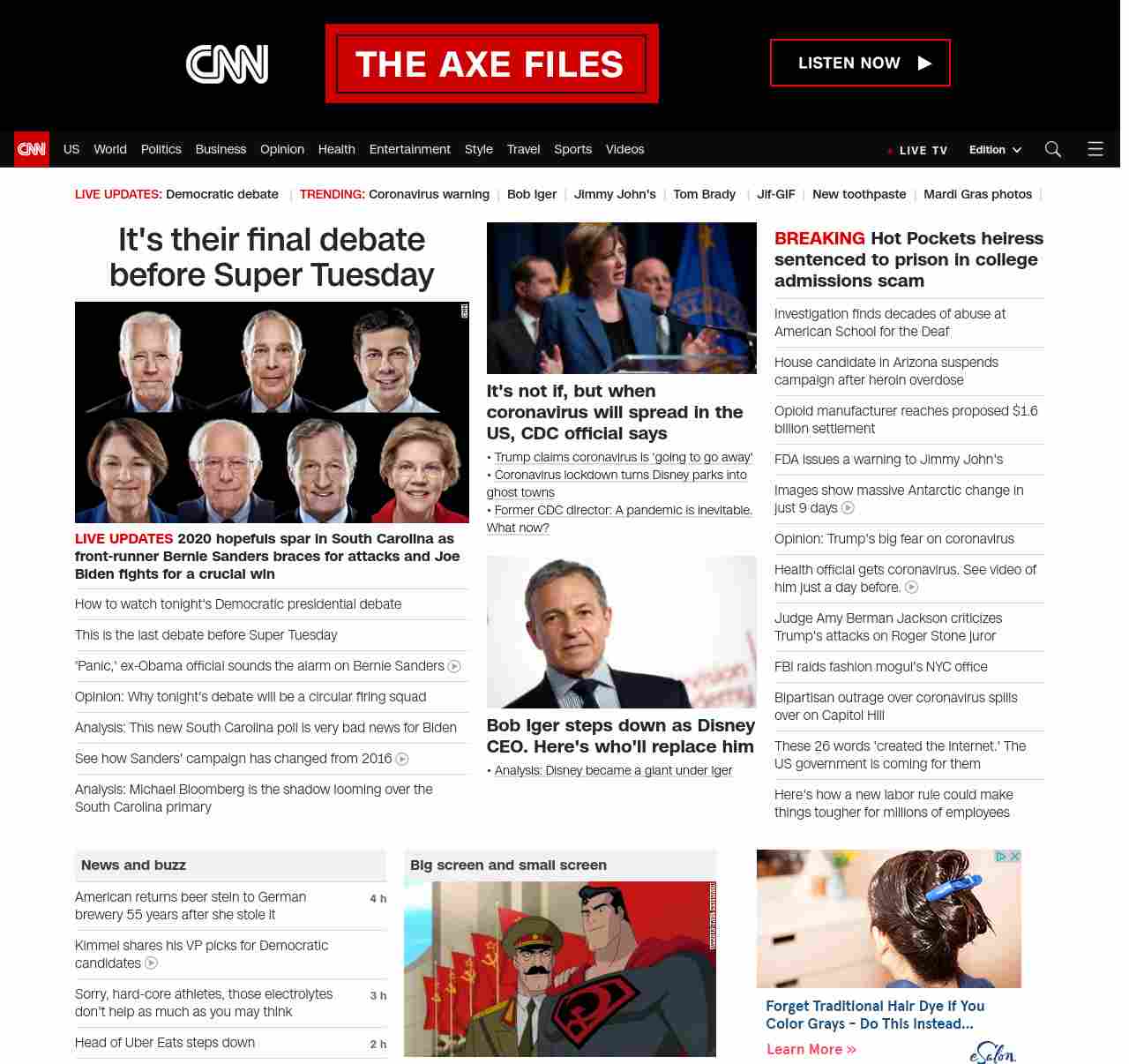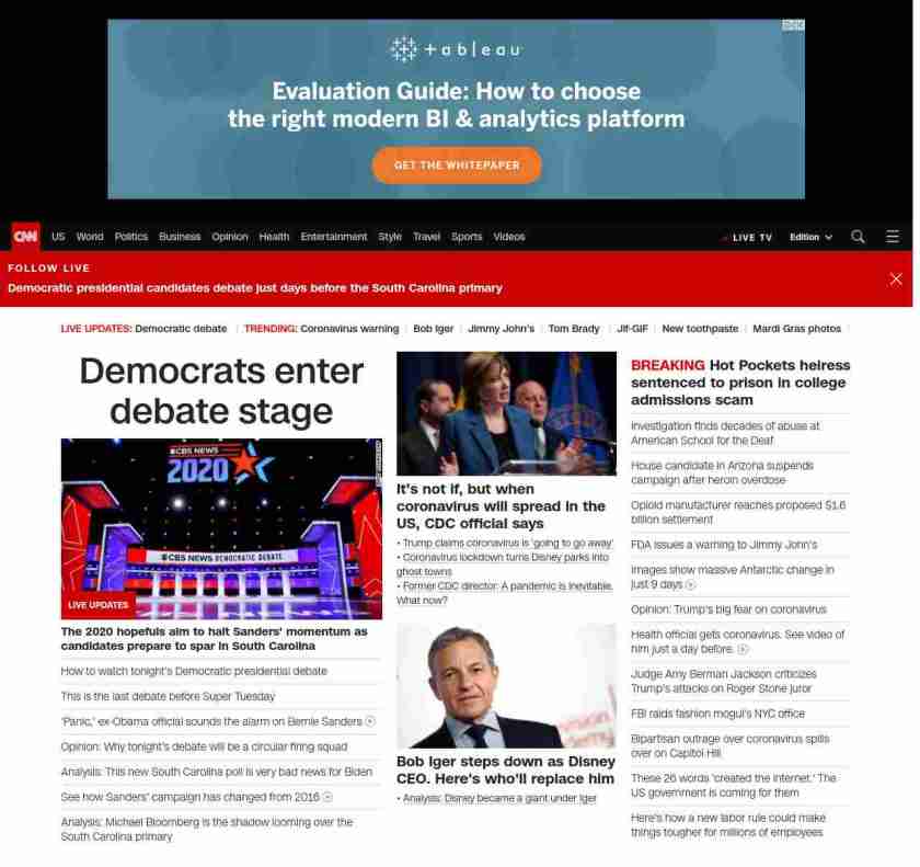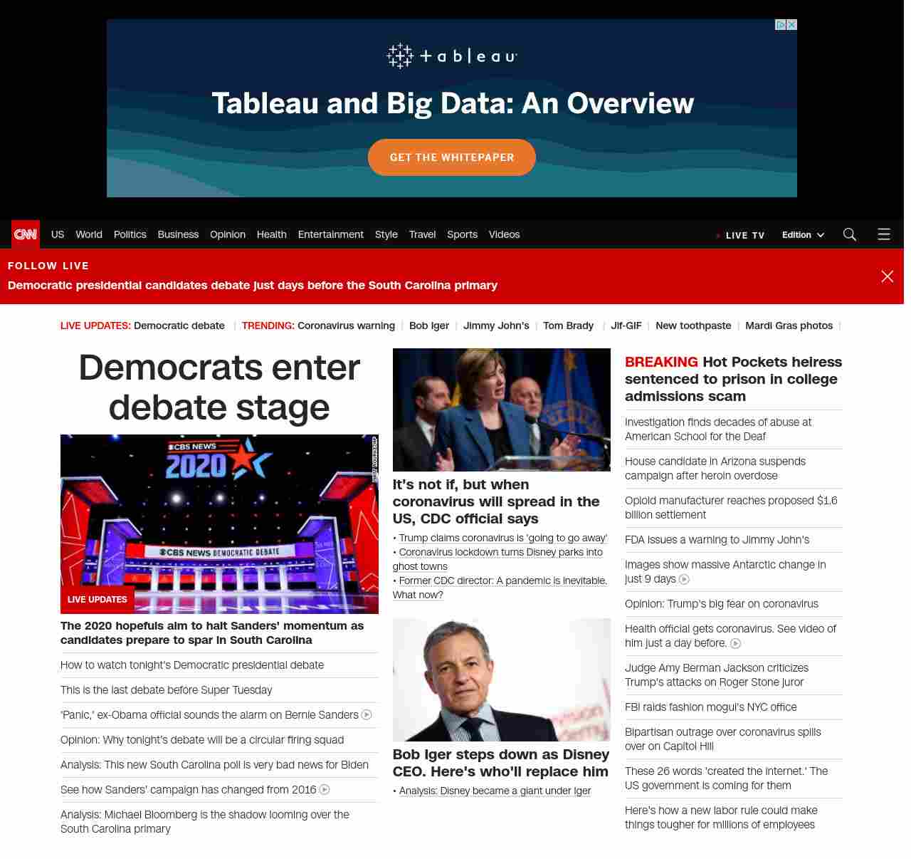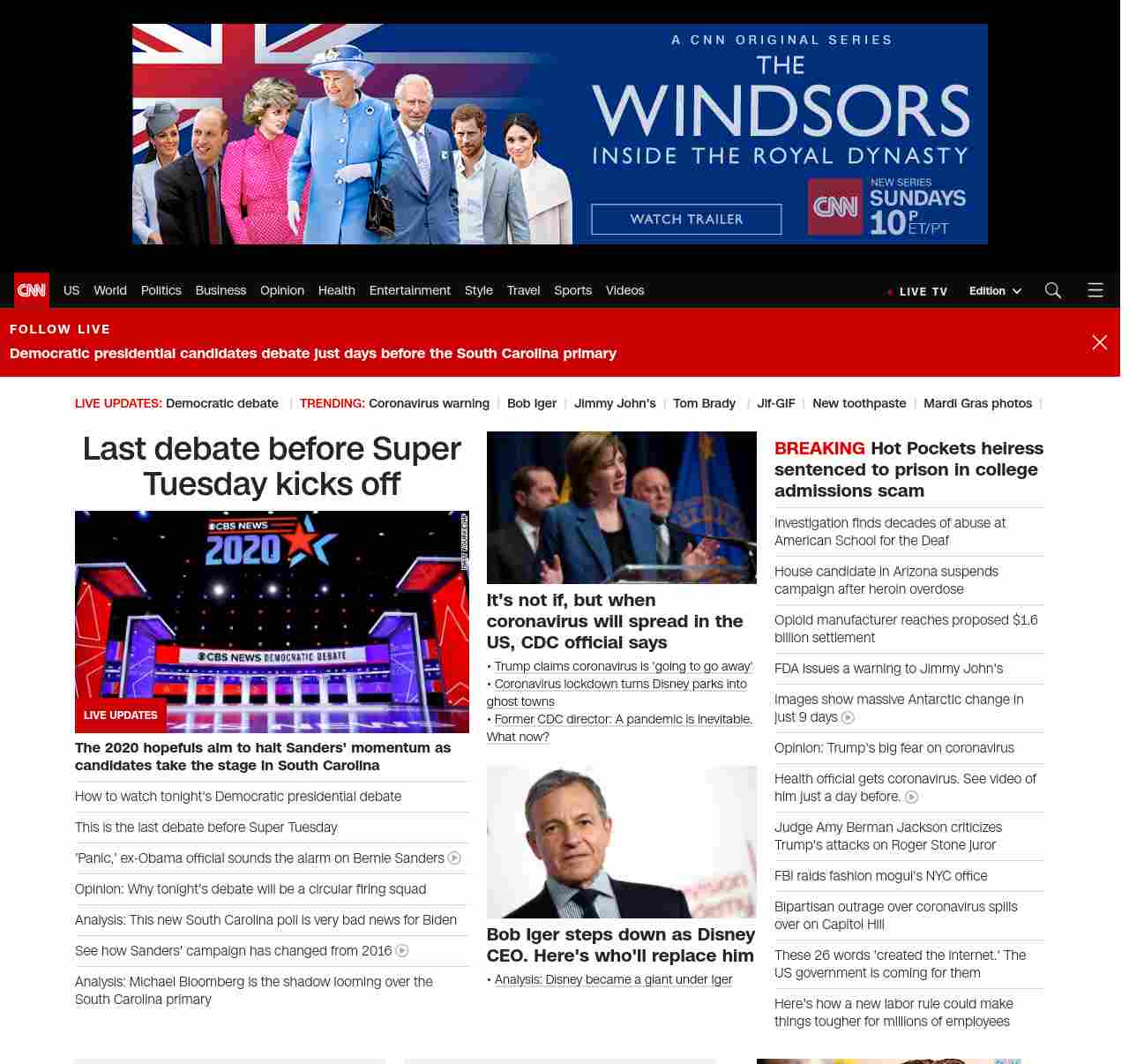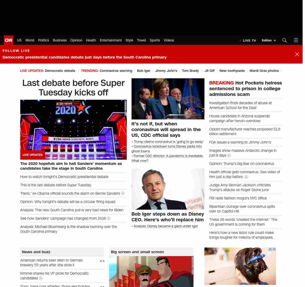 || screaming-banner-text banner-text-size–char-47″ data-analytics=”_list-hierarchical-xs_article_”> It’s their final debate before Super Tuesday ||” , title: “CNN – Breaking News, Latest News and Videos” , siblings: {“articleList”:[{“uri”:”/politics/live-news/2020-democratic-debate-south-carolina/index.html”,”headline”:”u003cstrong>2020 hopefuls spar in South Carolina as front-runner Bernie Sanders braces for attacks and Joe Biden fights for a crucial winu003c/strong>”,”thumbnail”:”//cdn.cnn.com/cnnnext/dam/assets/200225144146-0225-sc-debate-candidates-split-small-11.jpg”,”duration”:””,”description”:””,”layout”:””
