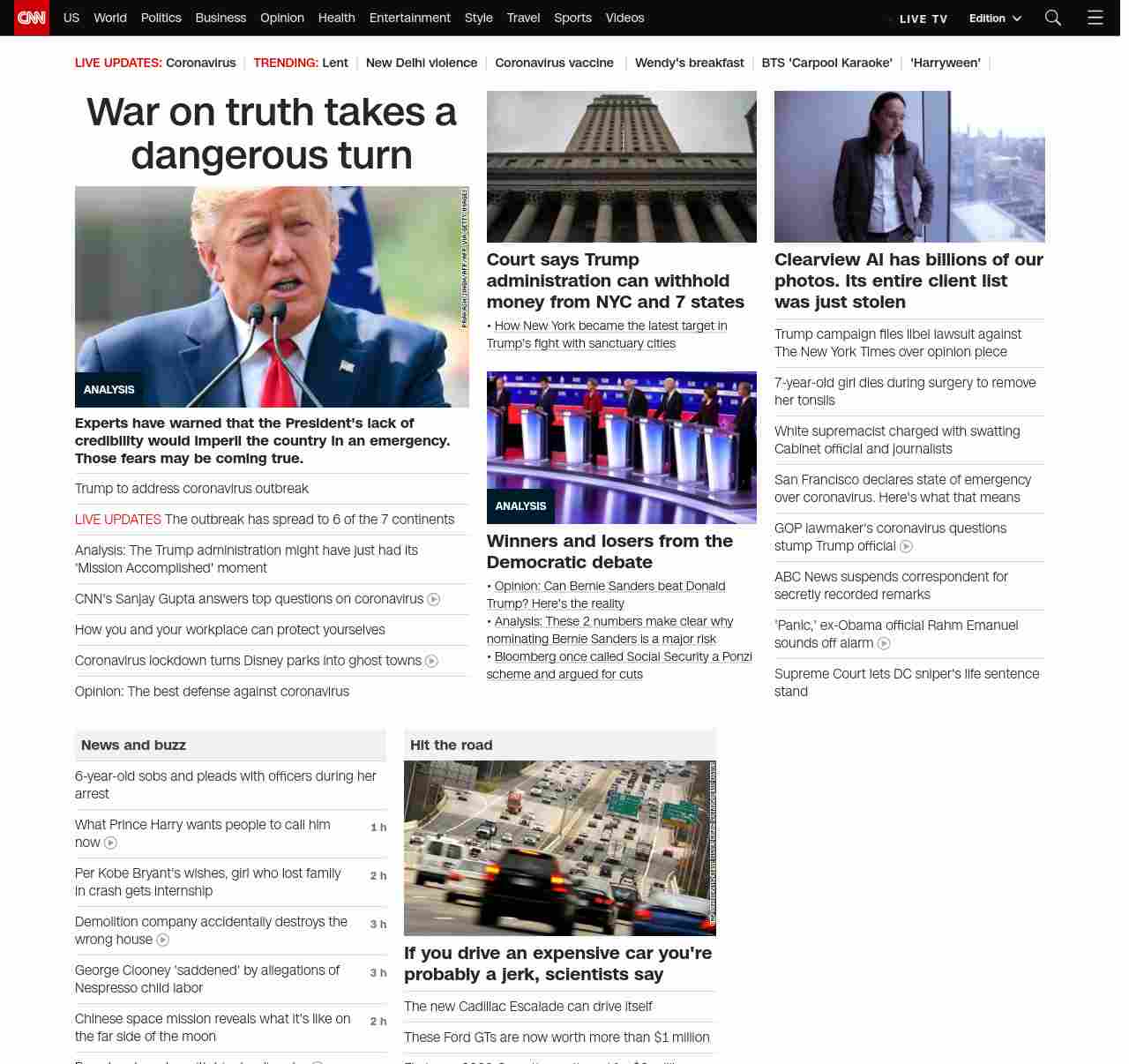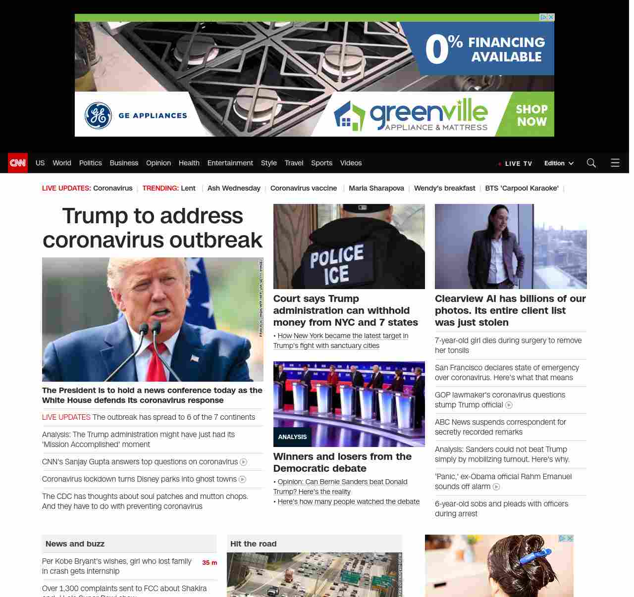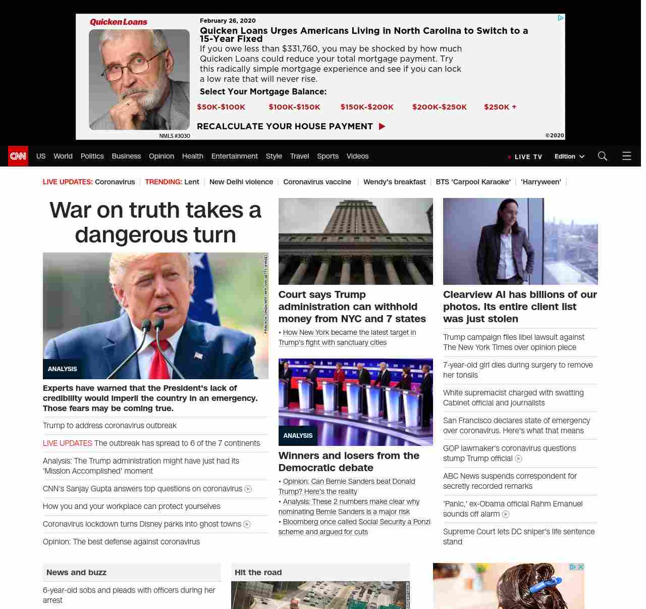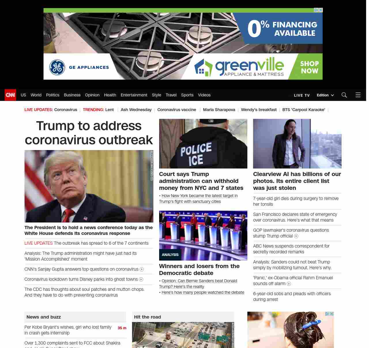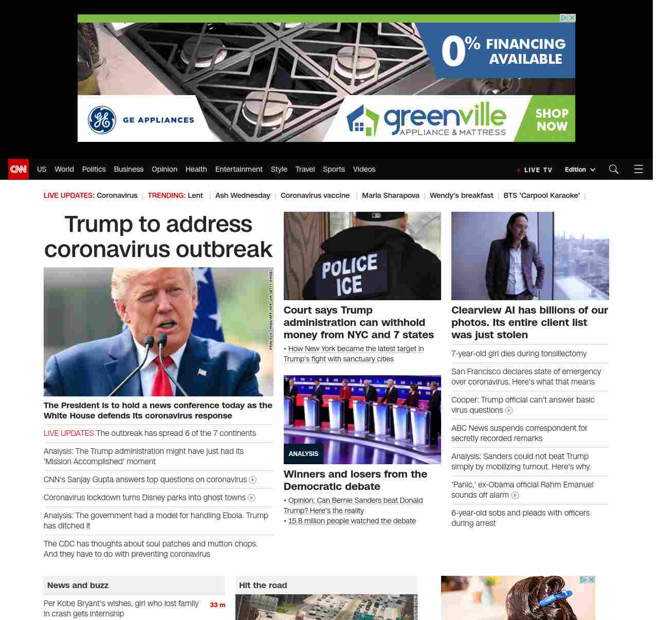 || screaming-banner-text banner-text-size–char-38″ data-analytics=”_list-hierarchical-xs_article_”> Trump to address coronavirus outbreak ||” , title: “CNN – Breaking News, Latest News and Videos” , siblings: {“articleList”:[{“uri”:”/2020/02/26/media/trump-attacks-media-coronavirus/index.html”,”headline”:”Experts have warned that the President’s lack of credibility would imperil the country in an emergency. Those fears may be coming true.”,”thumbnail”:”//cdn.cnn.com/cnnnext/dam/assets/200225201314-coronavirus-trump-control-brote-bolsa-valores-isabel-morales-pkg-dusa-00003826-small-11.jpg”,”duration”:””,”description”:”Since the dawn of the Trump presidency, countless experts have warned that the president’s lack of credibility would imperil the country in the event of an emergency.”,”layout”:””
