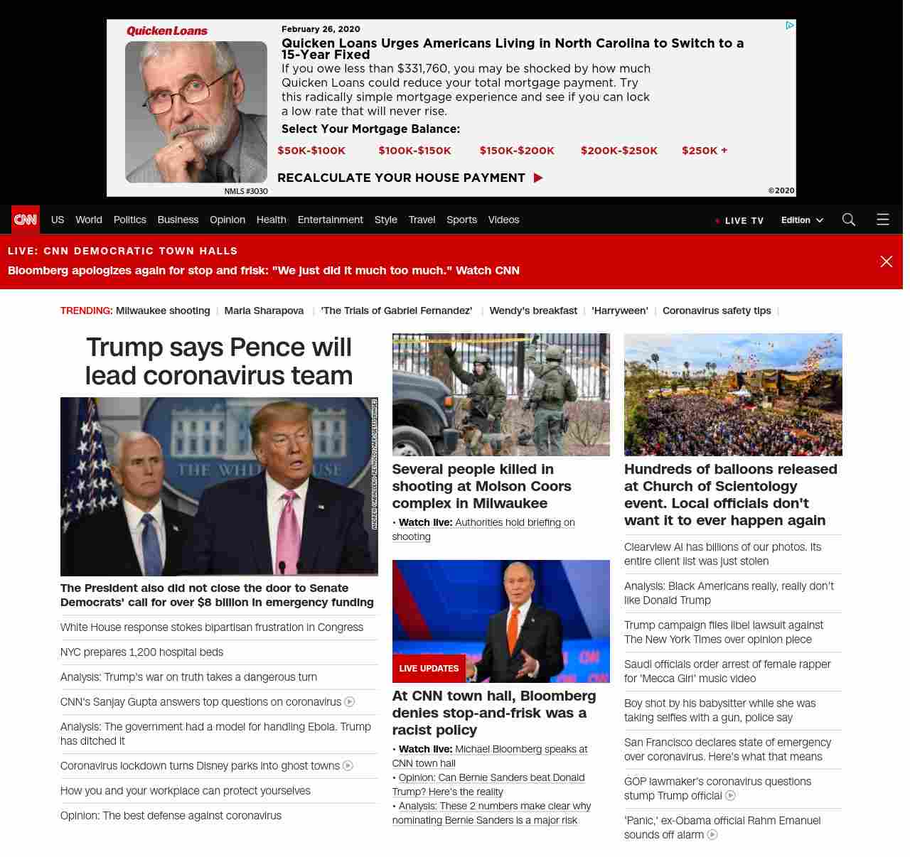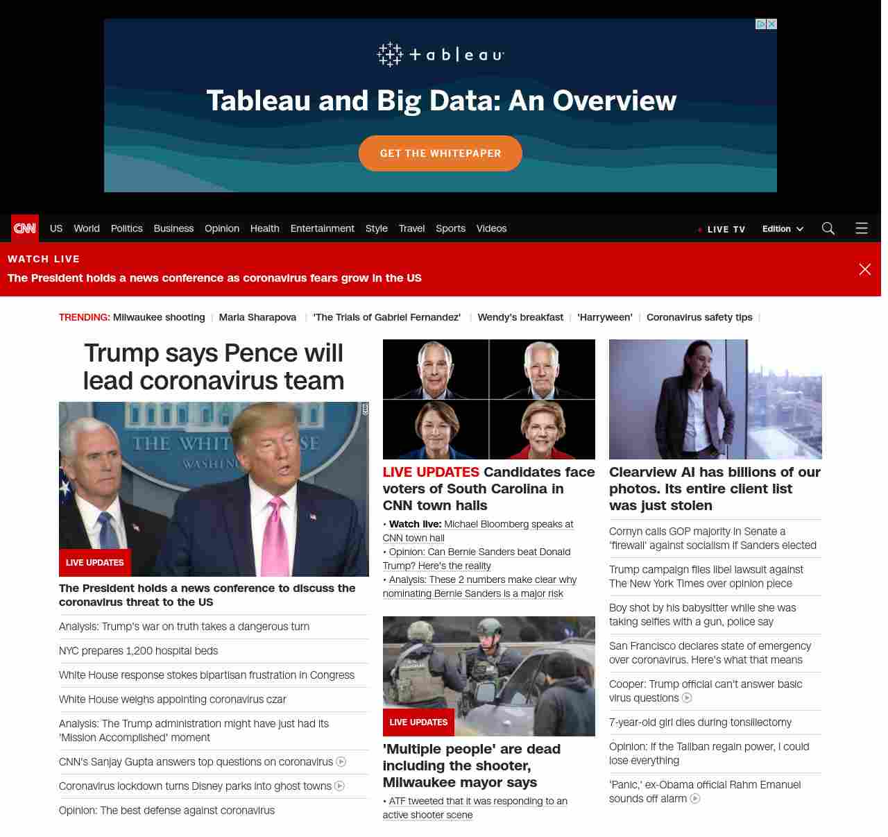 || screaming-banner-text banner-text-size–char-44″ data-analytics=”_list-hierarchical-xs_article_”> Trump says Pence will lead coronavirus team ||” , title: “CNN – Breaking News, Latest News and Videos” , siblings: {“articleList”:[{“uri”:”/2020/02/26/politics/trump-coronavirus-stock-market/index.html”,”headline”:”u003cstrong>The President also did not close the door to Senate Democrats’ call for over $8 billion in emergency fundingu003c/strong>”,”thumbnail”:”//cdn.cnn.com/cnnnext/dam/assets/200226190946-02-trump-coronavirus-presser-0226-small-11.jpg”,”duration”:””,”description”:”President Donald Trump on Wednesday placed Vice President Mike Pence in charge of the US government response to the novel coronavirus, amid growing criticism of the White House’s handling of the outbreak.”,”layout”:””