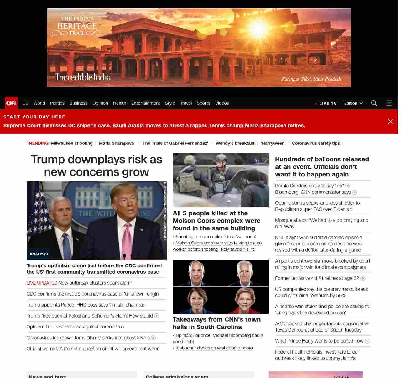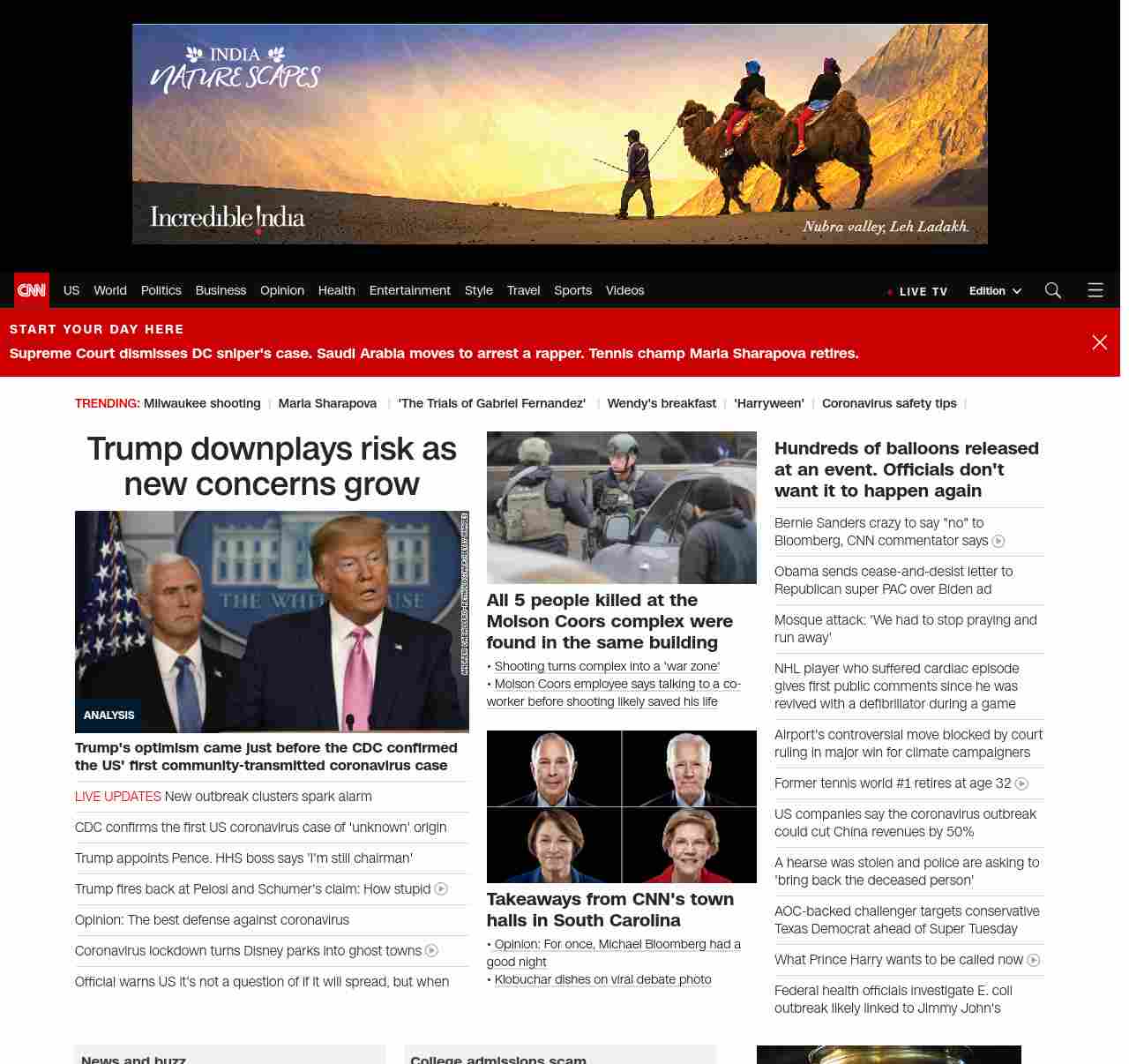|| screaming-banner-text banner-text-size–char-35″ data-analytics=”_list-hierarchical-xs_article_”> New outbreak clusters spark alarm ||” , title: “CNN – Breaking News, Latest News and Videos” , siblings: {“articleList”:[{“uri”:”/2020/02/27/politics/coronavirus-donald-trump-politics-mike-pence-democrats/index.html”,”headline”:”u003cstrong>Trump’s optimism came just before the CDC confirmed the US’ first community-transmitted coronavirus caseu003c/strong>”,”thumbnail”:”//cdn.cnn.com/cnnnext/dam/assets/200226190946-02-trump-coronavirus-presser-0226-small-11.jpg”,”duration”:””,”description”:”President Donald Trumpu003ca href=”https://www.cnn.com/2020/02/26/politics/coronavirus-donald-trump-politics-us-health/index.html” target=”_blank”> wants America to know he’s doing a great jobu003c/a> in keeping out the novel coronavirus, in a victory lap that could look premature if his own experts are correct in their more somber forecasts.”,”layout”:””