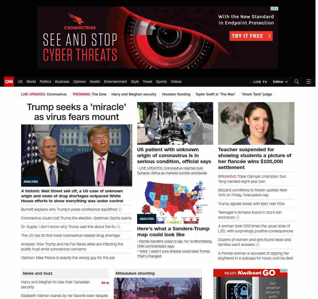 || screaming-banner-text banner-text-size–char-47″ data-analytics=”_list-hierarchical-xs_article_”> Trump seeks a ‘miracle’ as virus fears mount ||” , title: “CNN – Breaking News, Latest News and Videos” , siblings: {“articleList”:[{“uri”:”/2020/02/28/politics/donald-trump-coronavirus-miracle-stock-markets/index.html”,”headline”:”u003cstrong>A historic Wall Street sell off, a US case of unknown origin and news of drug shortages outpaced White House efforts to show everything was under controlu003c/strong>”,”thumbnail”:”//cdn.cnn.com/cnnnext/dam/assets/200226190946-02-trump-coronavirus-presser-0226-small-11.jpg”,”duration”:””,”description”:”u003ca href=”https://www.cnn.com/election/2020/candidate/trump” target=”_blank”>President Donald Trumpu003c/a> is hoping for a “miracle” that u003ca href=”https://www.cnn.com/2020/02/27/politics/trump-coronavirus-disappear/index.html” target=”_blank”>will make the coronavirus disappear u003c/a>but u003ca href=”https://www.cnn.com/2020/02/27/investing/dow-stock-market-selloff/index.html” target=”_blank”>tanking stock marketsu003c/a> and signs u003ca href=”https://www.cnn.com/2020/02/27/health/coronavirus-community-spread-us-response-explainer/index.html” target=”_blank”>the disease is stalking Americau003c/a> are delivering their verdict on his scattershot management of the crisis.”,”layout”:””