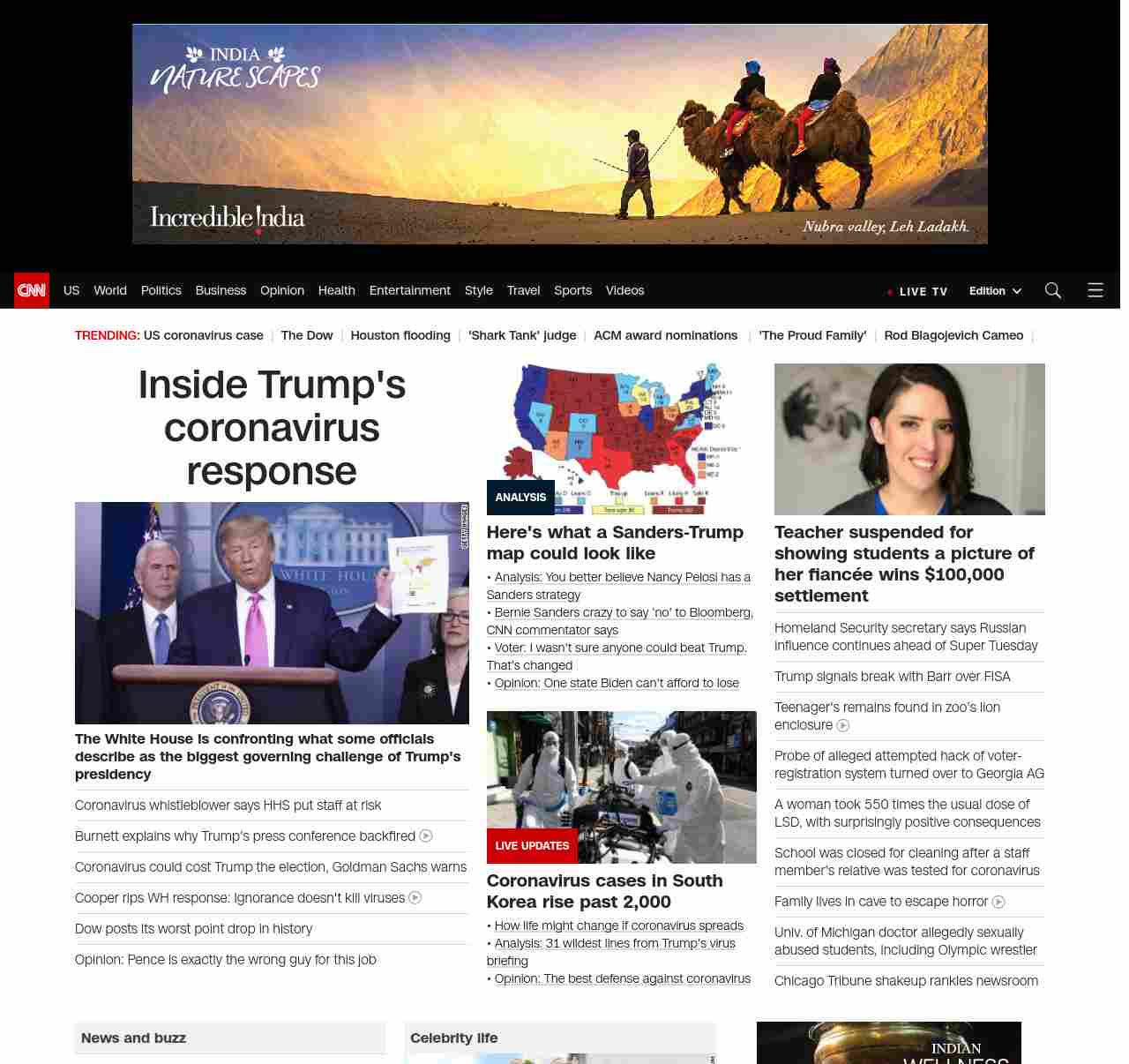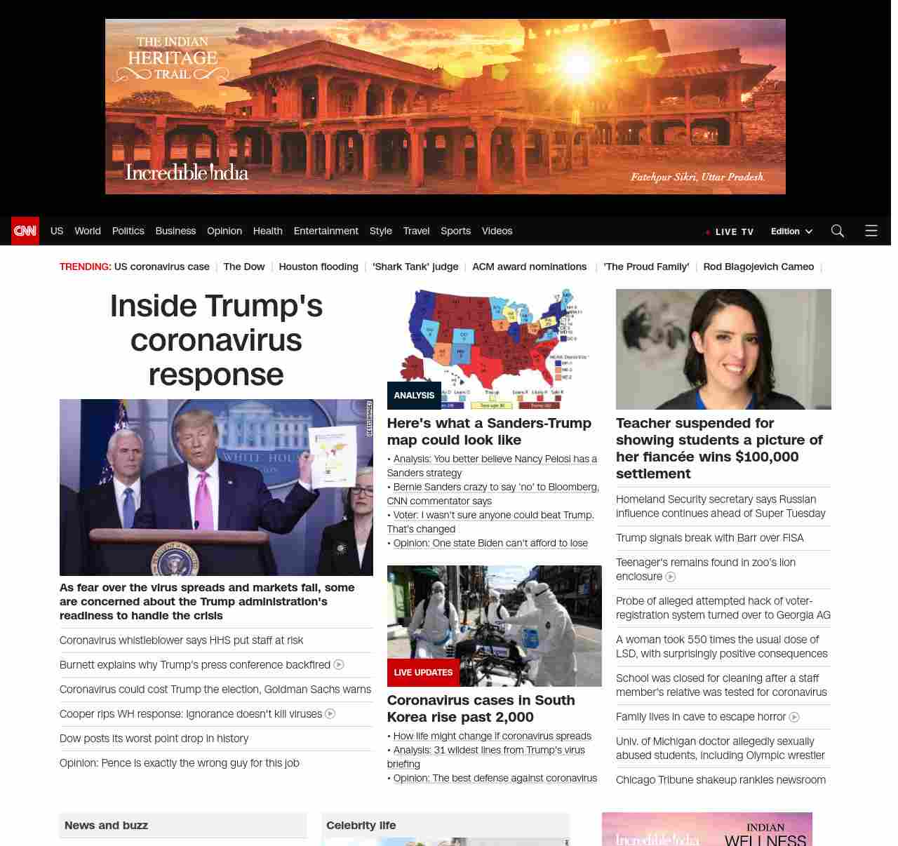 || screaming-banner-text banner-text-size–char-38″ data-analytics=”_list-hierarchical-xs_article_”> Inside Trump’s coronavirus response ||” , title: “CNN – Breaking News, Latest News and Videos” , siblings: {“articleList”:[{“uri”:”/2020/02/27/politics/trump-coronavirus-response-market-meltdown-backlash/index.html”,”headline”:”u003cstrong>As fear over the virus spreads and markets fall, some are concerned about the Trump administration’s readiness to handle the crisisu003c/strong>”,”thumbnail”:”//cdn.cnn.com/cnnnext/dam/assets/200227073536-trump-downplays-coronavirus-threat-small-11.jpg”,”duration”:””,”description”:”By the time President Donald Trump landed from his trip to India early Wednesday morning, he was not happy. “,”layout”:””