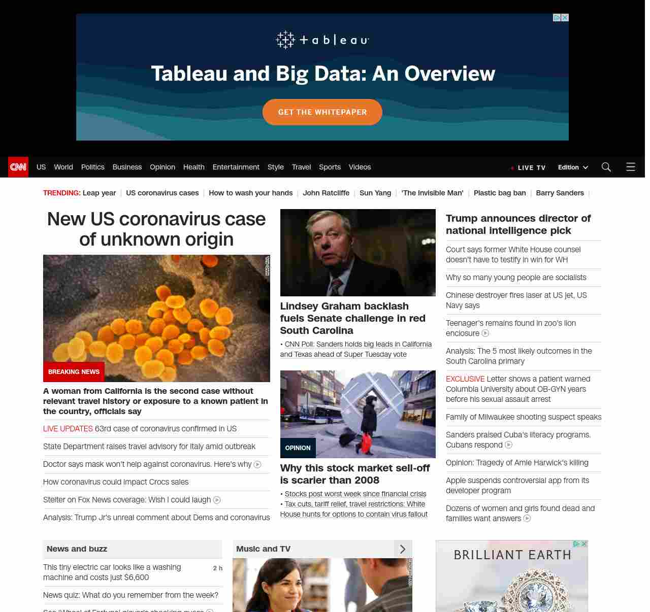 || screaming-banner-text banner-text-size–char-44″ data-analytics=”_list-hierarchical-xs_article_”> New US coronavirus case of unknown origin ||” , title: “CNN – Breaking News, Latest News and Videos” , siblings: {“articleList”:[{“uri”:”/2020/02/28/health/coronavirus-us-updates-california-patient/index.html”,”headline”:”u003cstrong>A woman from California is the second case without relevant travel history or exposure to a known patient in the country, officials sayu003c/strong>”,”thumbnail”:”//cdn.cnn.com/cnnnext/dam/assets/200213175739-03-coronavirus-0213-small-11.jpg”,”duration”:””,”description”:”An older adult woman from California might be the second case of community transmission of the u003ca href=”https://www.cnn.com/asia/live-news/coronavirus-outbreak-02-28-20-intl-hnk/index.html” target=”_blank”>novel coronavirusu003c/a>, health officials in Santa Clara County said Friday.”,”layout”:””