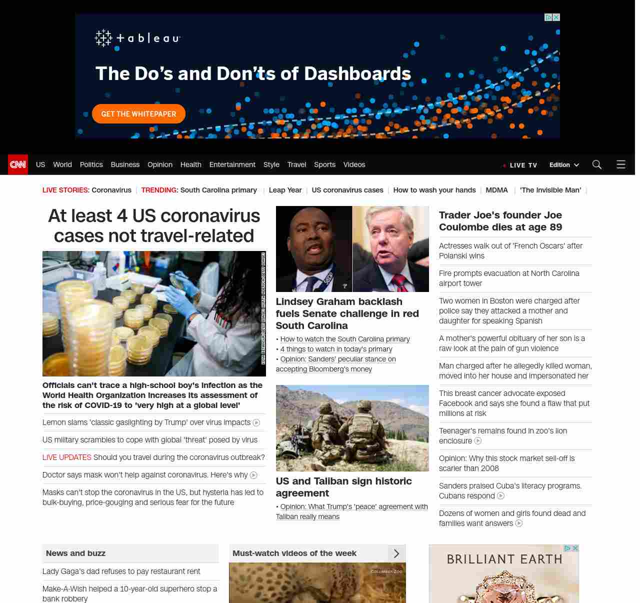 || screaming-banner-text banner-text-size–char-47″ data-analytics=”_list-hierarchical-xs_article_”> At least 4 US coronavirus cases not travel-related ||” , title: “CNN – Breaking News, Latest News and Videos” , siblings: {“articleList”:[{“uri”:”/2020/02/29/health/us-coronavirus-saturday/index.html”,”headline”:”u003cstrong>Officials can’t trace a high-school boy’s infection as the World Health Organization increases its assessment of the risk of COVID-19 to ‘very high at a global level’u003c/strong>”,”thumbnail”:”//cdn.cnn.com/cnnnext/dam/assets/200229033143-coronavirus-testing-development-small-11.jpg”,”duration”:””,”description”:”There are now at least four u003ca href=”https://www.cnn.com/2020/02/28/health/coronavirus-us-updates-california-patient/index.html” target=”_blank”>US coronavirus casesu003c/a> without any related travel history, health officials say.”,”layout”:””