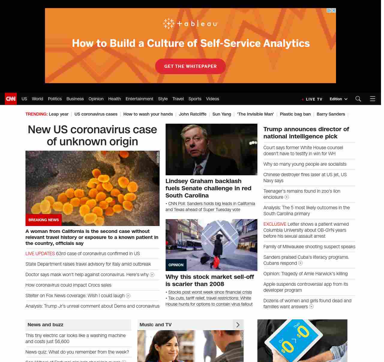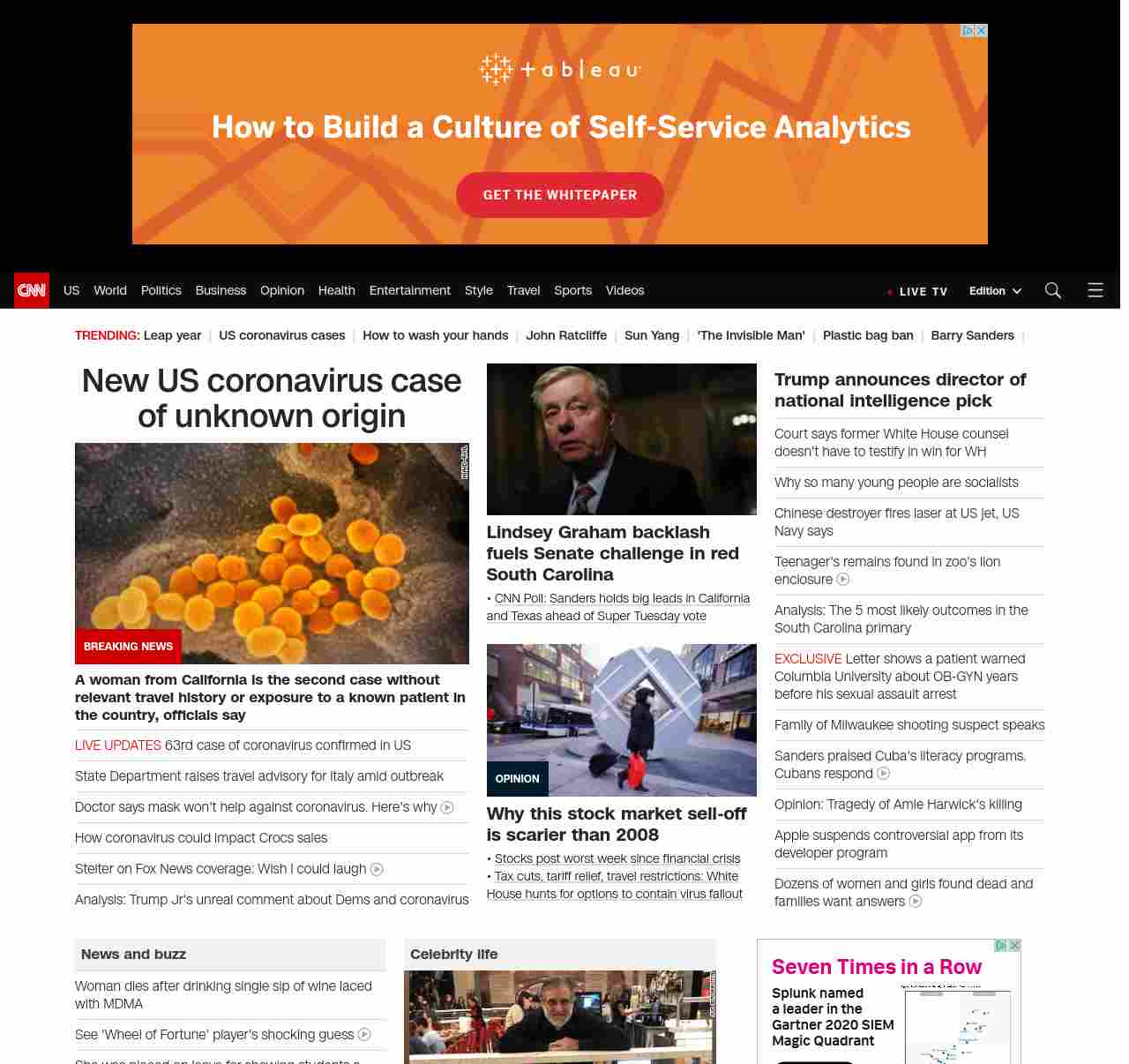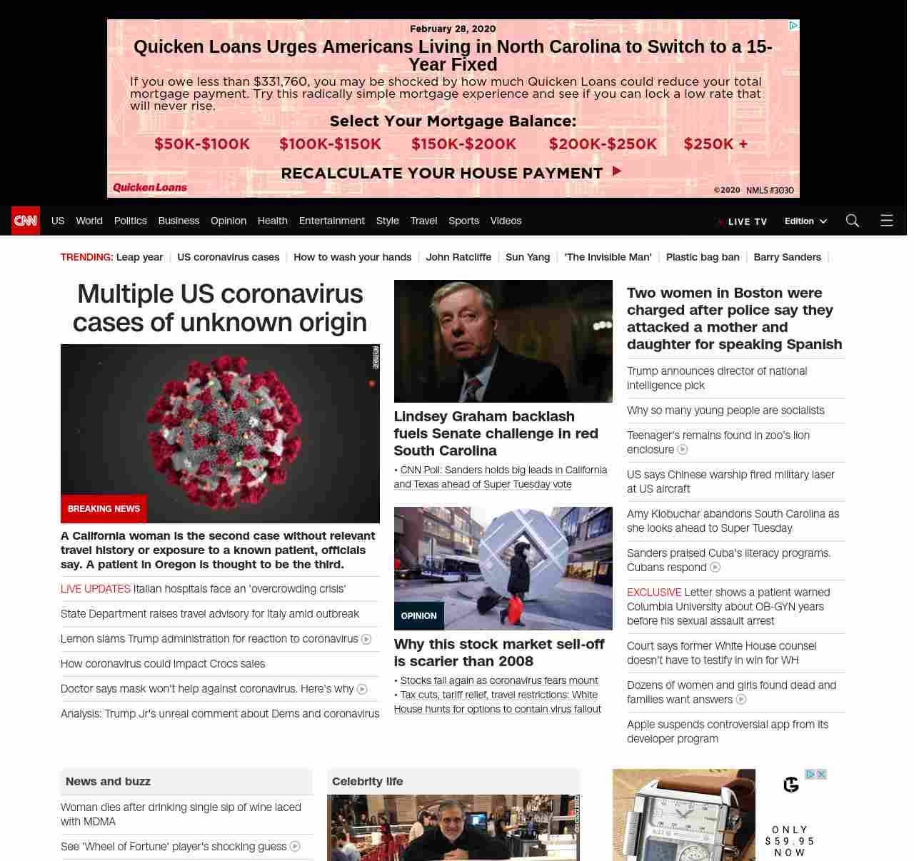 || screaming-banner-text banner-text-size–char-47″ data-analytics=”_list-hierarchical-xs_article_”> Multiple US coronavirus cases of unknown origin ||” , title: “CNN – Breaking News, Latest News and Videos” , siblings: {“articleList”:[{“uri”:”/2020/02/28/health/coronavirus-us-updates-california-patient/index.html”,”headline”:”u003cstrong>A woman from California is the second case without relevant travel history or exposure to a known patient in the country, officials sayu003c/strong>”,”thumbnail”:”//cdn.cnn.com/cnnnext/dam/assets/200213175739-03-coronavirus-0213-small-11.jpg”,”duration”:””,”description”:”An older adult woman from California might be the second case of community transmission of the u003ca href=”https://www.cnn.com/asia/live-news/coronavirus-outbreak-02-28-20-intl-hnk/index.html” target=”_blank”>novel coronavirusu003c/a>, health officials in Santa Clara County said Friday.”,”layout”:””