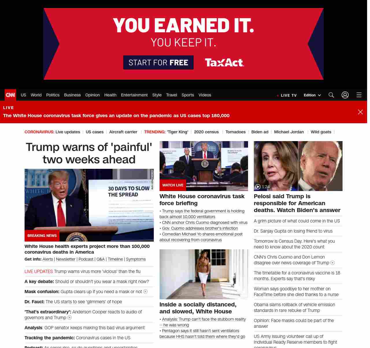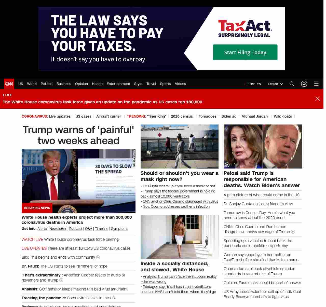 || screaming-banner-text banner-text-size–char-41″ data-analytics=”_list-hierarchical-xs_hyperlink_”> Trump warns of ‘painful’ two weeks ahead ||” , title: “CNN – Breaking News, Latest News and Videos” , siblings: {“articleList”:[{“uri”:”/2020/03/31/health/coronavirus-masks-experts-debate/index.html”,”headline”:”u003cstrong>A key debate:u003c/strong> Should or shouldn’t you wear a mask right now?”,”thumbnail”:”//cdn.cnn.com/cnnnext/dam/assets/200327141643-02-coronavirus-los-angeles-0327-small-11.jpg”,”duration”:””,”description”:”u003cstrong>More:u003c/strong> u003ca href=”https://www.cnn.com/specials/mobile-apps” target=”_blank”>Alertsu003c/a> | u003ca href=”https://www.cnn.com/specials/coronavirus-newsletter?utm_source=hp&source=hp” target=”_blank”>Newsletteru003c/a> | u003ca href=”https://www.cnn.com/audio/podcasts/corona-virus”>Podcastu003c/a> | u003ca href=”https://www.cnn.com/interactive/2020/health/coronavirus-questions-answers/” target=”_blank”>Q&Au003c/a> | u003ca href=”https://www.cnn.com/2020/03/31/health/coronavirus-symptoms-list-what-to-do-wellness/index.html” target=”_blank”>Symptomsu003c/a>”,”layout”:””