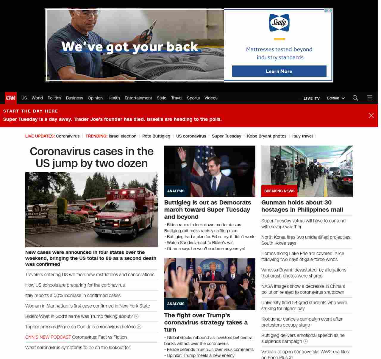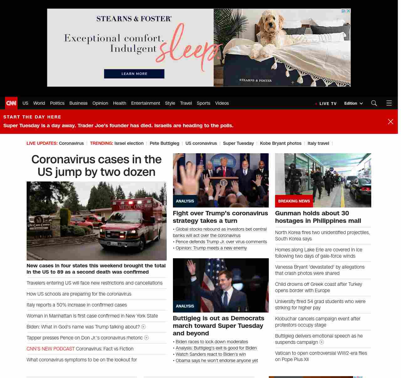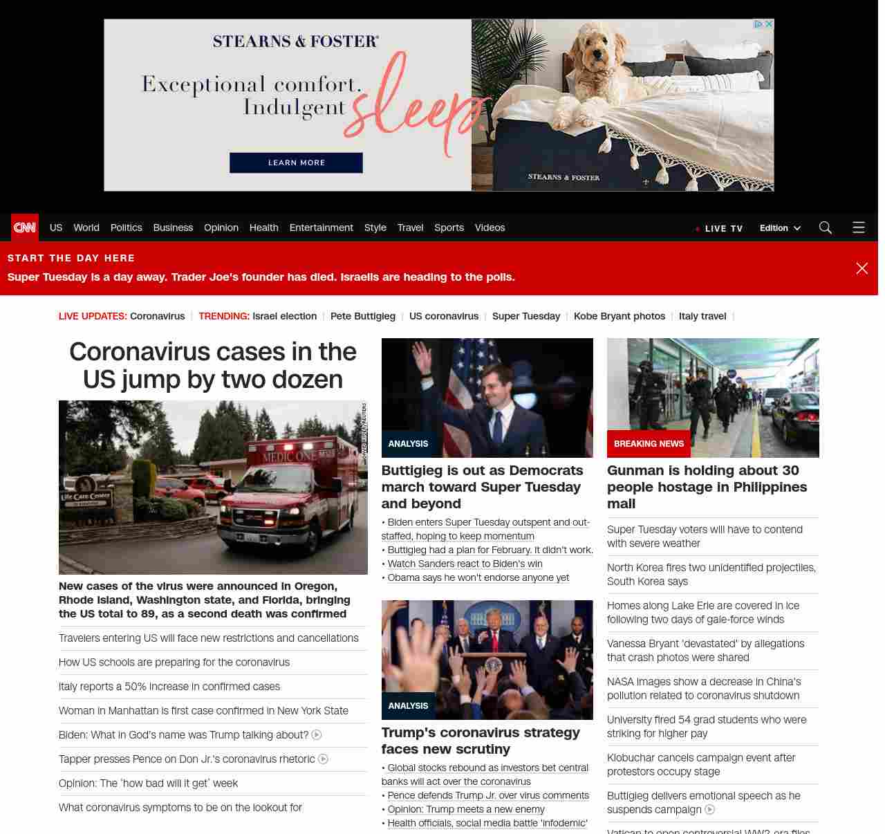 || screaming-banner-text banner-text-size–char-47″ data-analytics=”_list-hierarchical-xs_article_”> Coronavirus cases in the US jump by two dozen ||” , title: “CNN – Breaking News, Latest News and Videos” , siblings: {“articleList”:[{“uri”:”/2020/03/02/health/us-coronavirus-cases-monday/index.html”,”headline”:”u003cstrong>New cases were announced in four states over the weekend, bringing the US total to 89 as a second death was confirmedu003c/strong>”,”thumbnail”:”//cdn.cnn.com/cnnnext/dam/assets/200302104935-05-coronavirus-0301-washington-state-small-11.jpg”,”duration”:””,”description”:”The total number of novel coronavirus cases in the United States jumped by two dozen over the weekend, as the first two deaths from the outbreak were confirmed.”,”layout”:””