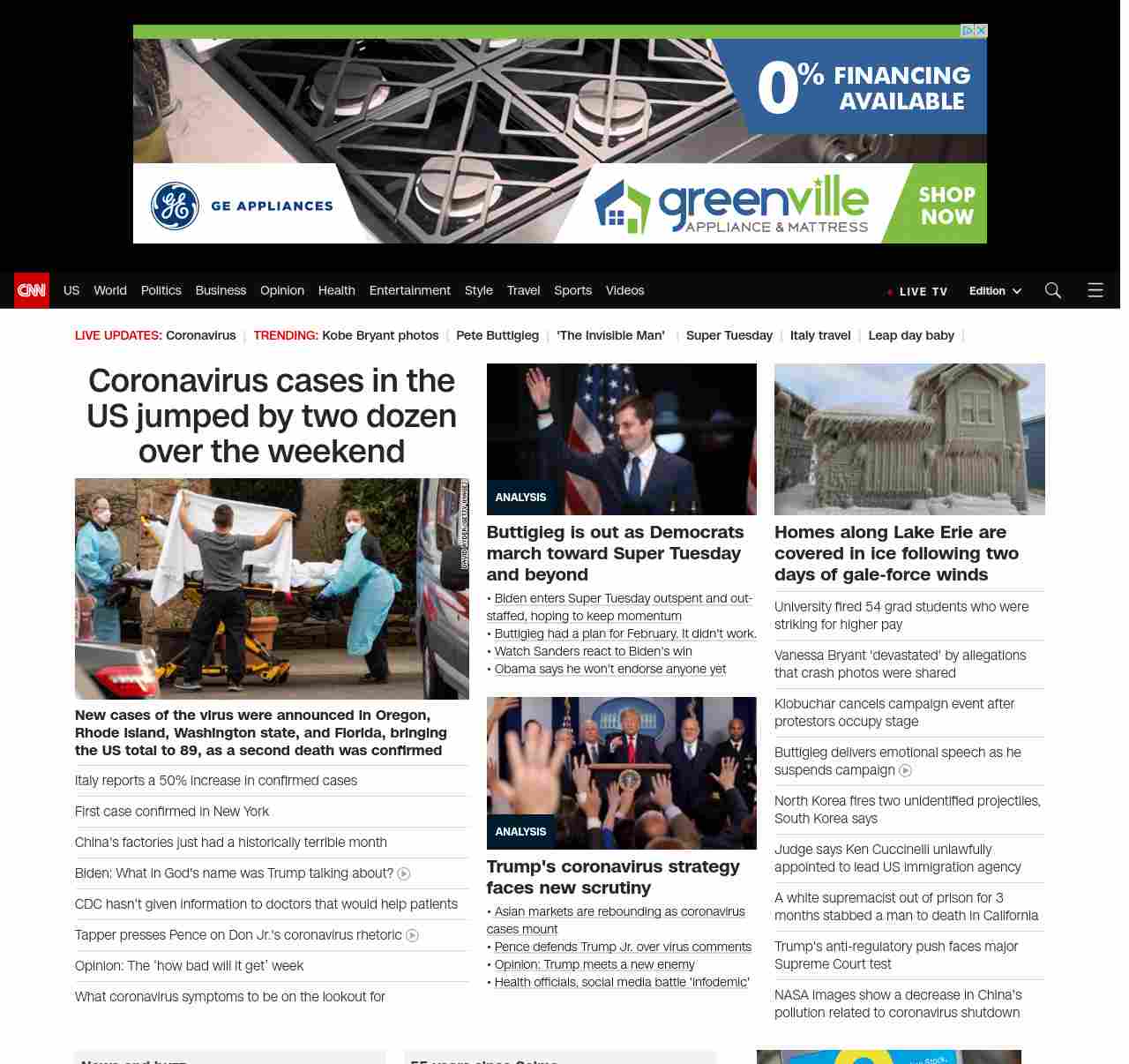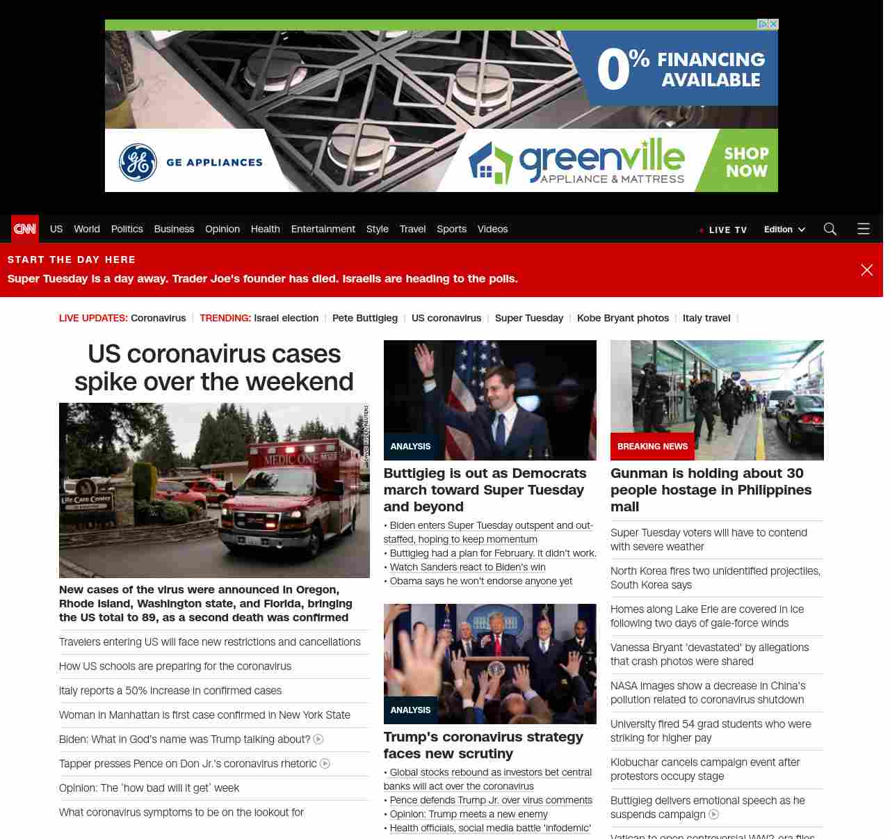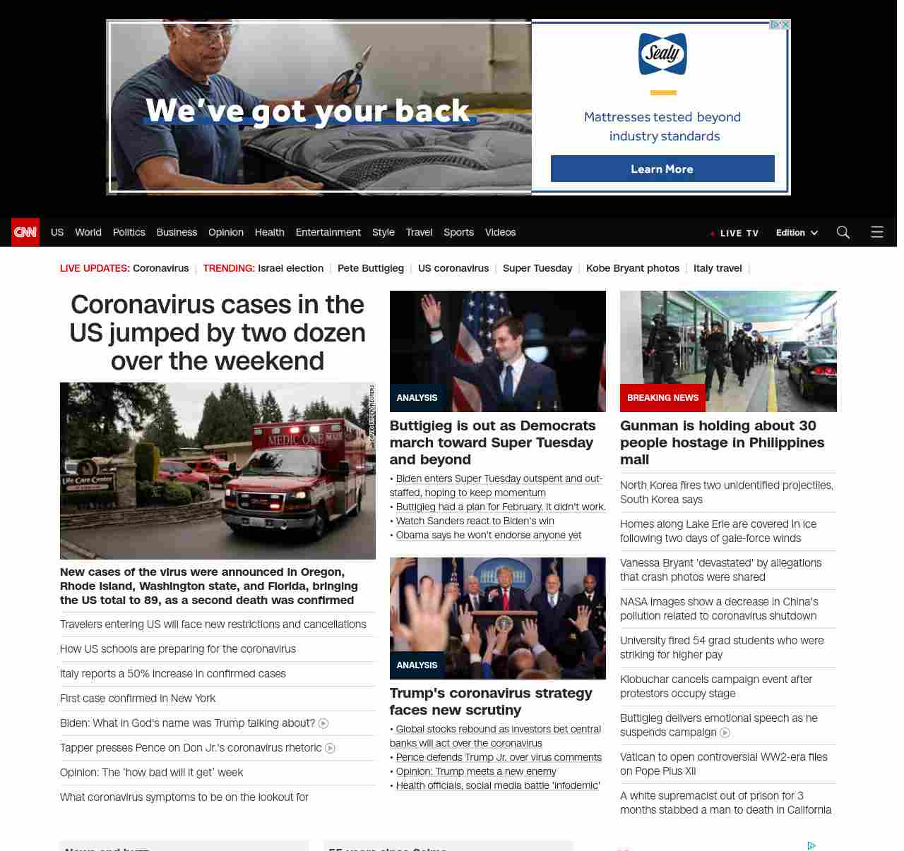 || screaming-banner-text banner-text-size–char-47″ data-analytics=”_list-hierarchical-xs_article_”> Coronavirus cases in the US jumped by two dozen over the weekend ||” , title: “CNN – Breaking News, Latest News and Videos” , siblings: {“articleList”:[{“uri”:”/2020/03/02/health/us-coronavirus-cases-monday/index.html”,”headline”:”u003cstrong>New cases of the virus were announced in Oregon, Rhode Island, Washington state, and Florida, bringing the US total to 89, as a second death was confirmedu003c/strong>”,”thumbnail”:”//cdn.cnn.com/cnnnext/dam/assets/200302104935-05-coronavirus-0301-washington-state-small-11.jpg”,”duration”:””,”description”:”The total number of novel coronavirus cases in the United States jumped by two dozen over the weekend, as the first two deaths from the outbreak were confirmed.”,”layout”:””