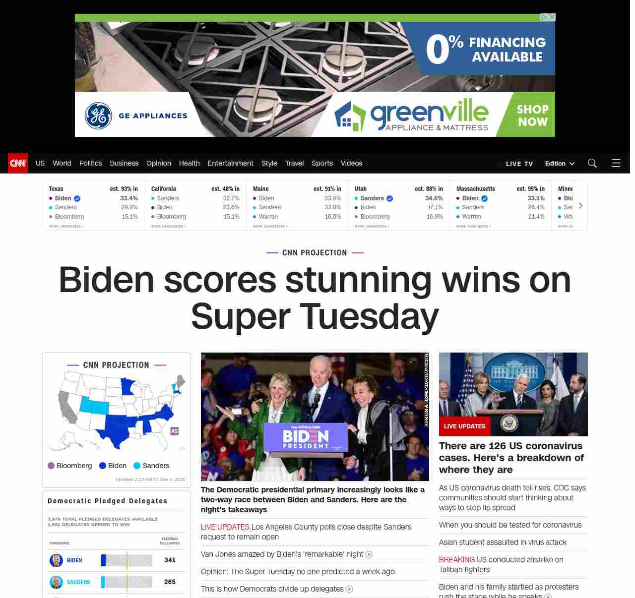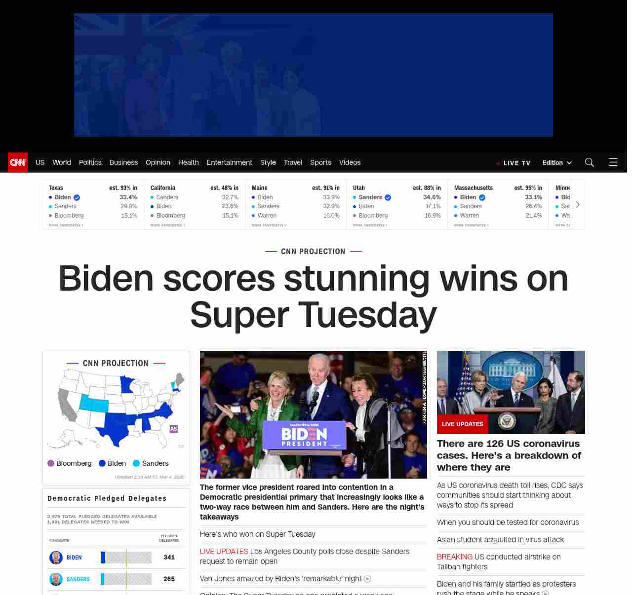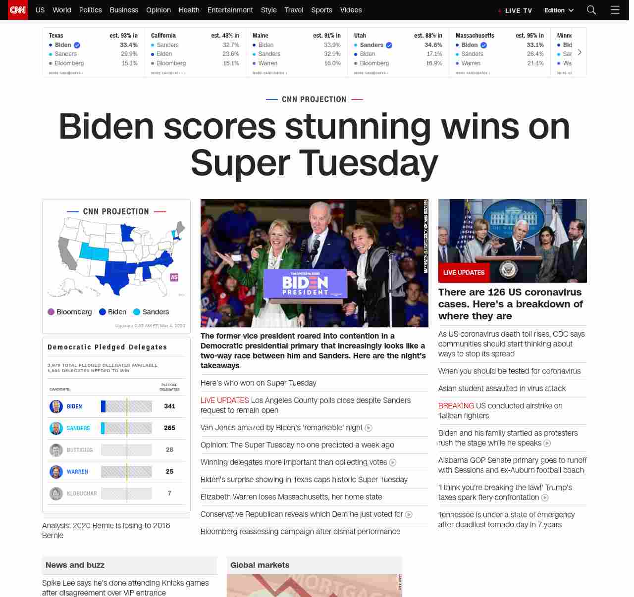 || banner-text–natural”> Biden scores stunning wins on Super Tuesday ||” , title: “CNN – Breaking News, Latest News and Videos” , siblings: {“articleList”:[{“uri”:”/2020/03/04/politics/candidate-bernie-sanders-2016-vs-2020/index.html”,”headline”:”Analysis: 2020 Bernie is losing to 2016 Bernie”,”thumbnail”:”//cdn.cnn.com/cnnnext/dam/assets/200303221723-05-sanders-super-tuesday-0303-small-11.jpg”,”duration”:””,”description”:”u003ca href=”https://www.cnn.com/election/2020/candidate/sanders” target=”_blank”>Bernie Sandersu003c/a> is closer now than he ever was to the u003ca href=”https://www.cnn.com/election” target=”_blank”>Democratic presidential nominationu003c/a> in 2016.”,”layout”:””