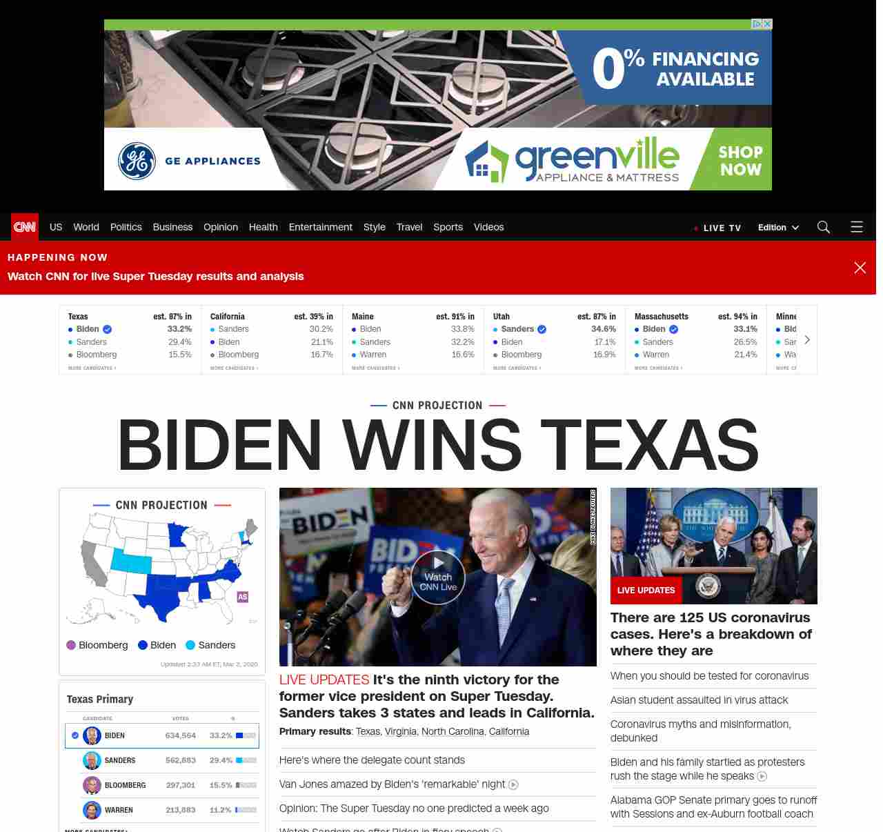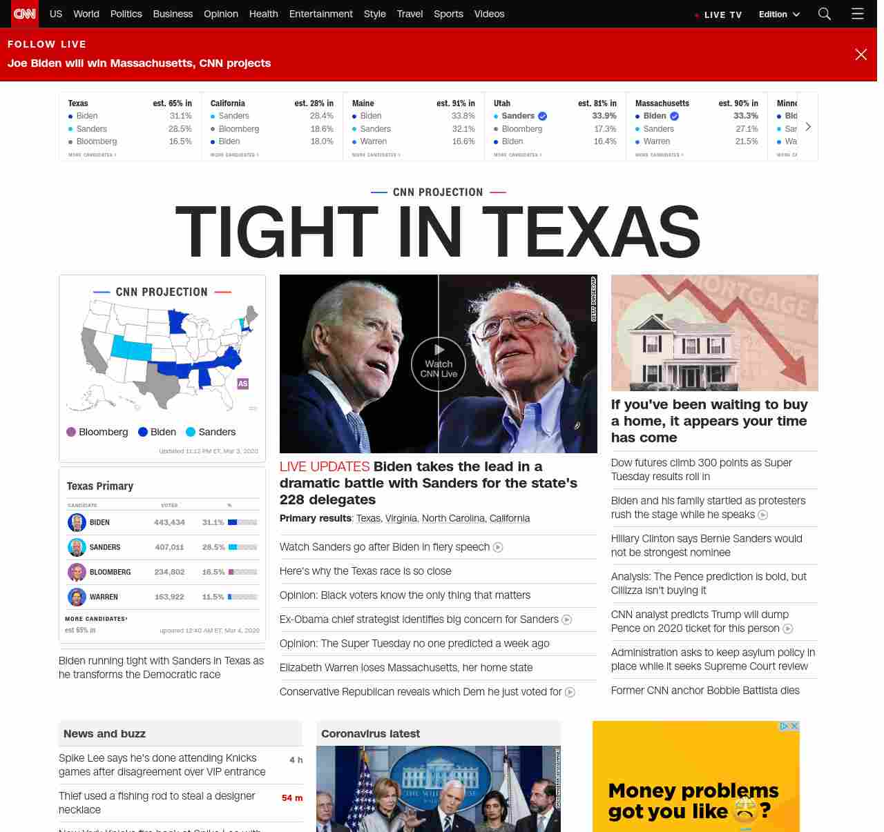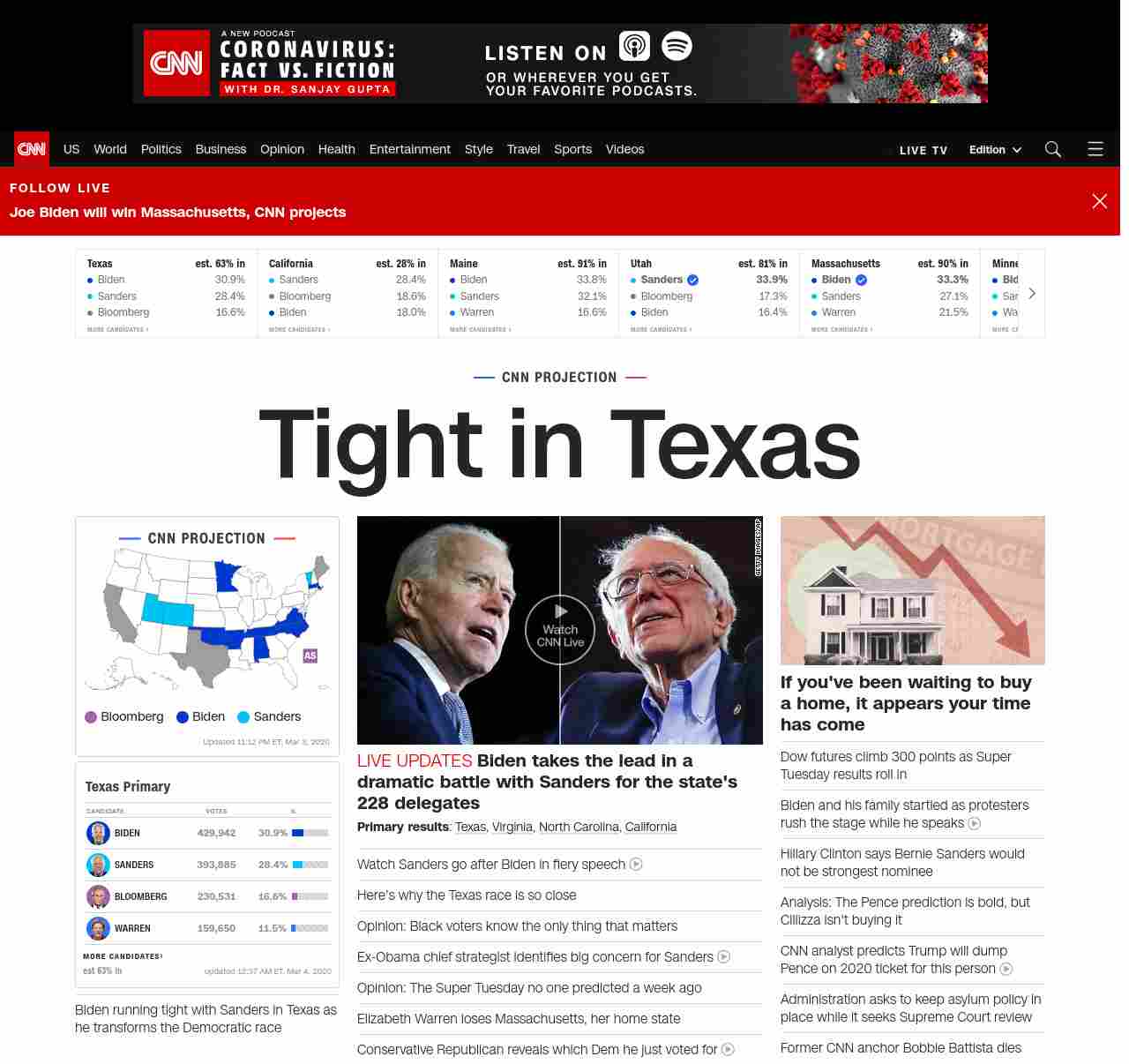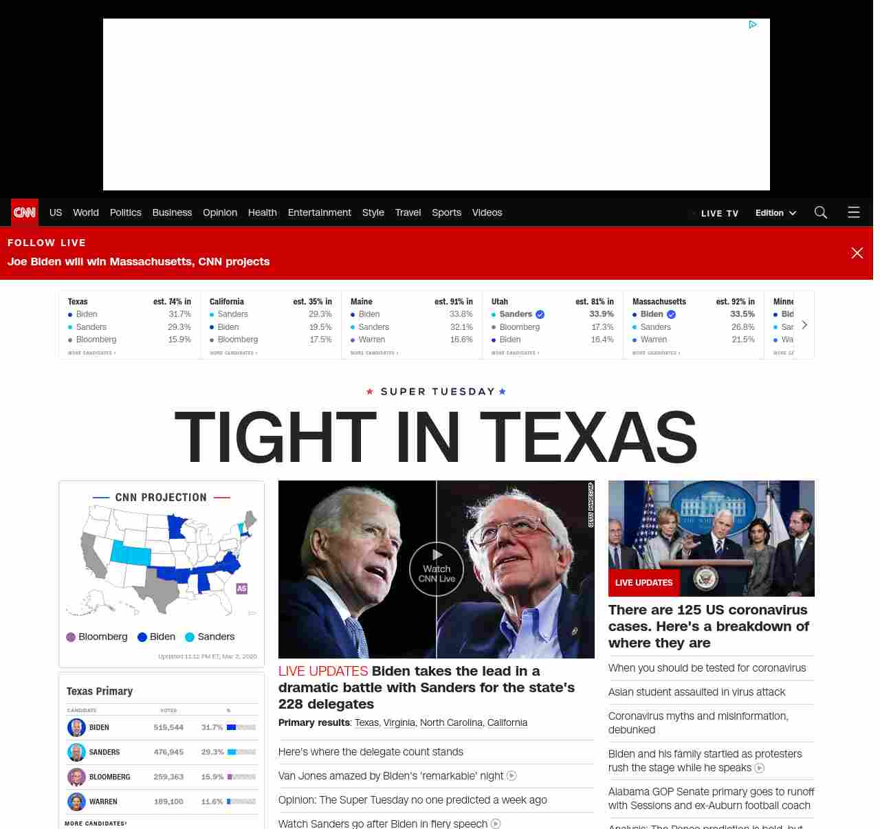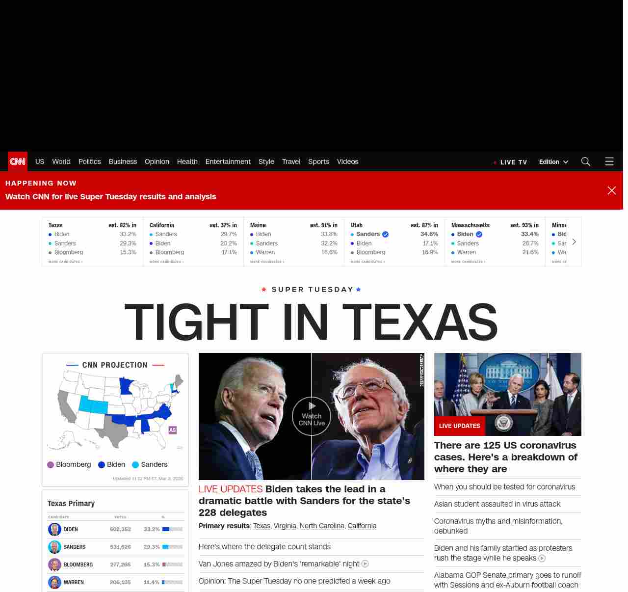 || banner-text–maximized banner-text-size–char-17-uc”> TIGHT IN TEXAS ||” , title: “CNN – Breaking News, Latest News and Videos” , siblings: {“articleList”:[{“uri”:”/politics/live-news/super-tuesday-results-2020/index.html”,”headline”:”u003cstrong>Biden takes the lead in a dramatic battle with Sanders for the state’s 228 delegatesu003c/strong>”,”thumbnail”:”//cdn.cnn.com/cnnnext/dam/assets/200304001645-09-biden-sanders-split-small-11.jpg”,”duration”:””,”description”:”u003cstrong>Primary resultsu003c/strong>: u003ca href=”http://www.cnn.com/2020/03/03/politics/texas-primary-results-live/index.html” target=”_blank”>Texasu003c/a>, u003ca href=”http://www.cnn.com/2020/03/03/politics/virginia-primary-results-live/index.html” target=”_blank”>Virginiau003c/a>, u003ca href=”https://www.cnn.com/2020/03/03/politics/north-carolina-primary-results-live/index.html” target=”_blank”>North Carolinau003c/a>, u003ca href=”http://www.cnn.com/2020/03/03/politics/california-primary-results-live/index.html” target=”_blank”>Californiau003c/a>”,”layout”:””