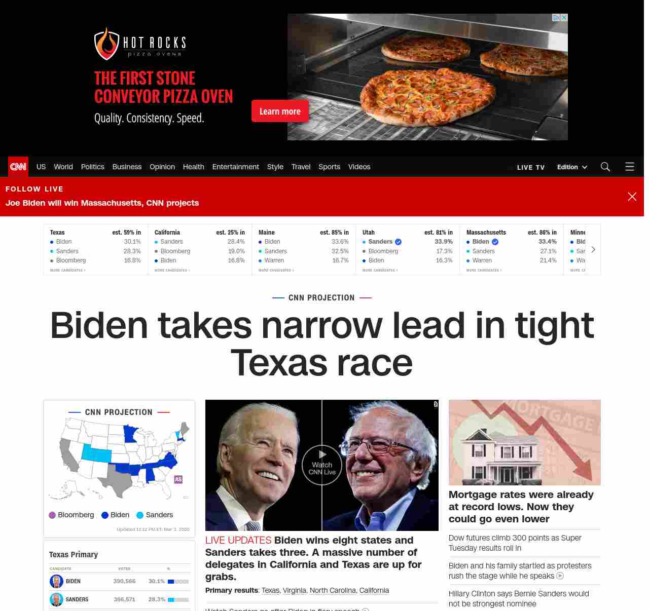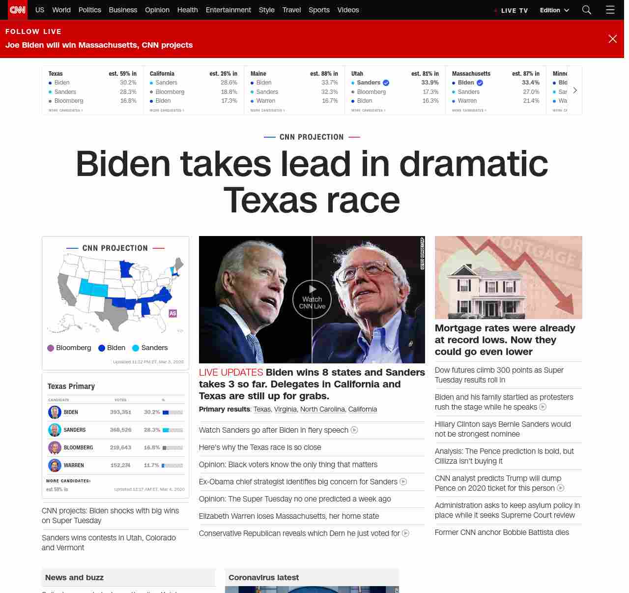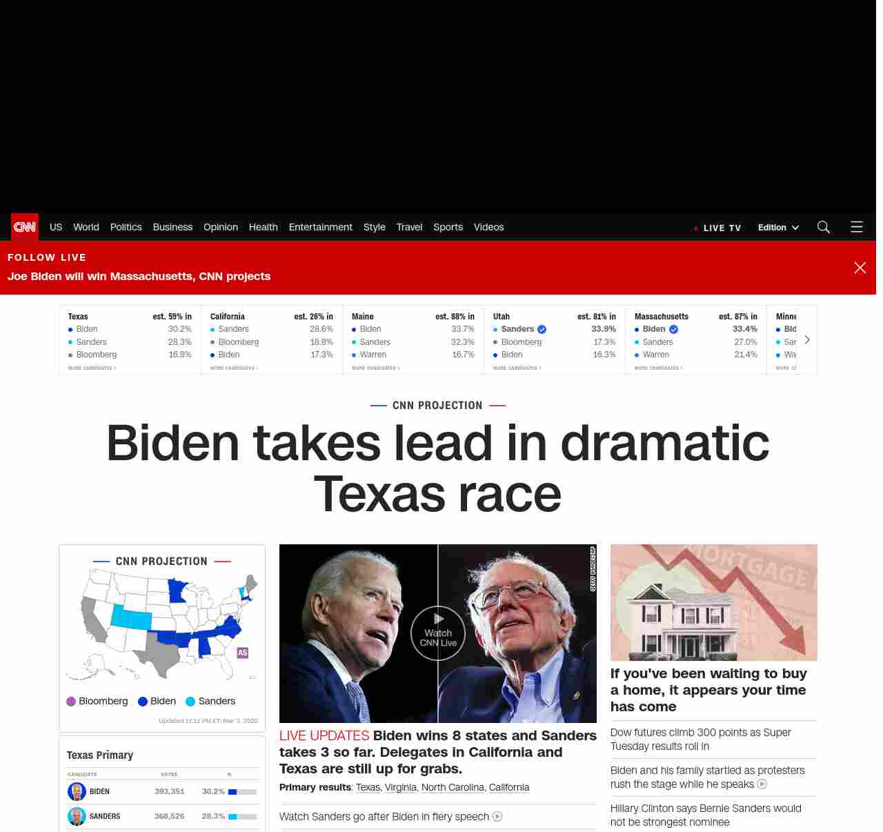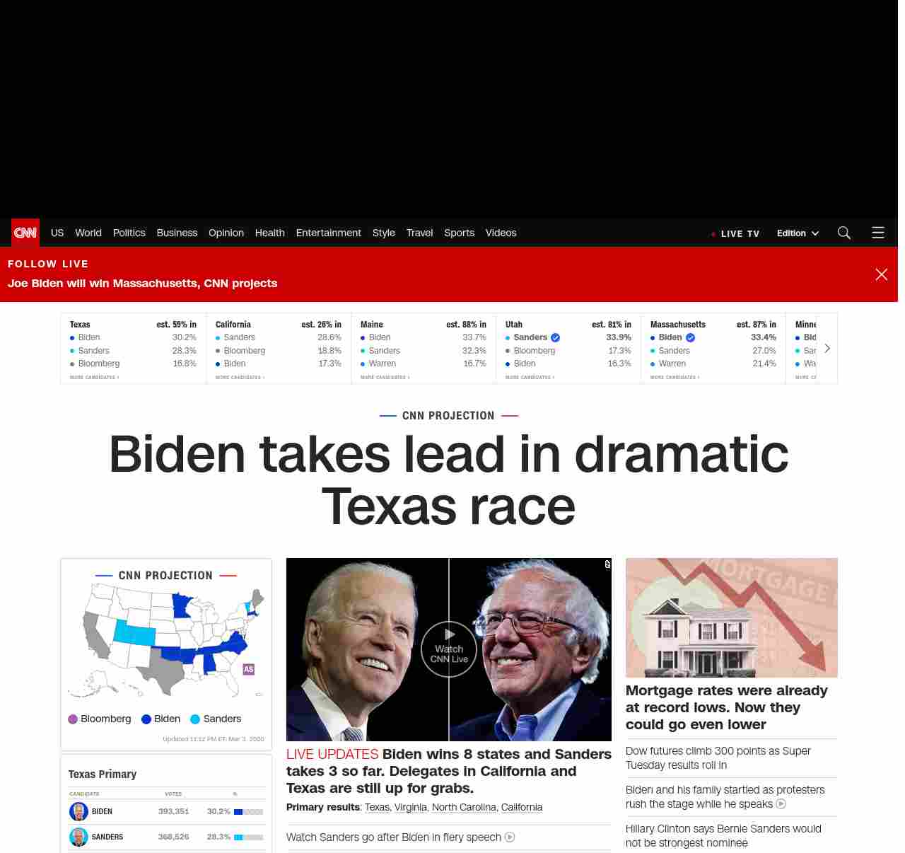 || banner-text–natural”> Biden takes lead in dramatic Texas race ||” , title: “CNN – Breaking News, Latest News and Videos” , siblings: {“articleList”:[{“uri”:”/2020/03/03/politics/super-tuesday-democratic-primary-2020/index.html”,”headline”:”CNN projects: Biden shocks with big wins on Super Tuesday”,”thumbnail”:”//cdn.cnn.com/cnnnext/dam/assets/200303191234-01-biden-0302-small-11.jpg”,”duration”:””,”description”:”Former Vice President u003ca href=”https://www.cnn.com/election/2020/candidate/biden” target=”_blank”>Joe Bidenu003c/a> grabbed u003ca href=”https://cnn.it/3aiZUfo” target=”_blank”>two huge early wins on Super Tuesdayu003c/a>, winning the Virginia and North Carolina Democratic primaries, CNN projects, u003ca href=”https://www.cnn.com/2020/03/03/politics/super-tuesday-polls-voting/index.html” target=”_blank”>confirming that his comeback momentumu003c/a> is for real on the most crucial night yet in the 2020 election.”,”layout”:””