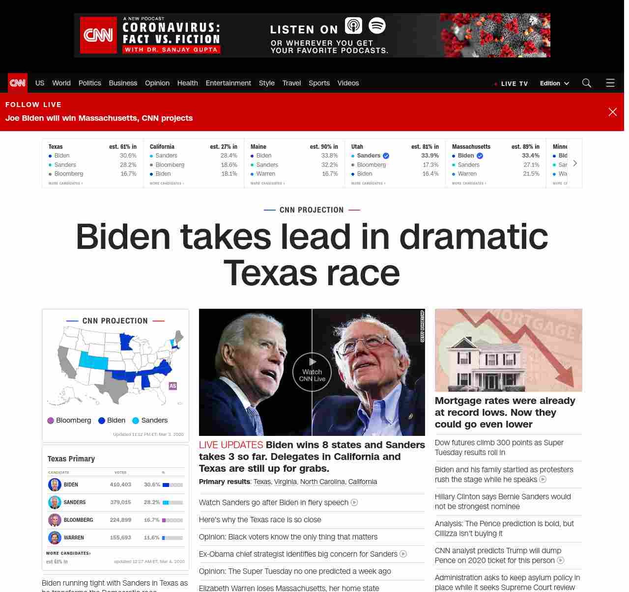 || banner-text–natural”> Biden takes lead in dramatic Texas race ||” , title: “CNN – Breaking News, Latest News and Videos” , siblings: {“articleList”:[{“uri”:”/2020/03/03/politics/super-tuesday-democratic-primary-2020/index.html”,”headline”:”Biden running tight with Sanders in Texas as he transforms the Democratic race”,”thumbnail”:”//cdn.cnn.com/cnnnext/dam/assets/200303191234-01-biden-0302-small-11.jpg”,”duration”:””,”description”:”Former Vice President u003ca href=”https://www.cnn.com/election/2020/candidate/biden” target=”_blank”>Joe Bidenu003c/a> grabbed u003ca href=”https://cnn.it/3aiZUfo” target=”_blank”>two huge early wins on Super Tuesdayu003c/a>, winning the Virginia and North Carolina Democratic primaries, CNN projects, u003ca href=”https://www.cnn.com/2020/03/03/politics/super-tuesday-polls-voting/index.html” target=”_blank”>confirming that his comeback momentumu003c/a> is for real on the most crucial night yet in the 2020 election.”,”layout”:””