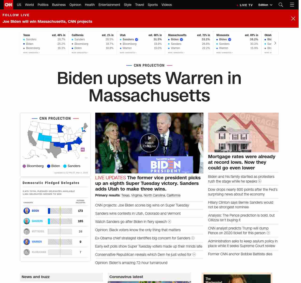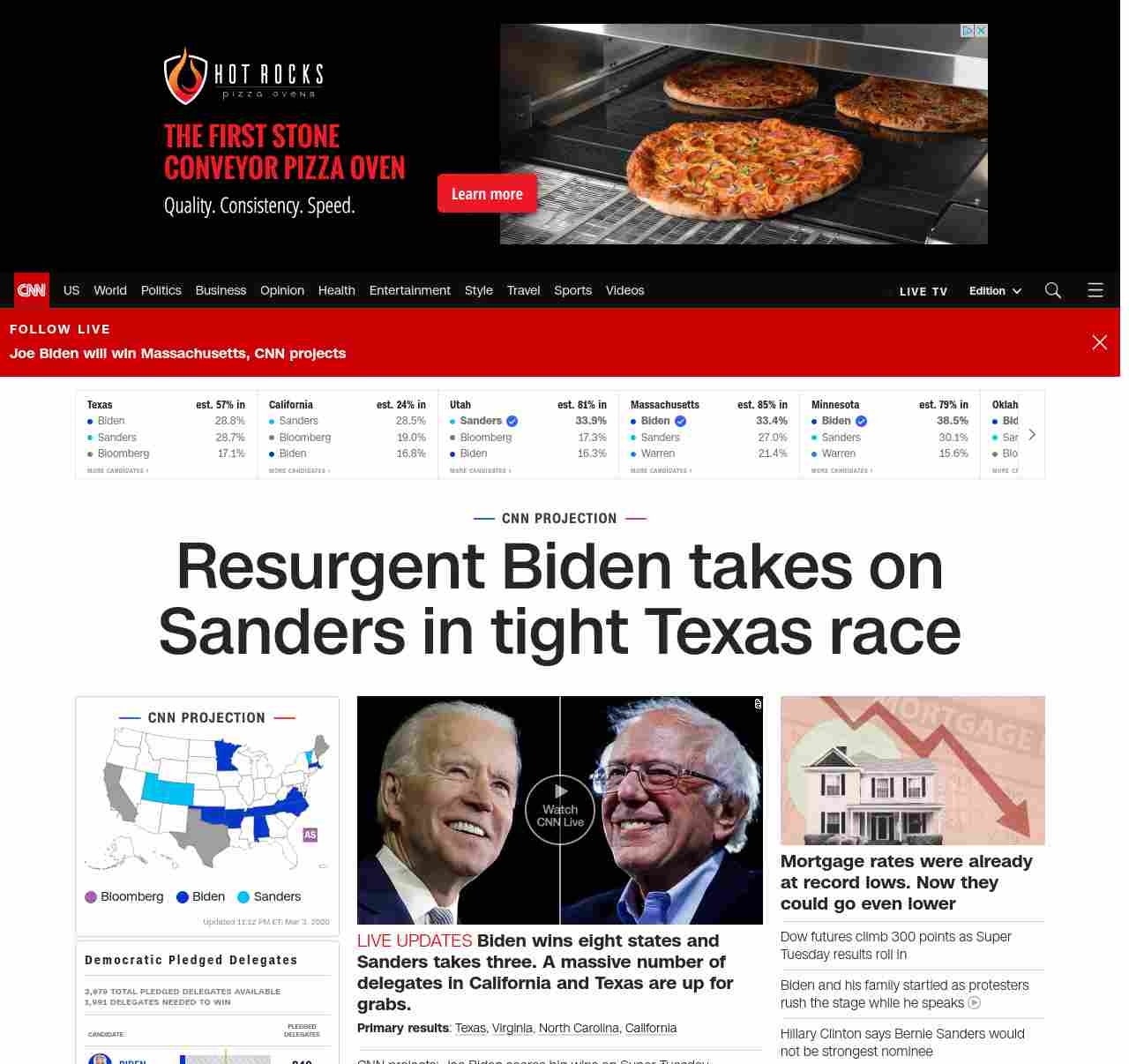 CNN3: “:”u003cstrong>Biden wins 8 states and Sanders takes three. A massive number of delegates in California and Texas are up for grabs.u003c/strong>”, “BANNER=|pagerendered| ((lubuntu at wor3))