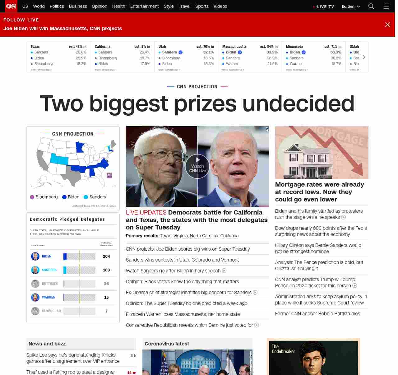 || banner-text–natural”> Two biggest prizes undecided ||” , title: “CNN – Breaking News, Latest News and Videos” , siblings: {“articleList”:[{“uri”:”/politics/live-news/super-tuesday-results-2020/index.html”,”headline”:”u003cstrong>Democrats battle for California and Texas, the states with the most delegates on Super Tuesday u003c/strong>”,”thumbnail”:”//cdn.cnn.com/cnnnext/dam/assets/200303173819-02-sanders-biden-split-small-11.jpg”,”duration”:””,”description”:”u003cstrong>Primary resultsu003c/strong>: u003ca href=”http://www.cnn.com/2020/03/03/politics/texas-primary-results-live/index.html” target=”_blank”>Texasu003c/a>, u003ca href=”http://www.cnn.com/2020/03/03/politics/virginia-primary-results-live/index.html” target=”_blank”>Virginiau003c/a>, u003ca href=”https://www.cnn.com/2020/03/03/politics/north-carolina-primary-results-live/index.html” target=”_blank”>North Carolinau003c/a>, u003ca href=”http://www.cnn.com/2020/03/03/politics/california-primary-results-live/index.html” target=”_blank”>Californiau003c/a>”,”layout”:””