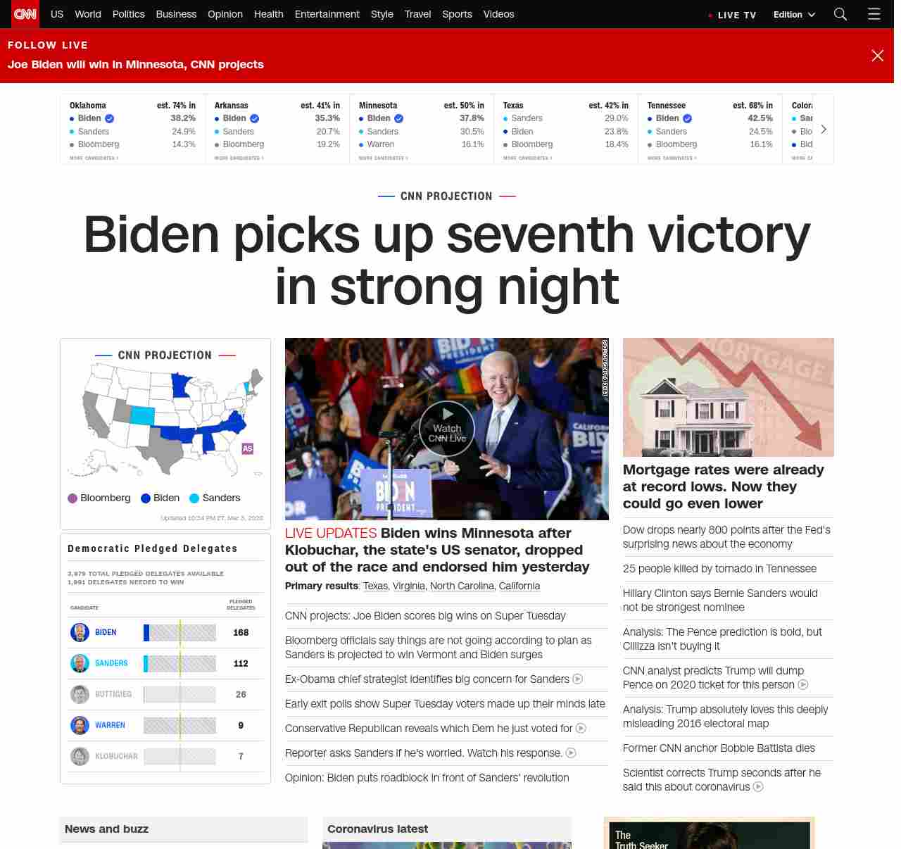 || banner-text–natural”> Biden picks up seventh victory in strong night ||” , title: “CNN – Breaking News, Latest News and Videos” , siblings: {“articleList”:[{“uri”:”/politics/live-news/super-tuesday-results-2020/index.html”,”headline”:”u003cstrong>Biden wins Minnesota after Klobuchar, the state’s US senator, dropped out of the race and endorsed him yesterdayu003c/strong>”,”thumbnail”:”//cdn.cnn.com/cnnnext/dam/assets/200303224514-05-biden-super-tuesday-0303-small-11.jpg”,”duration”:””,”description”:”u003cstrong>Primary resultsu003c/strong>: u003ca href=”http://www.cnn.com/2020/03/03/politics/texas-primary-results-live/index.html” target=”_blank”>Texasu003c/a>, u003ca href=”http://www.cnn.com/2020/03/03/politics/virginia-primary-results-live/index.html” target=”_blank”>Virginiau003c/a>, u003ca href=”https://www.cnn.com/2020/03/03/politics/north-carolina-primary-results-live/index.html” target=”_blank”>North Carolinau003c/a>, u003ca href=”http://www.cnn.com/2020/03/03/politics/california-primary-results-live/index.html” target=”_blank”>Californiau003c/a>”,”layout”:””