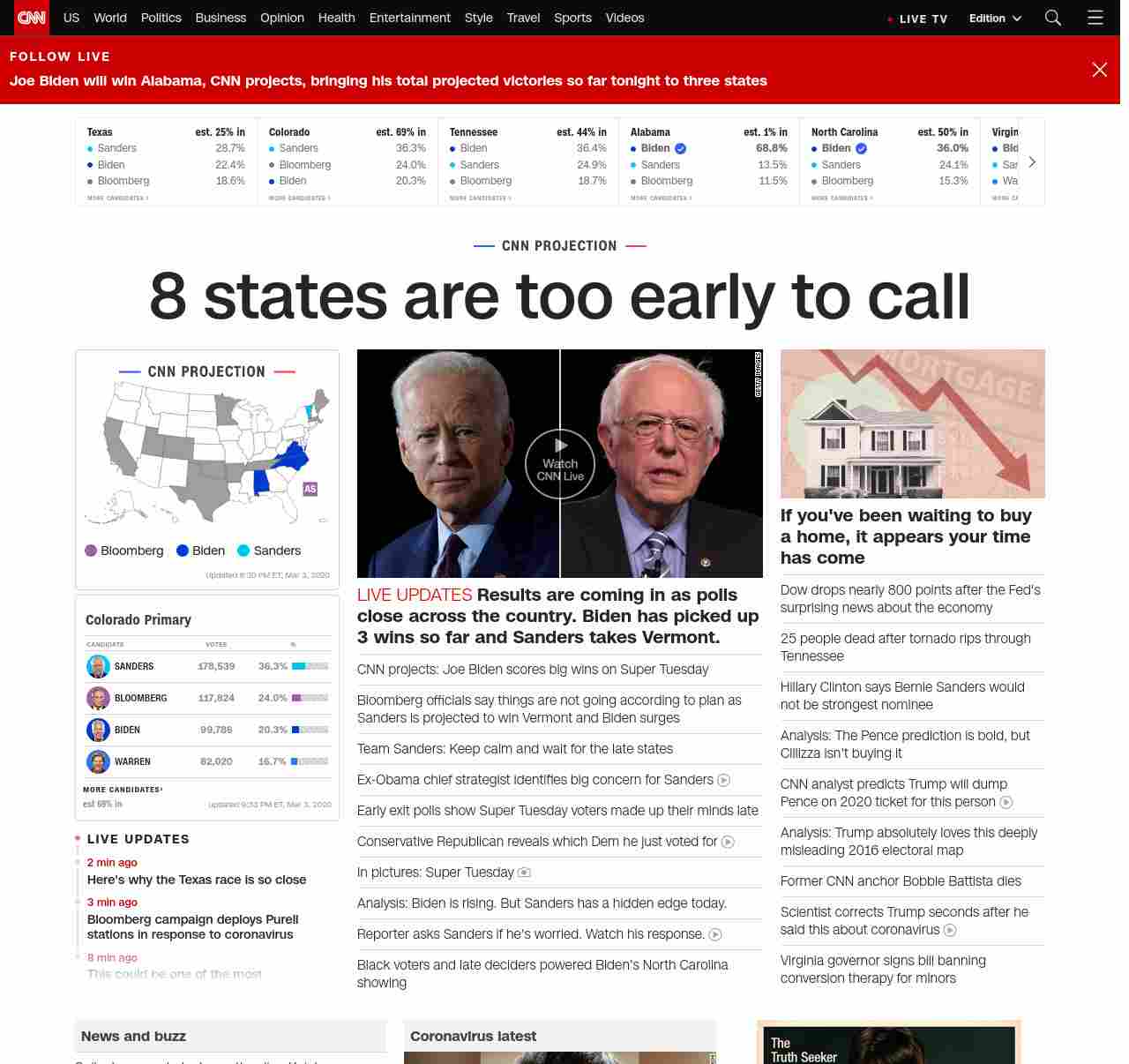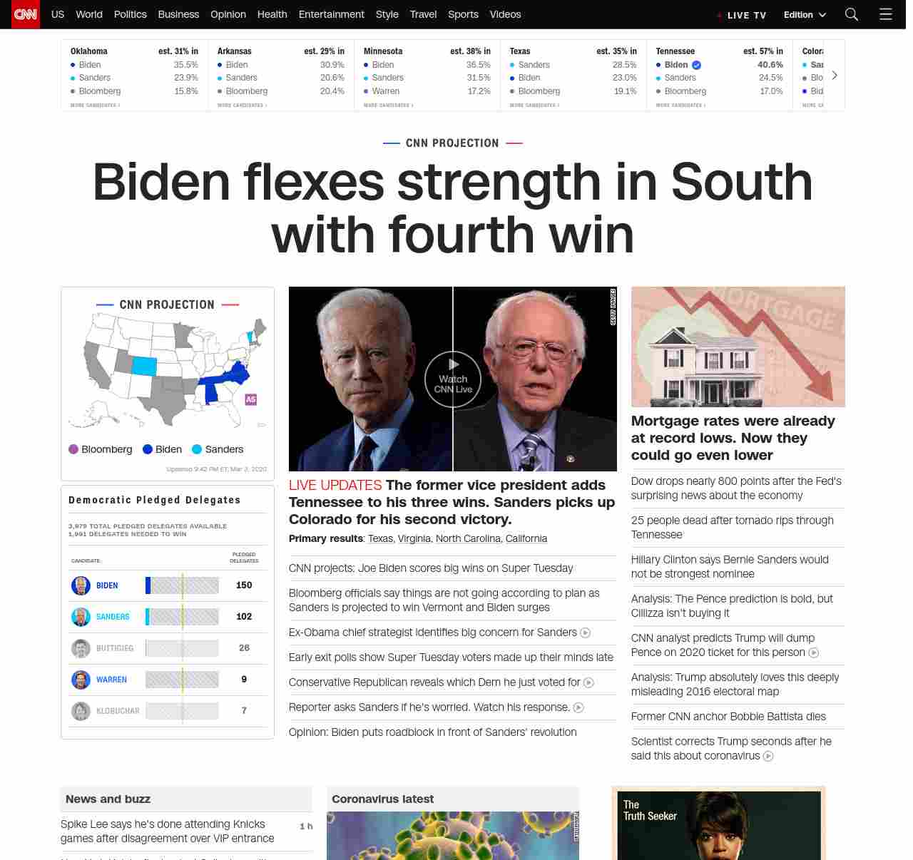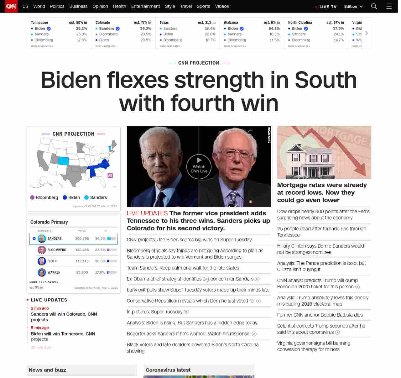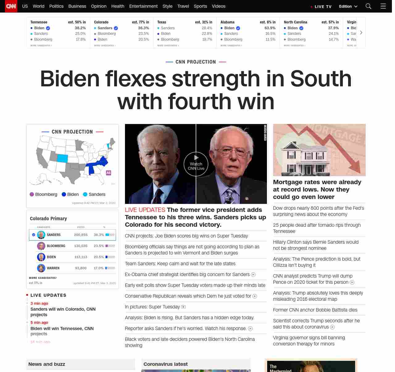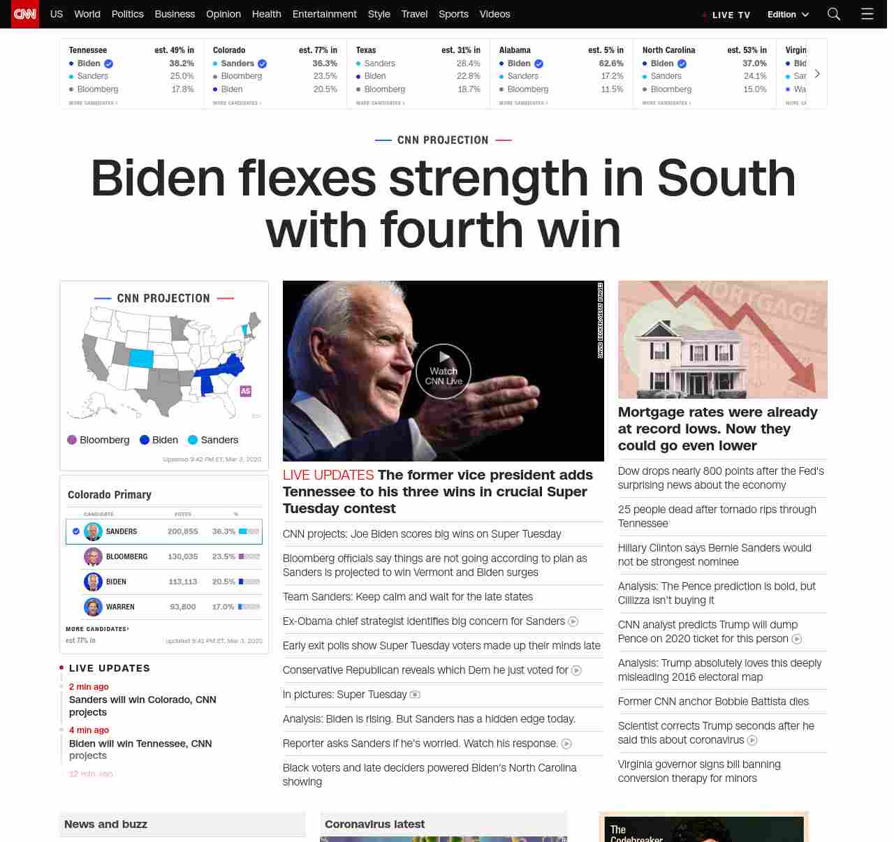 || banner-text–natural”> Biden flexes strength in South with fourth win ||” , title: “CNN – Breaking News, Latest News and Videos” , siblings: {“articleList”:[{“uri”:”/politics/live-news/super-tuesday-results-2020/index.html”,”headline”:”u003cstrong>The former vice president adds Tennessee to his three wins. Sanders picks up Colorado for his second victory. u003c/strong>”,”thumbnail”:”//cdn.cnn.com/cnnnext/dam/assets/200303181313-04-biden-sanders-split-small-11.jpg”,”duration”:””,”description”:”u003cstrong>Primary resultsu003c/strong>: u003ca href=”http://www.cnn.com/2020/03/03/politics/texas-primary-results-live/index.html” target=”_blank”>Texasu003c/a>, u003ca href=”http://www.cnn.com/2020/03/03/politics/virginia-primary-results-live/index.html” target=”_blank”>Virginiau003c/a>, u003ca href=”https://www.cnn.com/2020/03/03/politics/north-carolina-primary-results-live/index.html” target=”_blank”>North Carolinau003c/a>, u003ca href=”http://www.cnn.com/2020/03/03/politics/california-primary-results-live/index.html” target=”_blank”>Californiau003c/a>”,”layout”:””