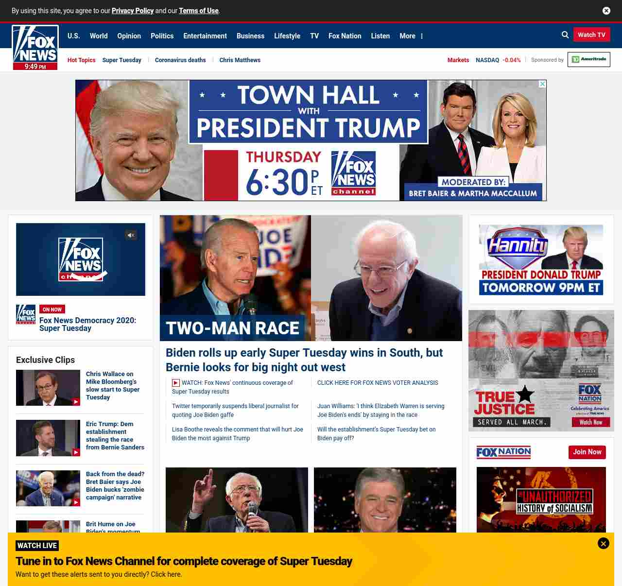 FN: [[TWO-MAN RACE]] Biden rolls up early Super Tuesday wins in South, but Bernie looks for big night out west ((lubuntu at wor3))