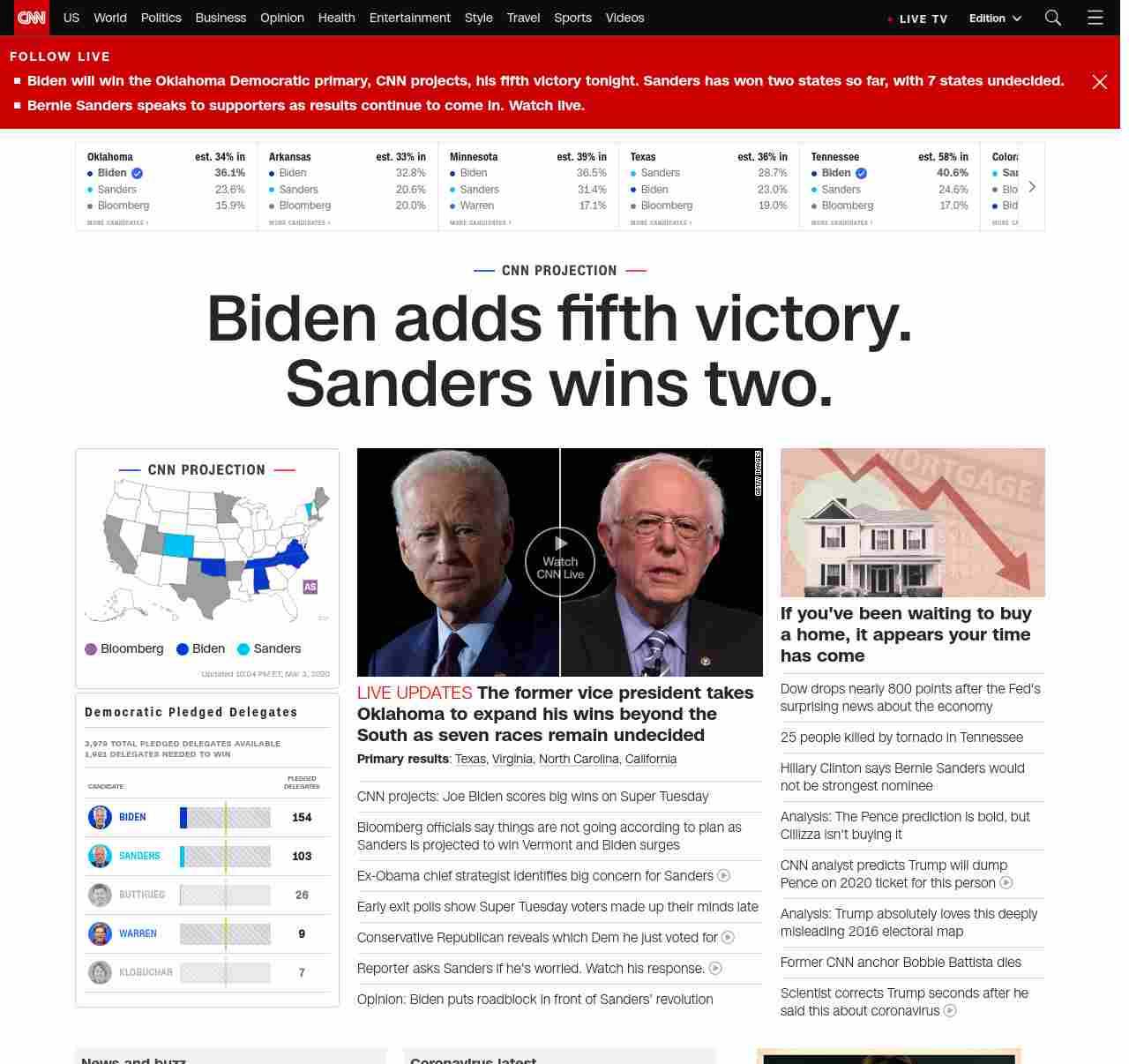 || banner-text–natural”> Biden adds fifth victory. Sanders wins two. ||” , title: “CNN – Breaking News, Latest News and Videos” , siblings: {“articleList”:[{“uri”:”/politics/live-news/super-tuesday-results-2020/index.html”,”headline”:”u003cstrong>The former vice president takes Oklahoma to expand his wins beyond the South as seven races remain undecidedu003c/strong>”,”thumbnail”:”//cdn.cnn.com/cnnnext/dam/assets/200303181313-04-biden-sanders-split-small-11.jpg”,”duration”:””,”description”:”u003cstrong>Primary resultsu003c/strong>: u003ca href=”http://www.cnn.com/2020/03/03/politics/texas-primary-results-live/index.html” target=”_blank”>Texasu003c/a>, u003ca href=”http://www.cnn.com/2020/03/03/politics/virginia-primary-results-live/index.html” target=”_blank”>Virginiau003c/a>, u003ca href=”https://www.cnn.com/2020/03/03/politics/north-carolina-primary-results-live/index.html” target=”_blank”>North Carolinau003c/a>, u003ca href=”http://www.cnn.com/2020/03/03/politics/california-primary-results-live/index.html” target=”_blank”>Californiau003c/a>”,”layout”:””