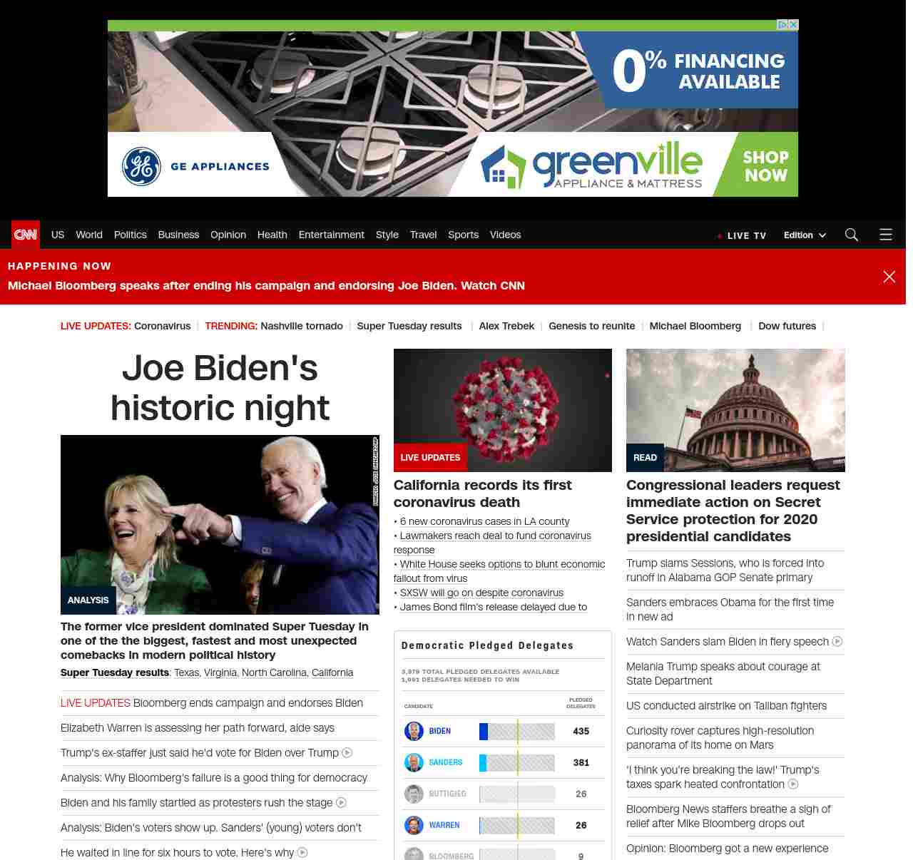 || banner-text–natural”> Bloomberg ends his campaign and endorses Biden ||” , title: “CNN – Breaking News, Latest News and Videos” , siblings: {“articleList”:[{“uri”:”/2020/03/04/politics/joe-biden-super-tuesday-historic-comeback/index.html”,”headline”:”u003cstrong>The former vice president dominated Super Tuesday in one of the the biggest, fastest and most unexpected comebacks in modern political historyu003c/strong>”,”thumbnail”:”//cdn.cnn.com/cnnnext/dam/assets/200304002248-52-super-tuesday-0303-bidens-happy-small-11.jpg”,”duration”:””,”description”:”u003ca href=”https://www.preview.cnn.com/2020/03/04/politics/super-tuesday-results-by-state/index.html” target=”_blank”>u003cstrong>Super Tuesday resultsu003c/strong>u003c/a>: u003ca href=”http://www.cnn.com/2020/03/03/politics/texas-primary-results-live/index.html” target=”_blank”>Texasu003c/a>, u003ca href=”http://www.cnn.com/2020/03/03/politics/virginia-primary-results-live/index.html” target=”_blank”>Virginiau003c/a>, u003ca href=”https://www.cnn.com/2020/03/03/politics/north-carolina-primary-results-live/index.html” target=”_blank”>North Carolinau003c/a>, u003ca href=”http://www.cnn.com/2020/03/03/politics/california-primary-results-live/index.html” target=”_blank”>Californiau003c/a>”,”layout”:””