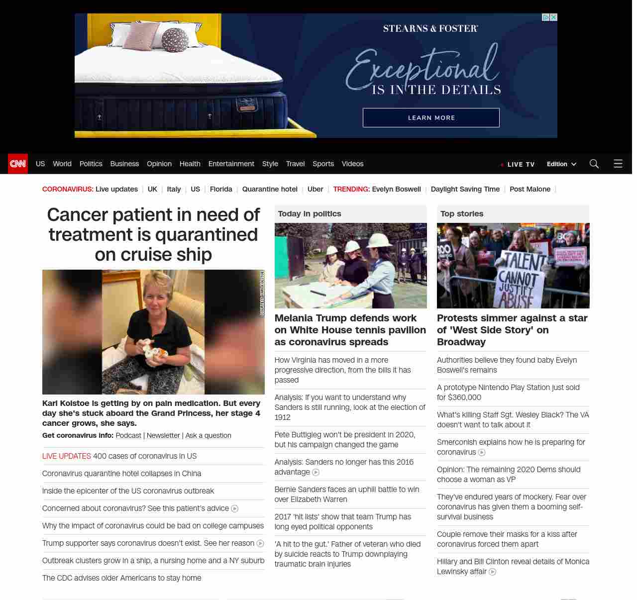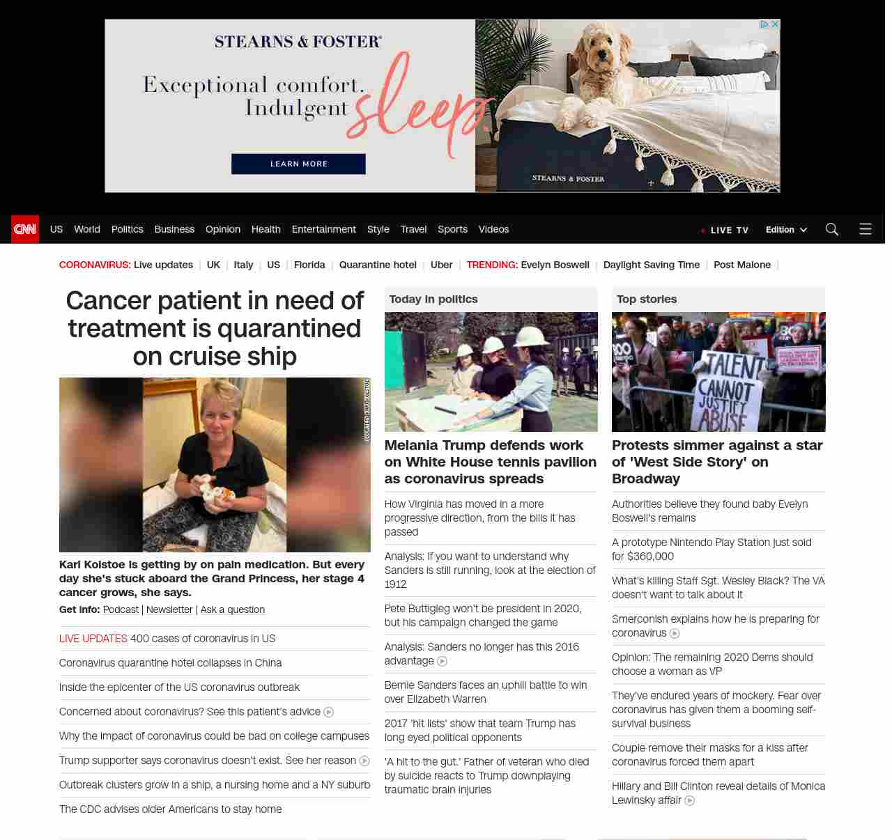 || screaming-banner-text banner-text-size–char-47″ data-analytics=”_list-hierarchical-xs_article_”> Cancer patient in need of treatment is quarantined on cruise ship ||” , title: “CNN – Breaking News, Latest News and Videos” , siblings: {“articleList”:[{“uri”:”/2020/03/07/us/grand-princess-cancer-patient-stuck-trnd/index.html”,”headline”:”u003cstrong>Kari Kolstoe is getting by on pain medication. But every day she’s stuck aboard the Grand Princess, her stage 4 cancer grows, she says.u003c/strong>”,”thumbnail”:”//cdn.cnn.com/cnnnext/dam/assets/200307133003-01-grand-princess-cancer-patient-small-11.jpg”,”duration”:””,”description”:”u003cstrong>Get coronavirus info: u003c/strong>u003ca href=”https://www.cnn.com/audio/podcasts/corona-virus” target=”_blank”>Podcastu003c/a> | u003ca href=”https://www.cnn.com/specials/coronavirus-newsletter?utm_source=hp&source=hp” target=”_blank”>Newsletteru003c/a> | u003ca href=”https://www.cnn.com/2020/03/04/us/coronavirus-town-hall-questions/index.html” target=”_blank”>Ask a question u003c/a>”,”layout”:””