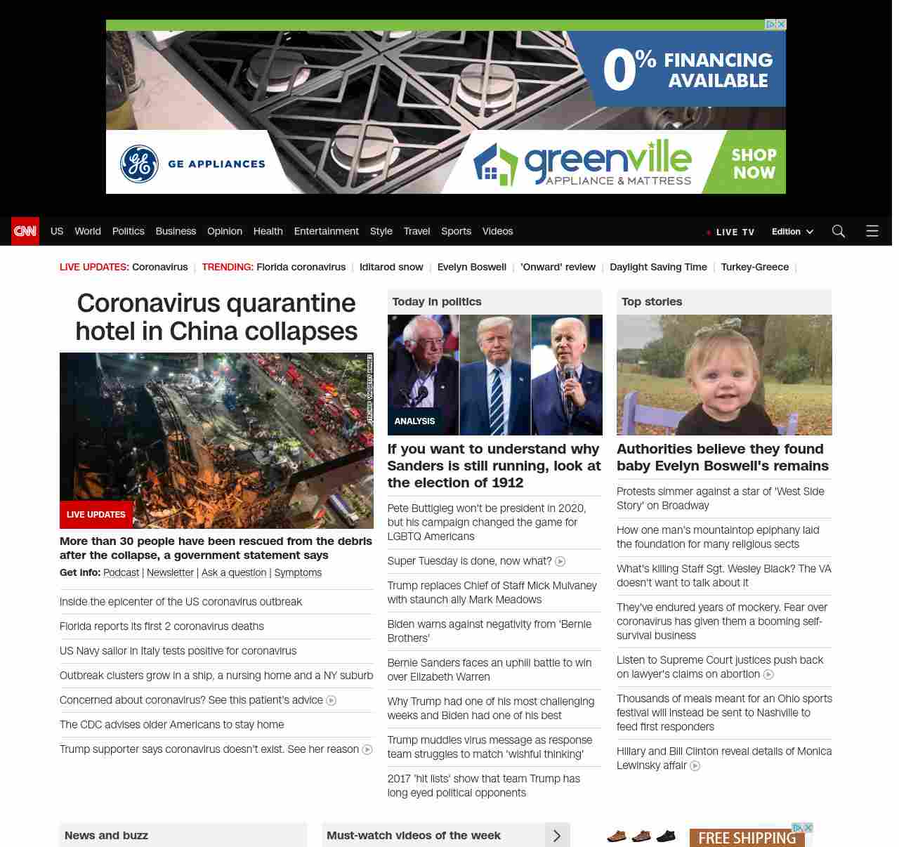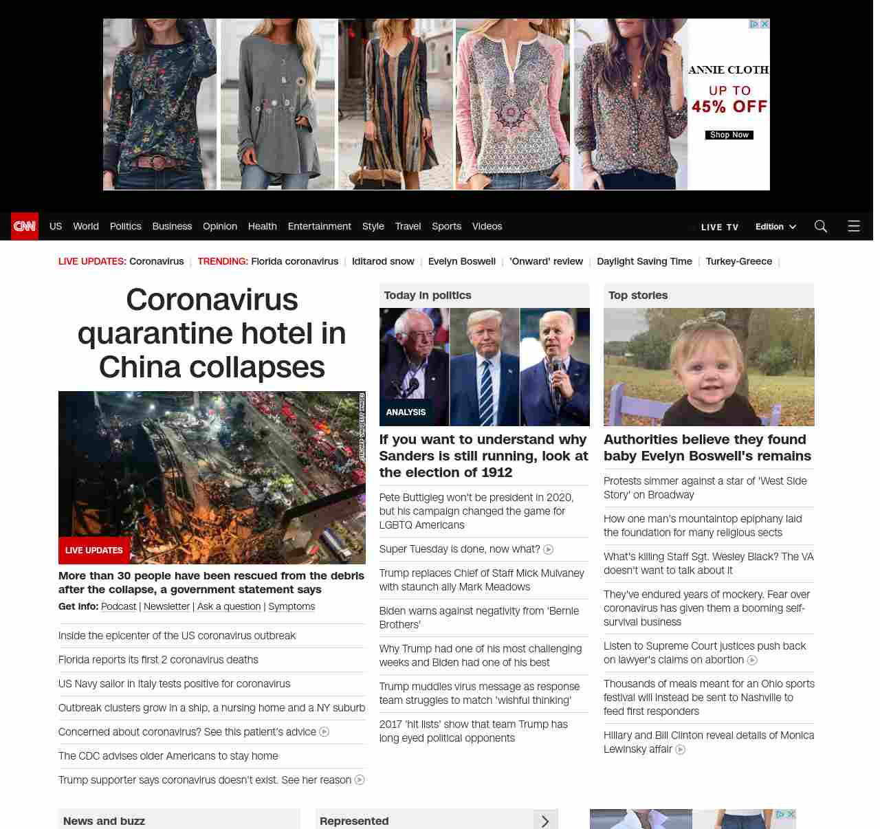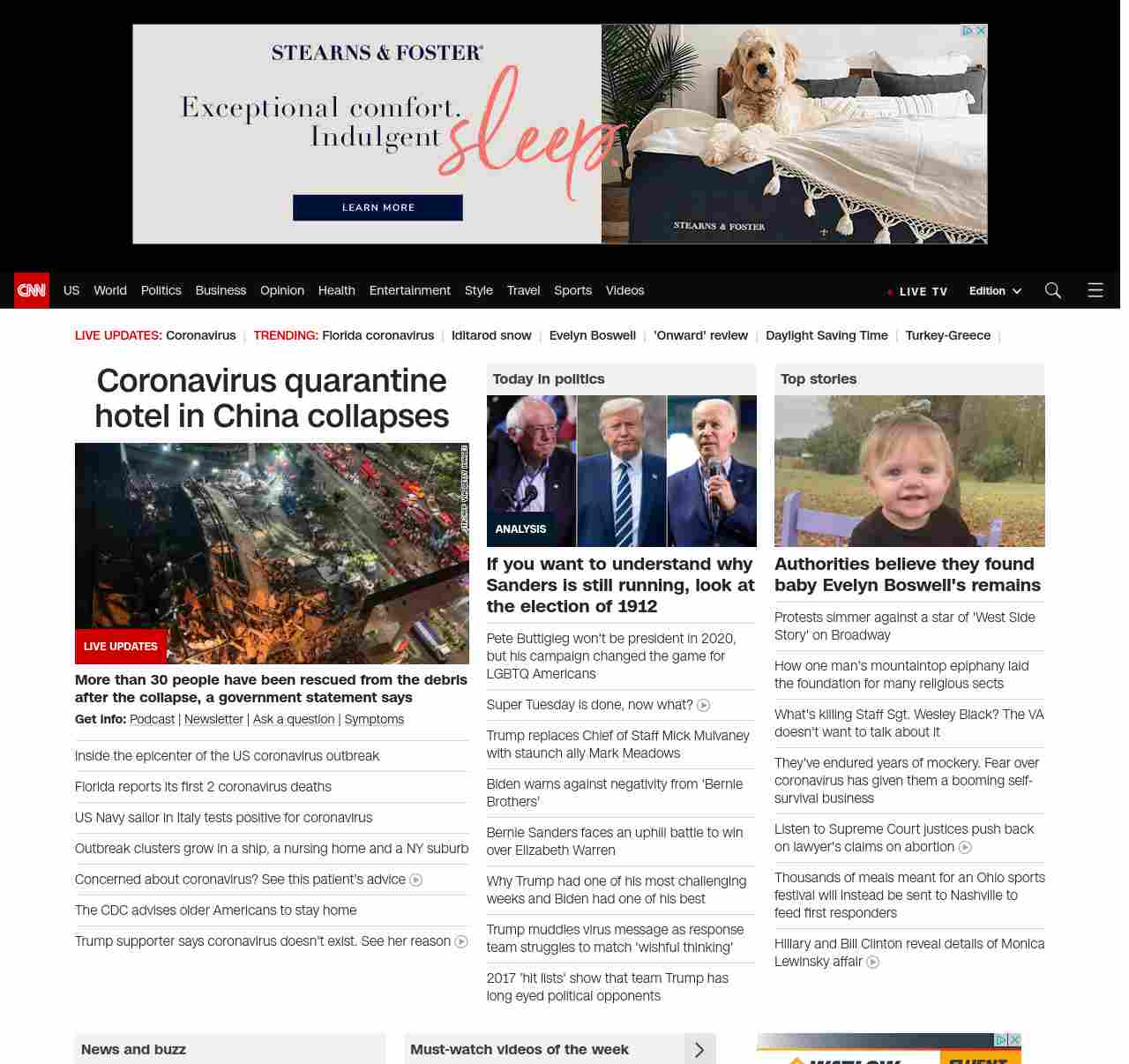 || screaming-banner-text banner-text-size–char-35″ data-analytics=”_list-hierarchical-xs_hyperlink_”> US coronavirus cases rise to 377 ||” , title: “CNN – Breaking News, Latest News and Videos” , siblings: {“articleList”:[{“uri”:”/2020/03/07/china/china-coronavirus-hotel-collapse/index.html”,”headline”:”Coronavirus quarantine hotel collapses in China”,”thumbnail”:”//cdn.cnn.com/cnnnext/dam/assets/200307105058-01-hotel-collapse-china-0307-small-11.jpg”,”duration”:””,”description”:”Search and rescue efforts are underway after about 70 people were trapped in a hotel collapse Saturday night in southeastern China, officials in the city of Quanzhou said. “,”layout”:””