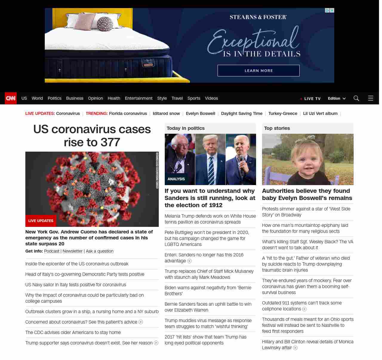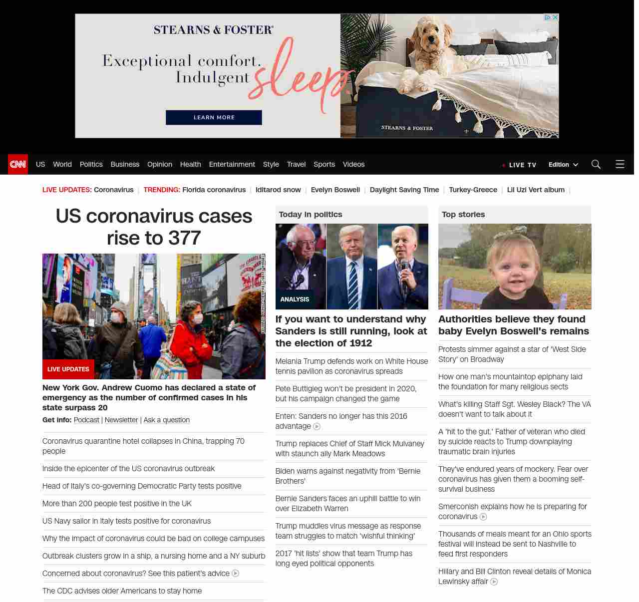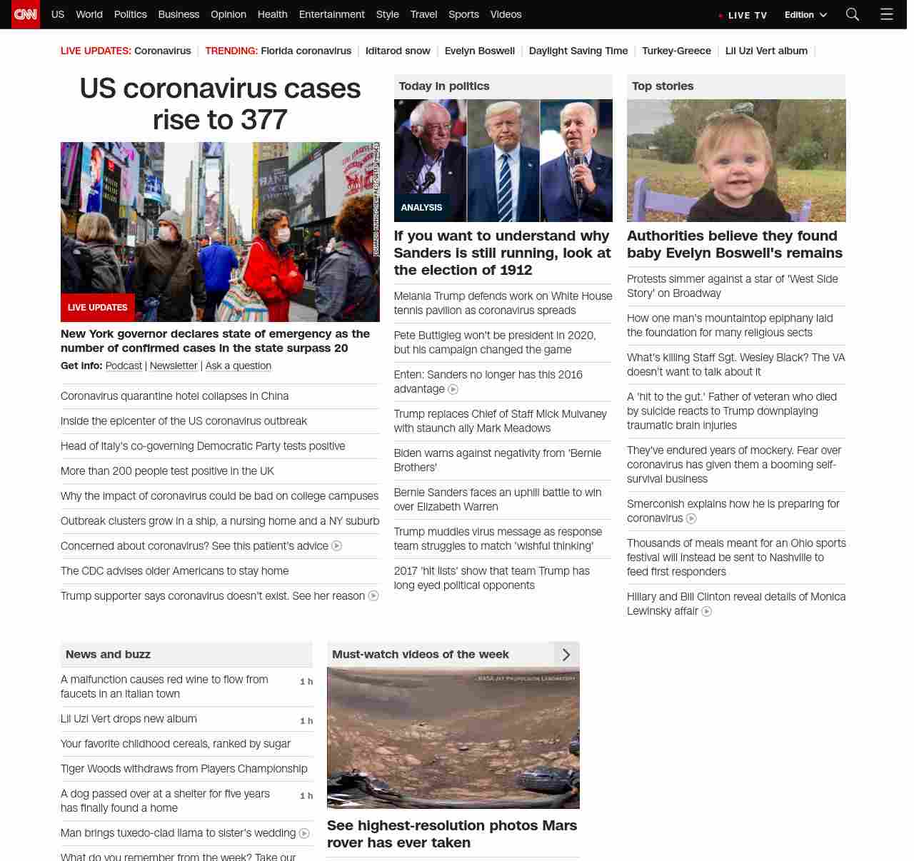 || screaming-banner-text banner-text-size–char-35″ data-analytics=”_list-hierarchical-xs_hyperlink_”> US coronavirus cases rise to 377 ||” , title: “CNN – Breaking News, Latest News and Videos” , siblings: {“articleList”:[{“uri”:”/2020/03/07/china/china-coronavirus-hotel-collapse/index.html”,”headline”:”Coronavirus quarantine hotel collapses in China, trapping 70 people”,”thumbnail”:”//cdn.cnn.com/cnnnext/dam/assets/200307105058-01-hotel-collapse-china-0307-small-11.jpg”,”duration”:””,”description”:”Search and rescue efforts are underway after about 70 people were trapped in a hotel collapse Saturday night in southeastern China, officials in the city of Quanzhou said. “,”layout”:””