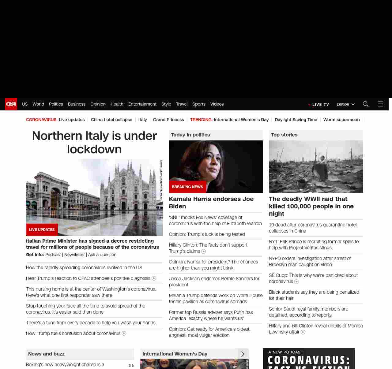 || screaming-banner-text banner-text-size–char-35″ data-analytics=”_list-hierarchical-xs_hyperlink_”> Northern Italy is under lockdown ||” , title: “CNN – Breaking News, Latest News and Videos” , siblings: {“articleList”:[{“uri”:”/2020/03/08/health/coronavirus-evolved/index.html”,”headline”:”How the rapidly-spreading coronavirus evolved in the US”,”thumbnail”:”//cdn.cnn.com/cnnnext/dam/assets/200306230756-01-kirkland-washington-coronavirus-0305-small-11.jpg”,”duration”:””,”description”:”Just a few days ago, on February 29, there was one confirmed death u003ca href=”http://www.cnn.com/2020/03/08/uk/coronavirus-gig-economy-gbr-intl/index.html” target=”_blank”>from coronavirusu003c/a> in the United States. Now u003ca href=”http://www.cnn.com/asia/live-news/coronavirus-outbreak-03-08-20-intl-hnk/index.html” target=”_blank”>the contagious and rapidly spreading virusu003c/a> has killed 19 people and affected more than 30 states and the District of Columbia, u003ca href=”http://www.cnn.com/2020/03/08/health/coronavirus-touching-your-face-trnd/index.html” target=”_blank”>turning into a health crisis. u003c/a>”,”layout”:””