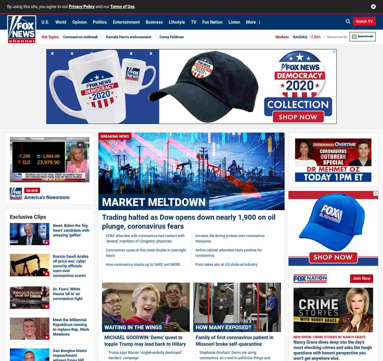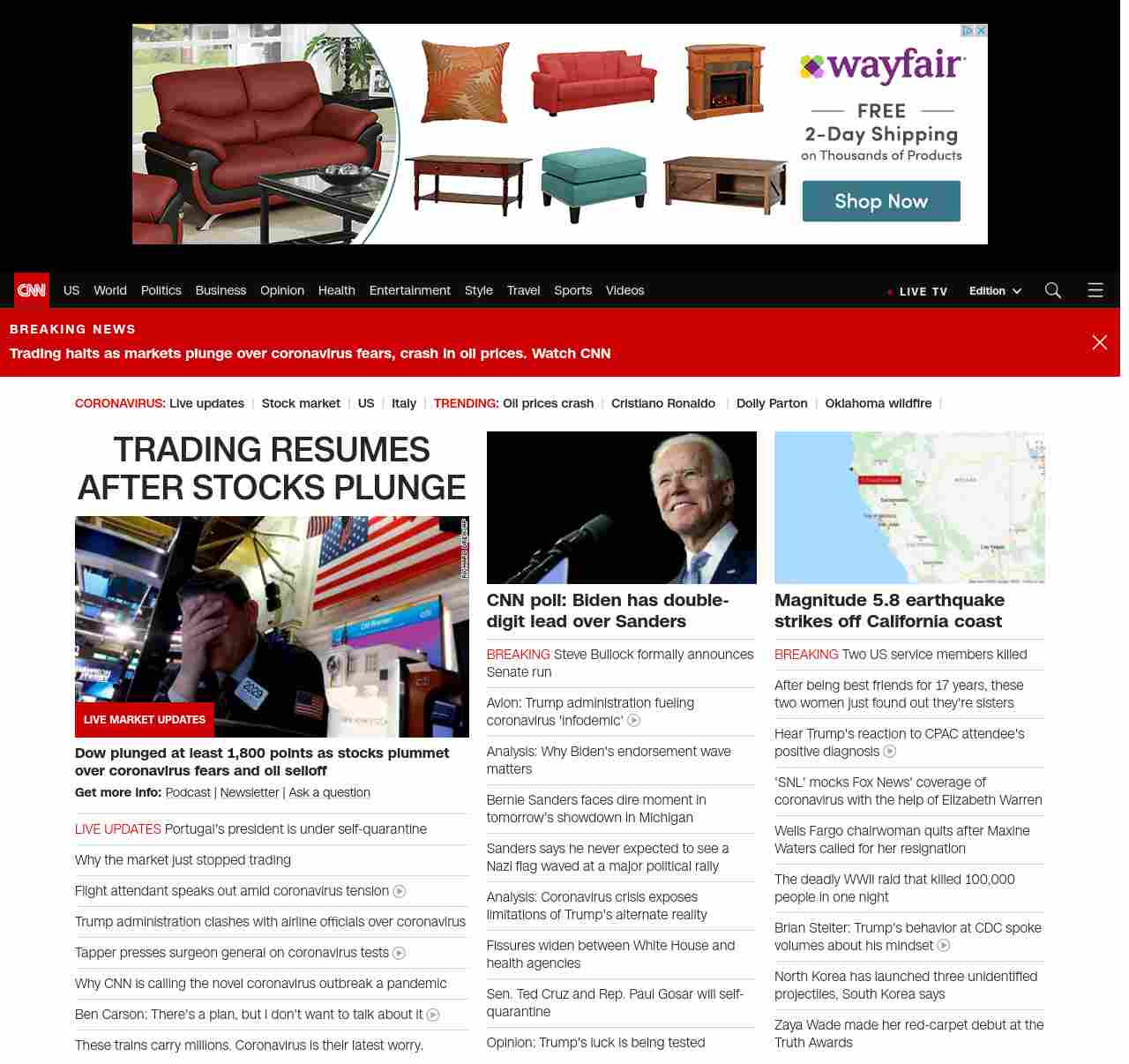 CNN3: “:”u003cstrong>Dow plunged at least 1, 800 points as stocks plummet over coronavirus fears and oil selloffu003c/strong>”, “BANNER=|pagerendered| ((lubuntu at wor3))