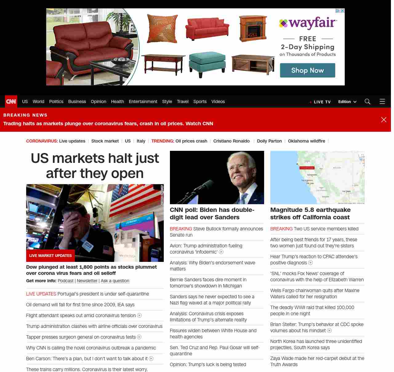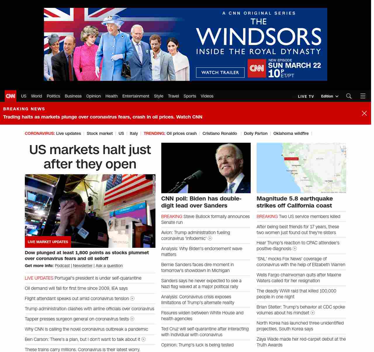 || screaming-banner-text banner-text-size–char-38″ data-analytics=”_list-hierarchical-xs_article_”> US markets halt just after they open ||” , title: “CNN – Breaking News, Latest News and Videos” , siblings: {“articleList”:[{“uri”:”/business/live-news/stock-market-news-today-030920/index.html”,”headline”:”u003cstrong>Dow plunged at least 1,800 points as stocks plummet over coronavirus fears and oil selloffu003c/strong>”,”thumbnail”:”//cdn.cnn.com/cnnnext/dam/assets/200309130928-09-stock-market-0309-new-york-small-11.jpg”,”duration”:””,”description”:”u003cstrong>Get more info: u003c/strong>u003ca href=”https://www.cnn.com/audio/podcasts/corona-virus” target=”_blank”>Podcastu003c/a> | u003ca href=”https://www.cnn.com/specials/coronavirus-newsletter?utm_source=hp&source=hp” target=”_blank”>Newsletteru003c/a> | u003ca href=”https://www.cnn.com/2020/03/04/us/coronavirus-town-hall-questions/index.html” target=”_blank”>Ask a question u003c/a>”,”layout”:””