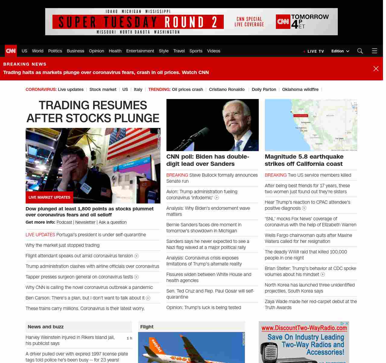 || screaming-banner-text banner-text-size–char-38-uc” data-analytics=”_list-hierarchical-xs_article_”> TRADING RESUMES AFTER STOCKS PLUNGE ||” , title: “CNN – Breaking News, Latest News and Videos” , siblings: {“articleList”:[{“uri”:”/business/live-news/stock-market-news-today-030920/index.html”,”headline”:”u003cstrong>Dow dropped at least 2,000 points over coronavirus fears and oil selloffu003c/strong>”,”thumbnail”:”//cdn.cnn.com/cnnnext/dam/assets/200309130928-09-stock-market-0309-new-york-small-11.jpg”,”duration”:””,”description”:”u003cstrong>Get more info: u003c/strong>u003ca href=”https://www.cnn.com/audio/podcasts/corona-virus” target=”_blank”>Podcastu003c/a> | u003ca href=”https://www.cnn.com/specials/coronavirus-newsletter?utm_source=hp&source=hp” target=”_blank”>Newsletteru003c/a> | u003ca href=”https://www.cnn.com/2020/03/04/us/coronavirus-town-hall-questions/index.html” target=”_blank”>Ask a question u003c/a>”,”layout”:””