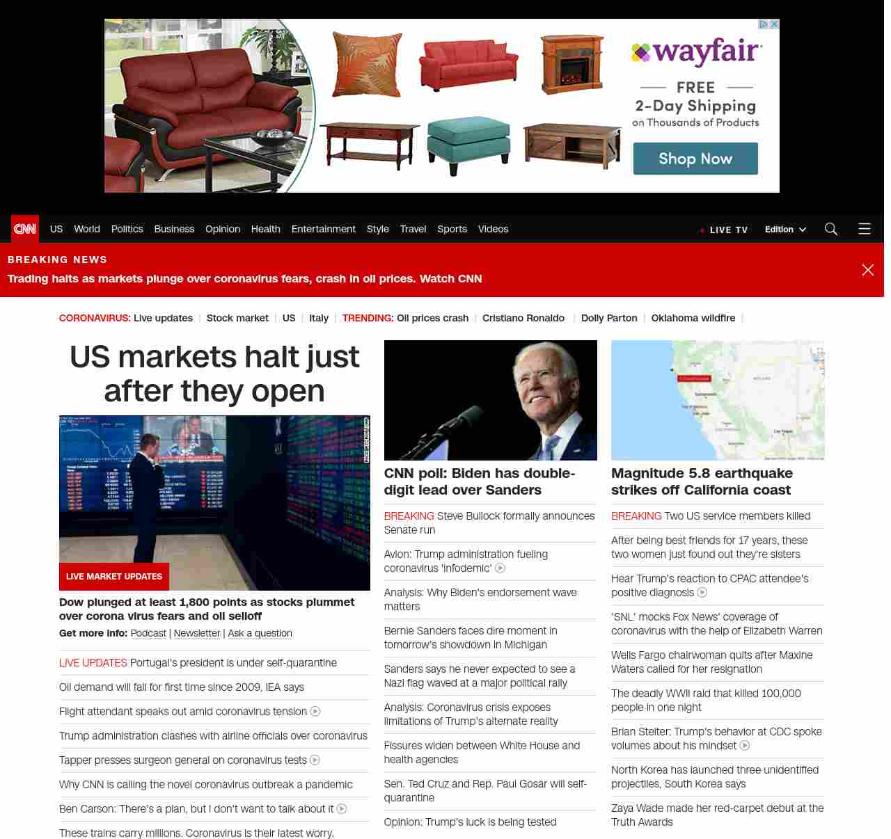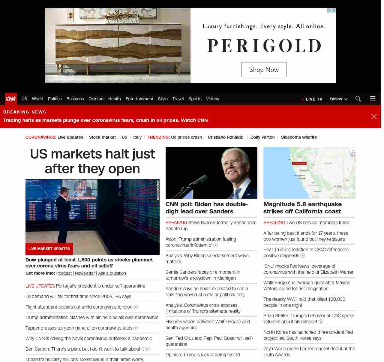 || screaming-banner-text banner-text-size–char-38″ data-analytics=”_list-hierarchical-xs_article_”> Trading halted at NYSE after 7% drop ||” , title: “CNN – Breaking News, Latest News and Videos” , siblings: {“articleList”:[{“uri”:”/business/live-news/stock-market-news-today-030920/index.html”,”headline”:”Dow plunged at least 1,800 points as stocks plummet over corona virus fears and oil selloff”,”thumbnail”:”//cdn.cnn.com/cnnnext/dam/assets/200309130928-09-stock-market-0309-new-york-small-11.jpg”,”duration”:””,”description”:”u003cstrong>Get more info: u003c/strong>u003ca href=”https://www.cnn.com/audio/podcasts/corona-virus” target=”_blank”>Podcastu003c/a> | u003ca href=”https://www.cnn.com/specials/coronavirus-newsletter?utm_source=hp&source=hp” target=”_blank”>Newsletteru003c/a> | u003ca href=”https://www.cnn.com/2020/03/04/us/coronavirus-town-hall-questions/index.html” target=”_blank”>Ask a question u003c/a>”,”layout”:””