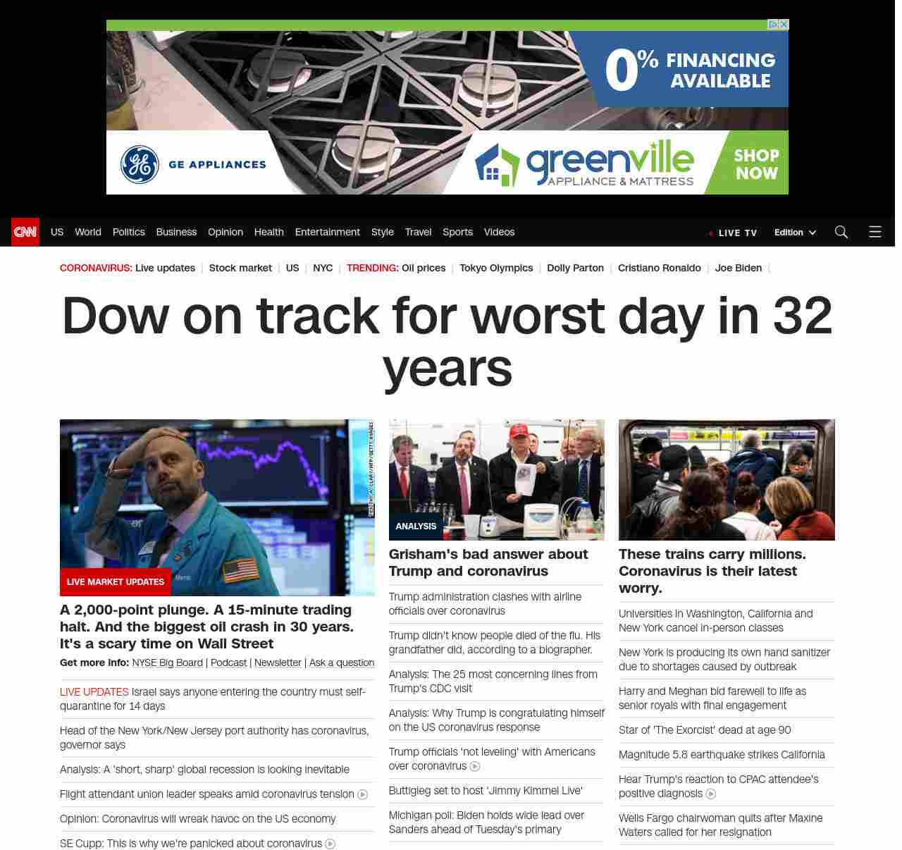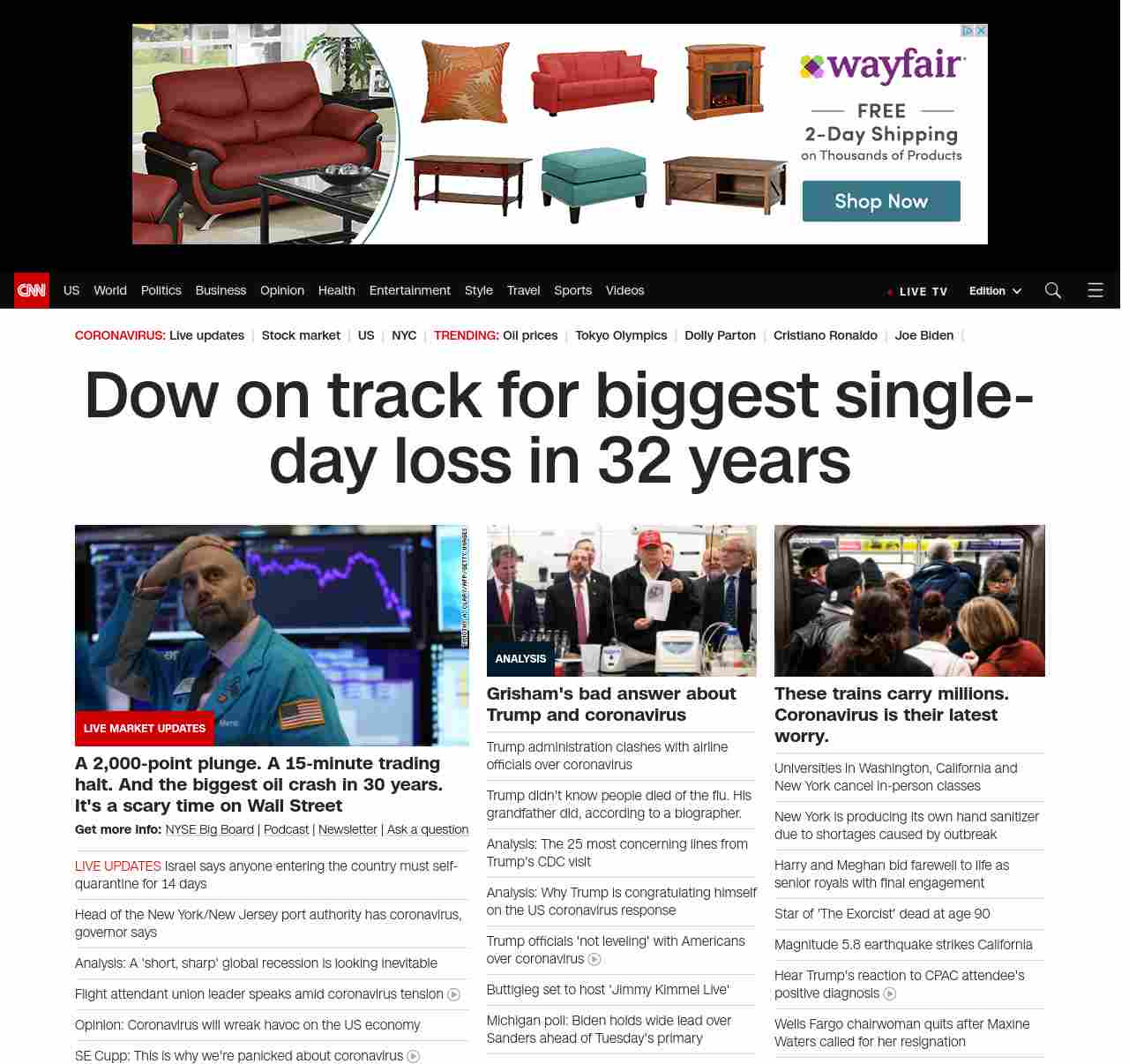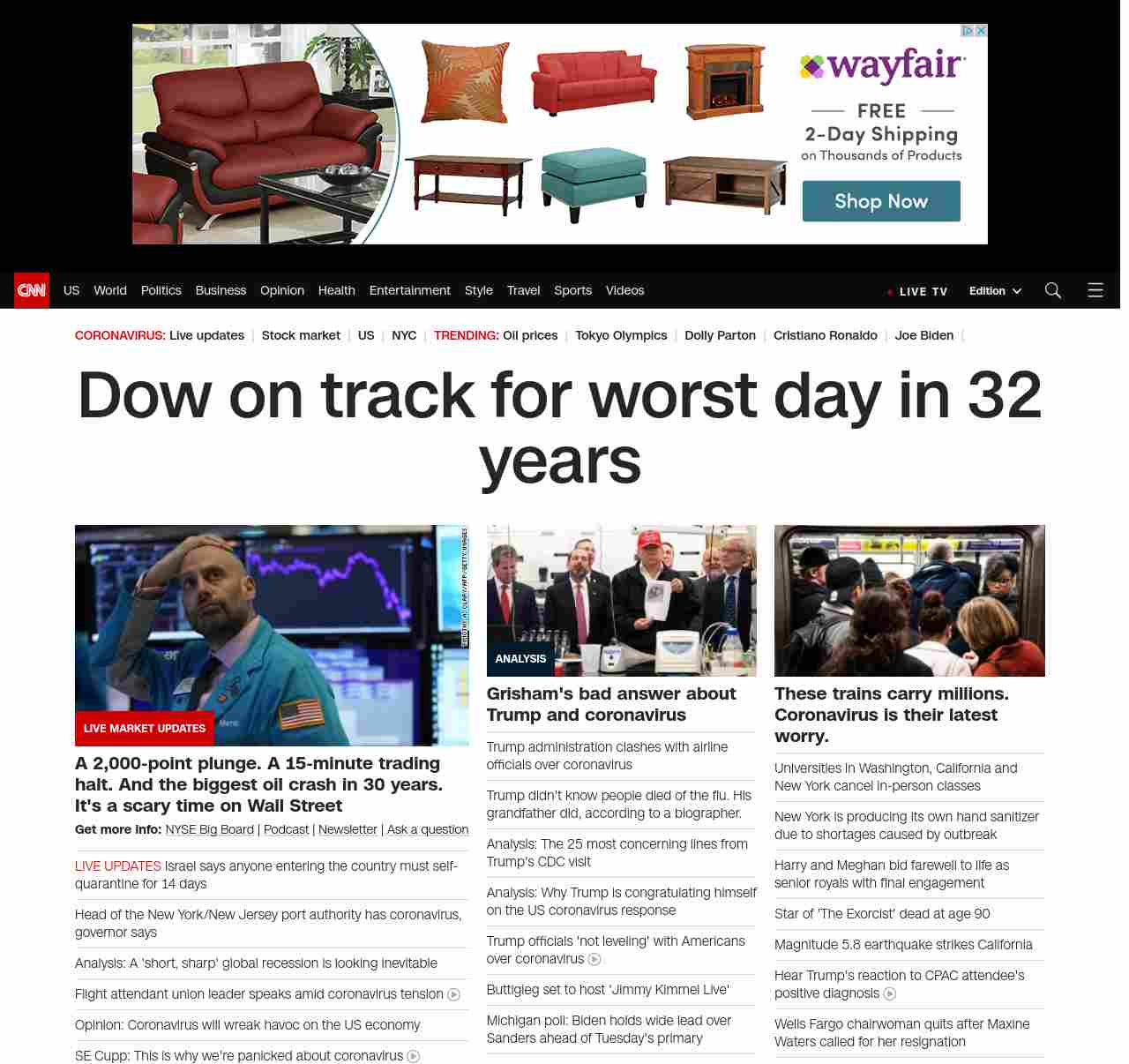 FN: [[MARKET MELTDOWN]] Dow plunges as much as 2, 000 points, oil crashes as price war erupts and coronavirus spreads ((lubuntu at wor3))