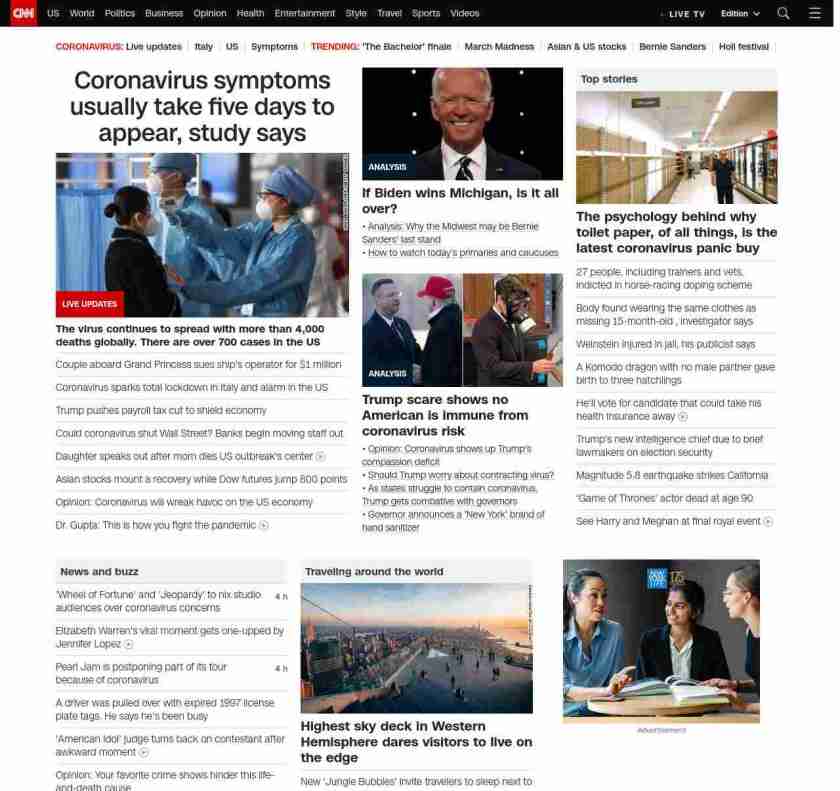 || screaming-banner-text banner-text-size–char-47″ data-analytics=”_list-hierarchical-xs_article_”> Coronavirus symptoms usually take five days to appear, study says ||” , title: “CNN – Breaking News, Latest News and Videos” , siblings: {“articleList”:[{“uri”:”/world/live-news/coronavirus-outbreak-03-10-20-intl-hnk/index.html”,”headline”:”u003cstrong>The virus continues to spread with more than 4,000 deaths globally. There are over 700 cases in the US u003c/strong>”,”thumbnail”:”//cdn.cnn.com/cnnnext/dam/assets/200310021636-coronavirus-beijing-0305-small-11.jpg”,”duration”:””,”description”:””,”layout”:””