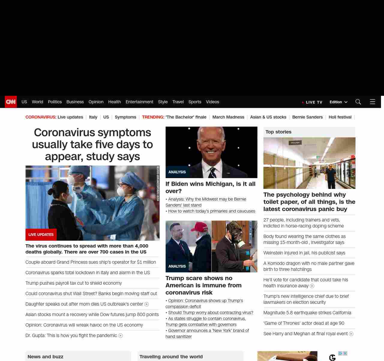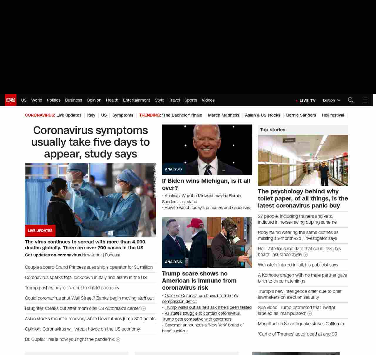 || screaming-banner-text banner-text-size–char-47″ data-analytics=”_list-hierarchical-xs_article_”> Coronavirus symptoms usually take five days to appear, study says ||” , title: “CNN – Breaking News, Latest News and Videos” , siblings: {“articleList”:[{“uri”:”/world/live-news/coronavirus-outbreak-03-10-20-intl-hnk/index.html”,”headline”:”u003cstrong>The virus continues to spread with more than 4,000 deaths globally. There are over 700 cases in the US u003c/strong>”,”thumbnail”:”//cdn.cnn.com/cnnnext/dam/assets/200310021636-coronavirus-beijing-0305-small-11.jpg”,”duration”:””,”description”:””,”layout”:””